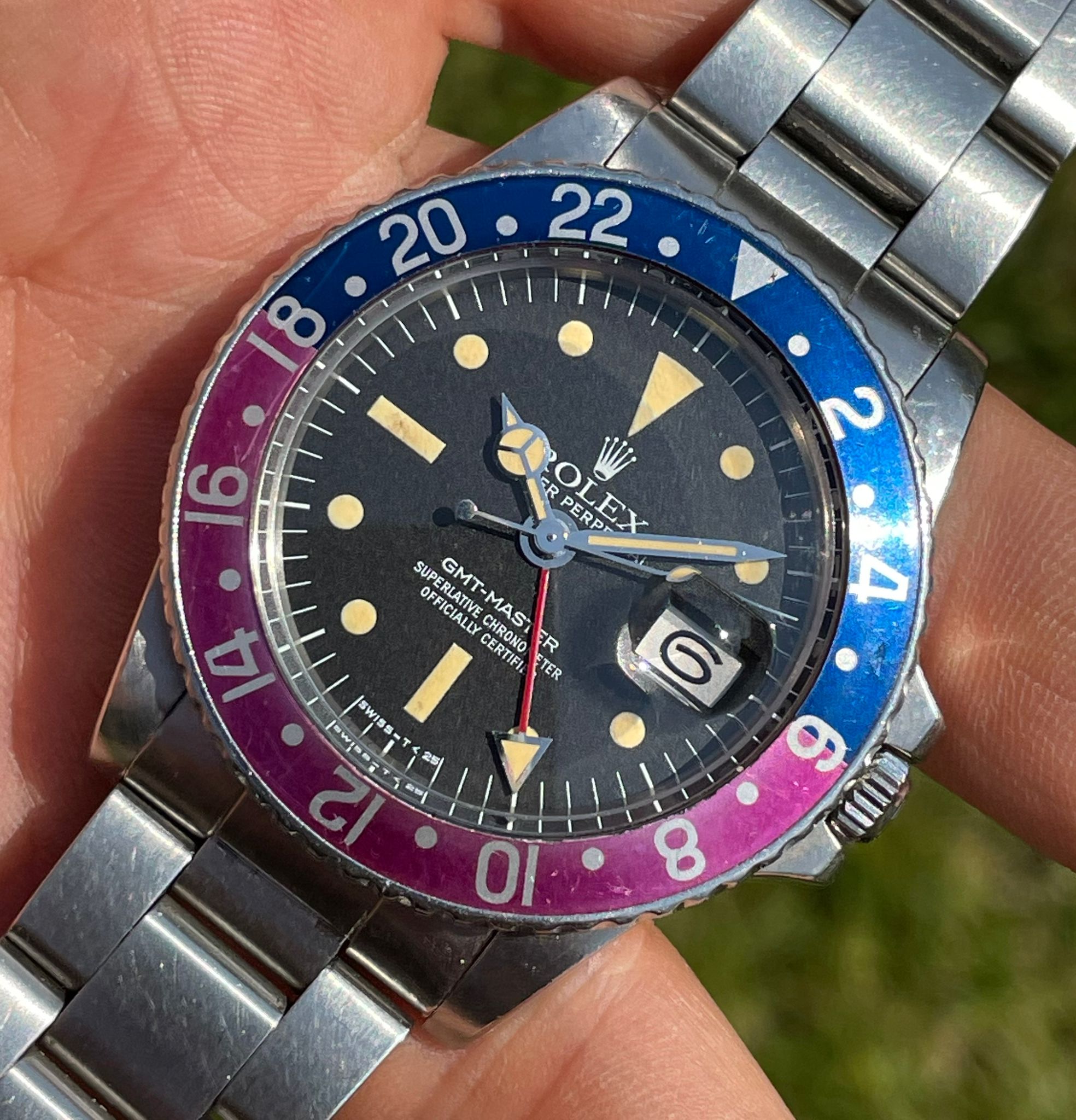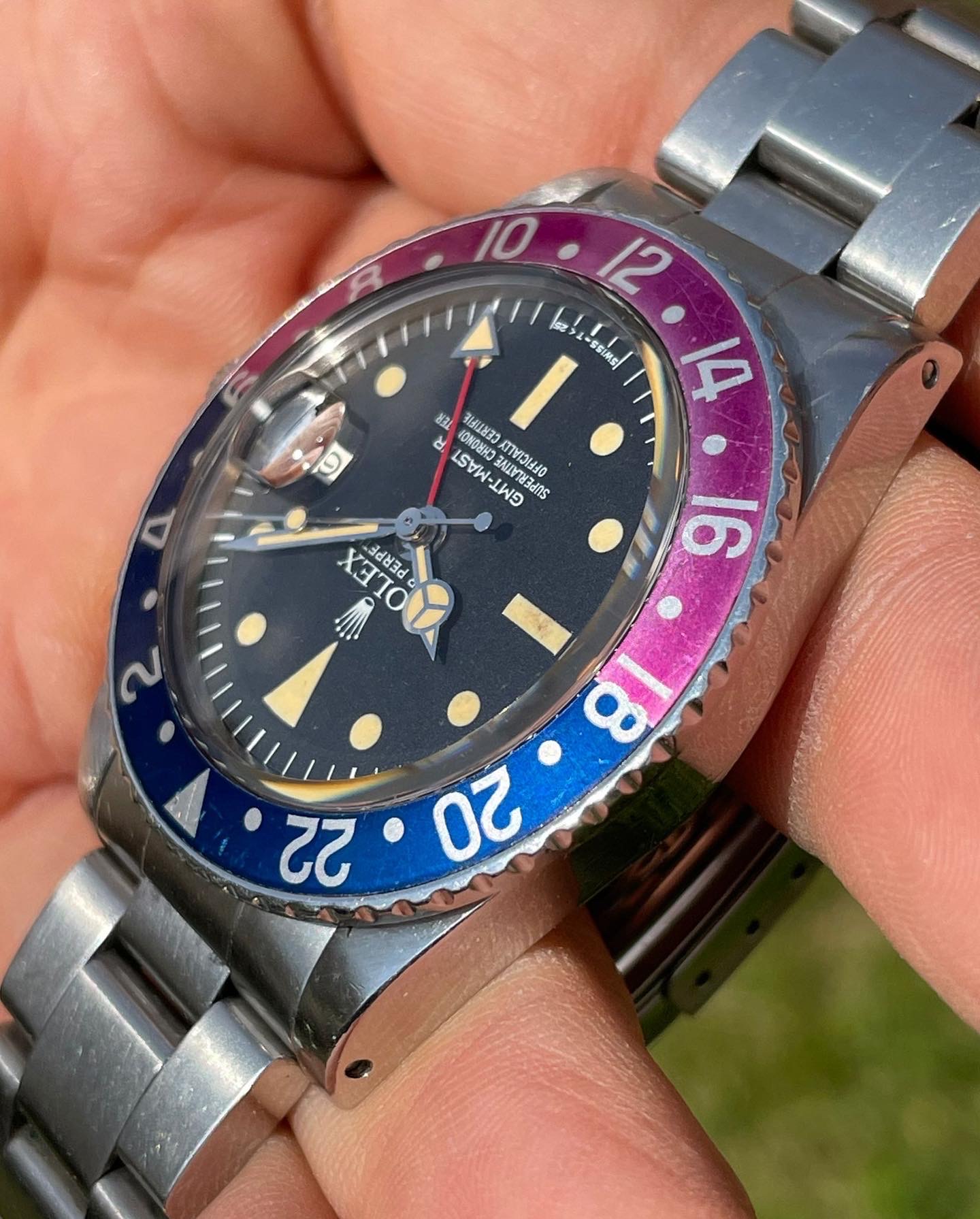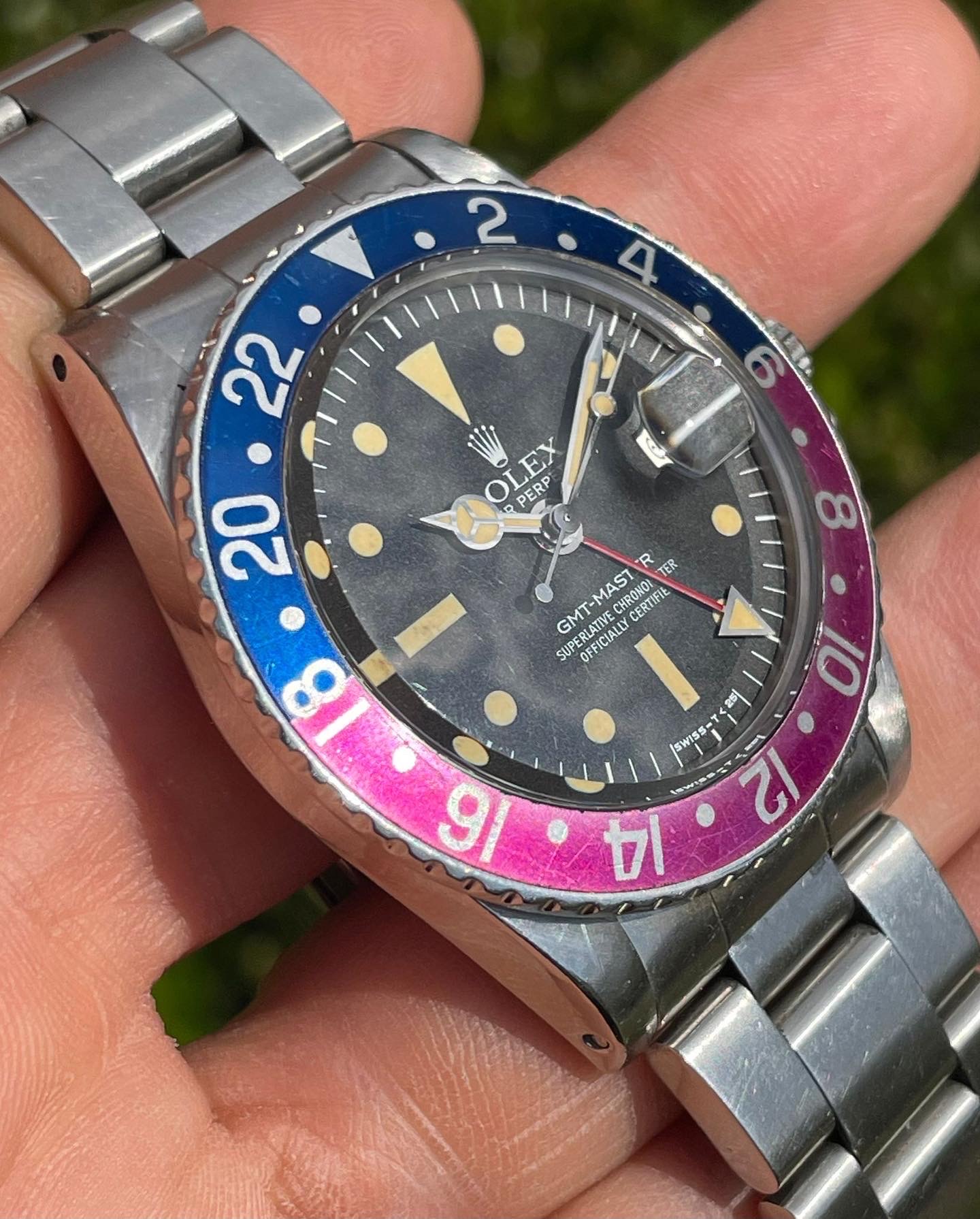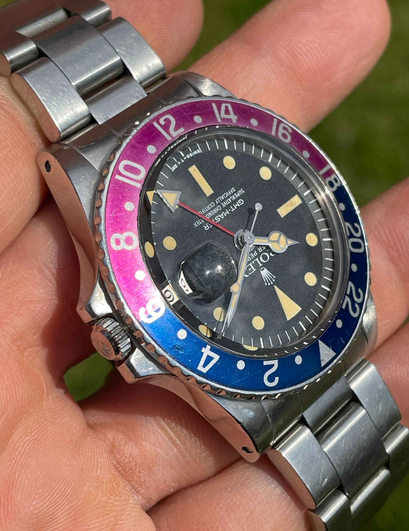 Original Rolex fat font "Pepsi" insert with a stunning fuchsia fading.