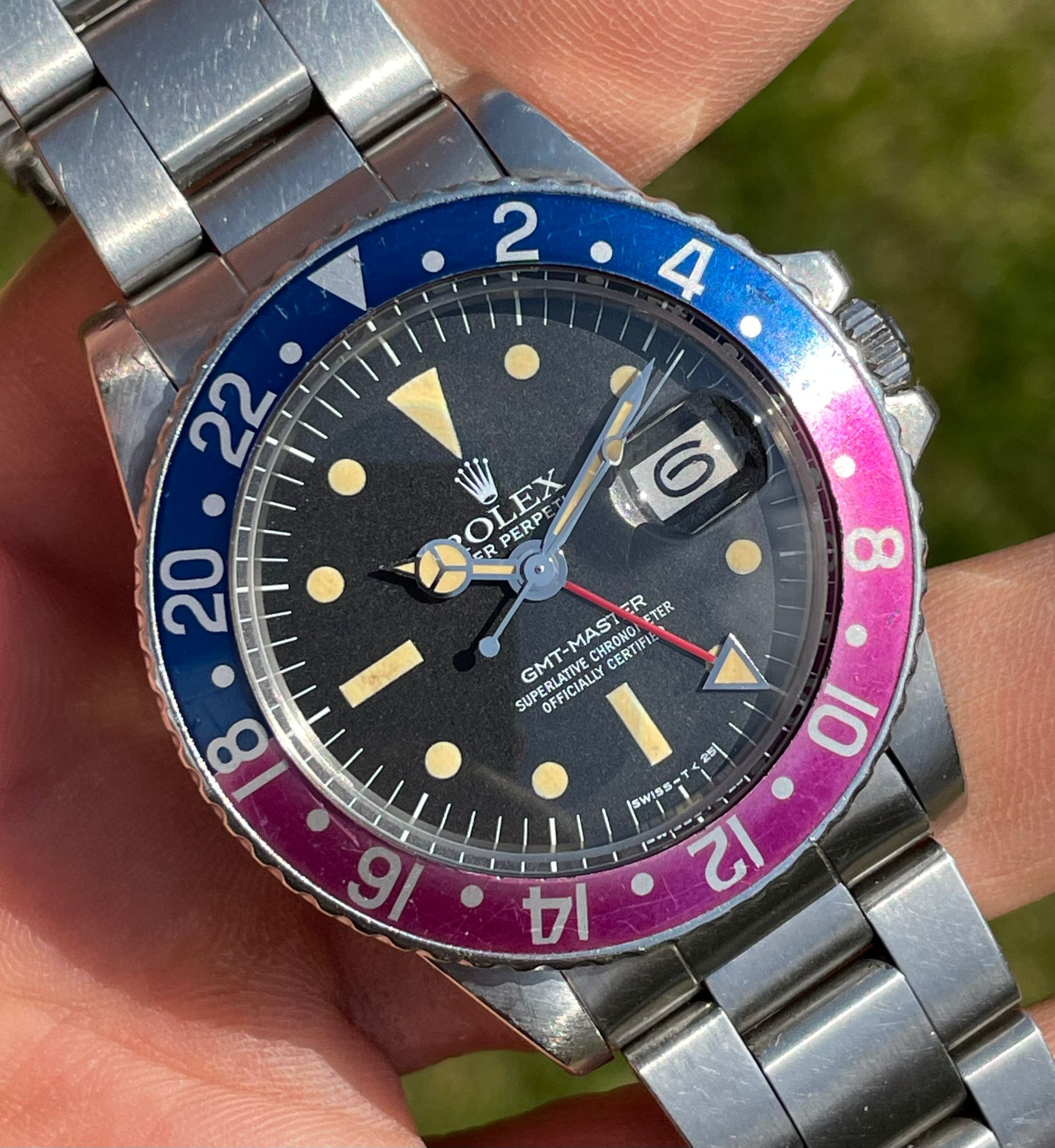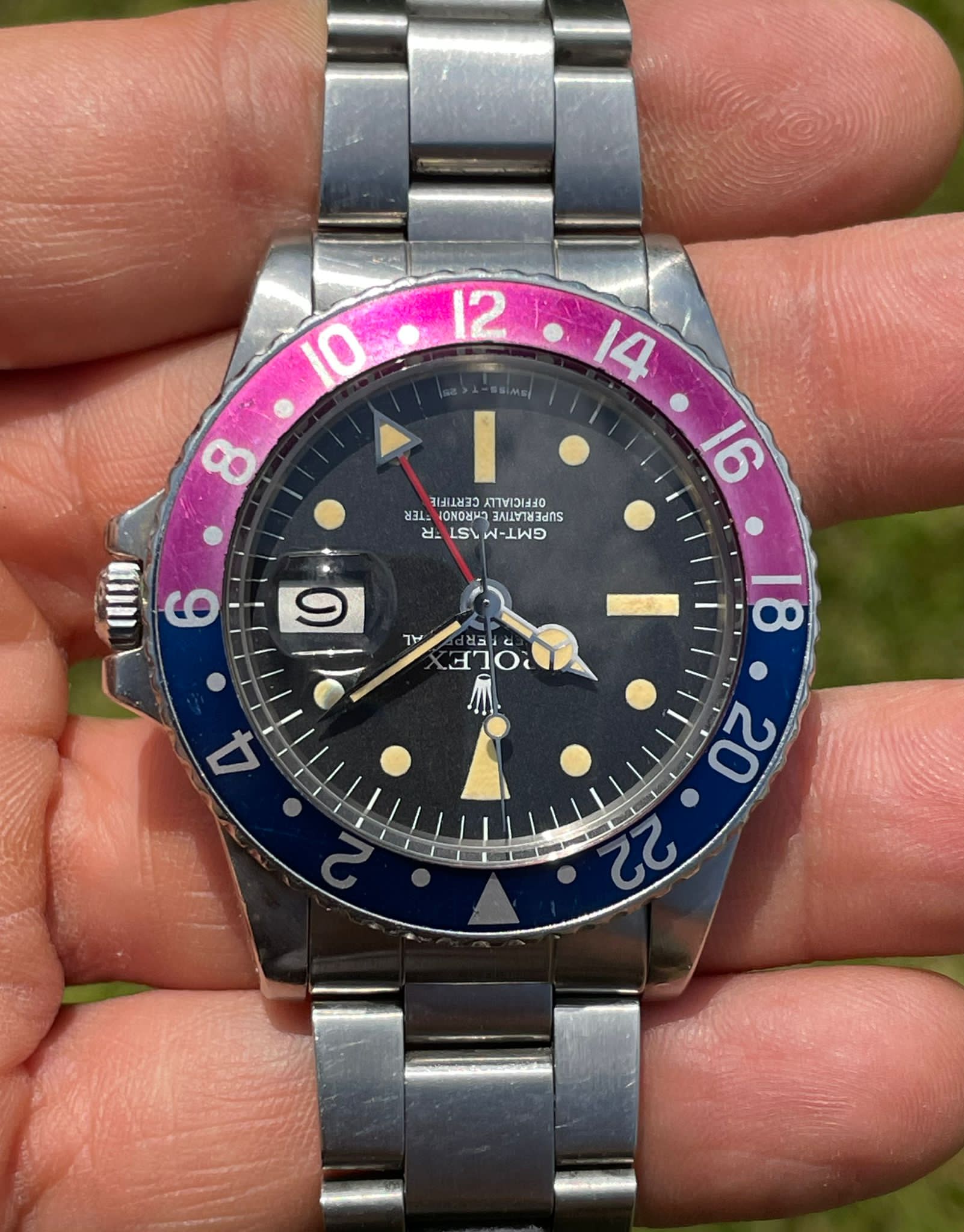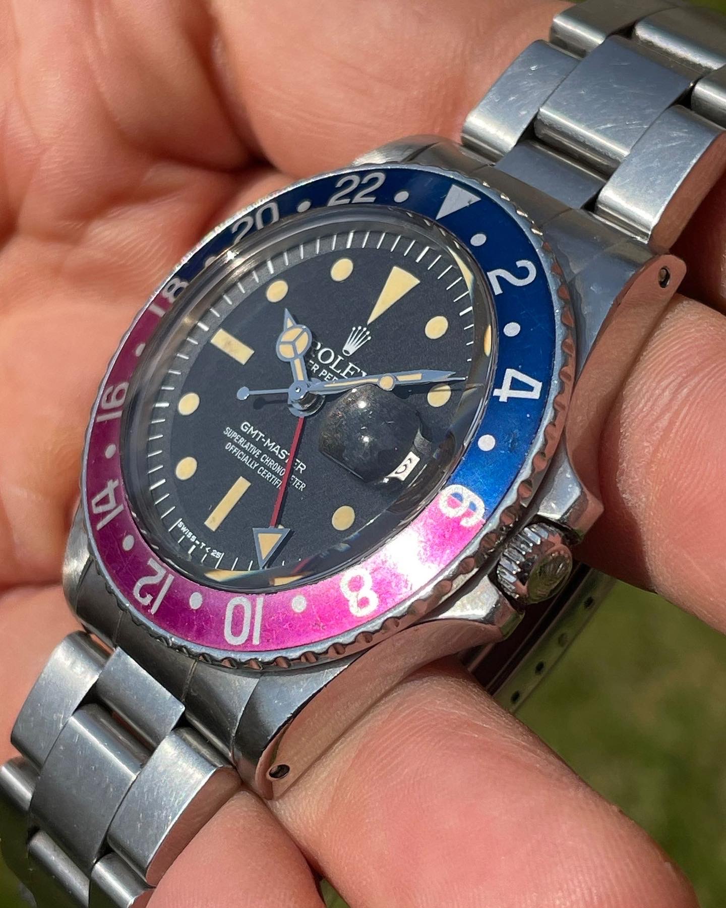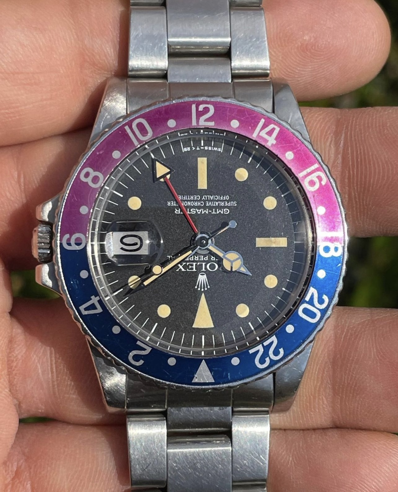 Original Rolex fat font "Pepsi" insert with a stunning fuchsia fading.