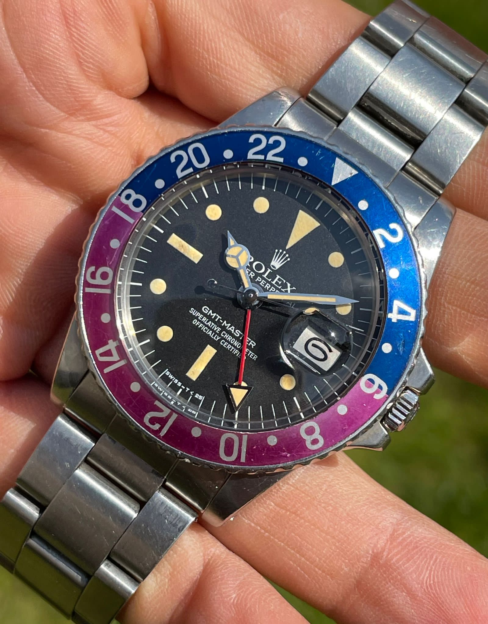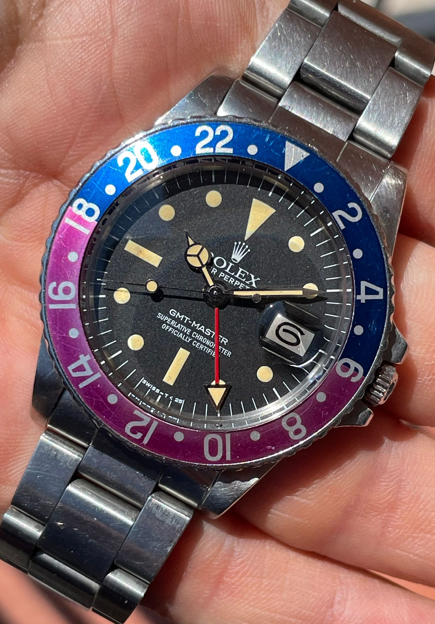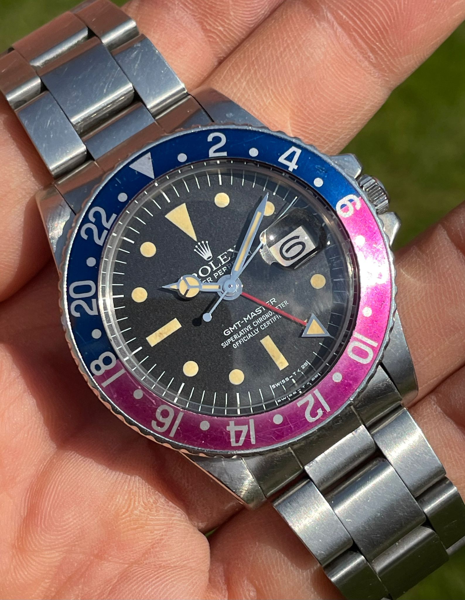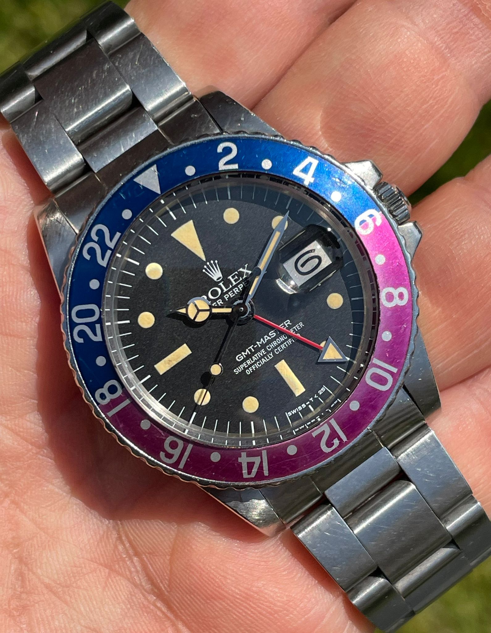 Original Rolex fat font "Pepsi" insert with a stunning fuchsia fading.