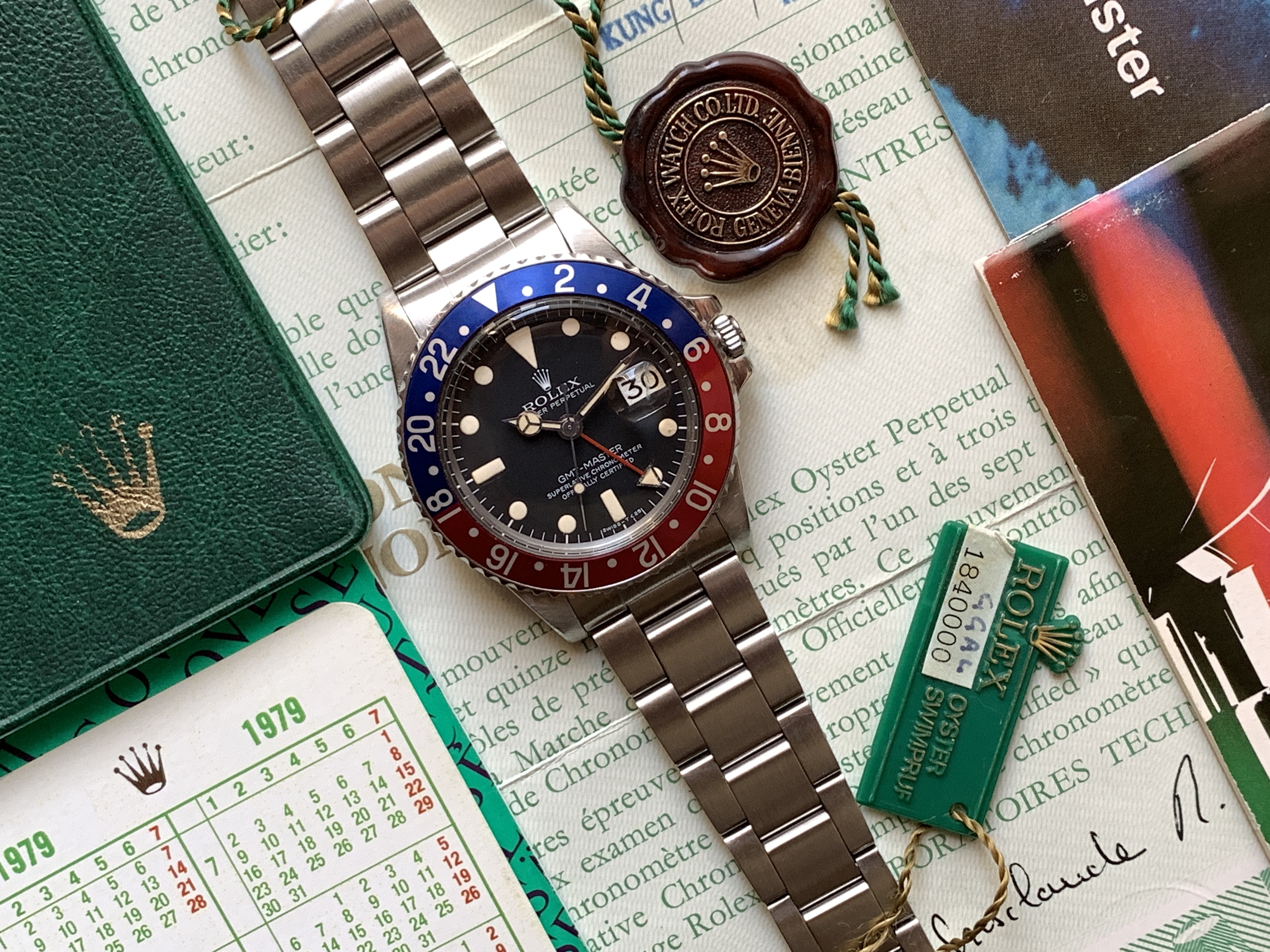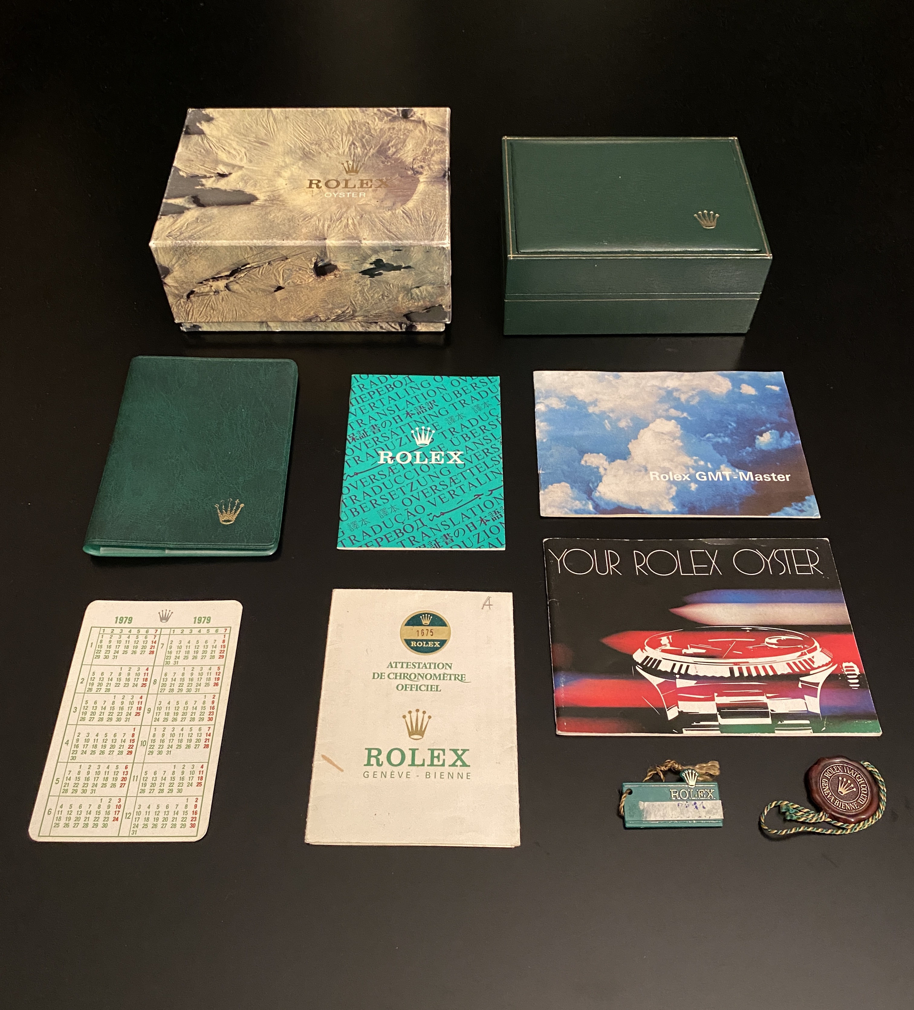 The watch comes with the complete full set: original Rolex box (inner/outer), the Rolex warranty certificate (punched papers), the Rolex warranty holder, the Rolex calendar, the Rolex booklets ('Your Rolex Oyster' and 'Rolex Gmt-Master'), the Rolex tag.