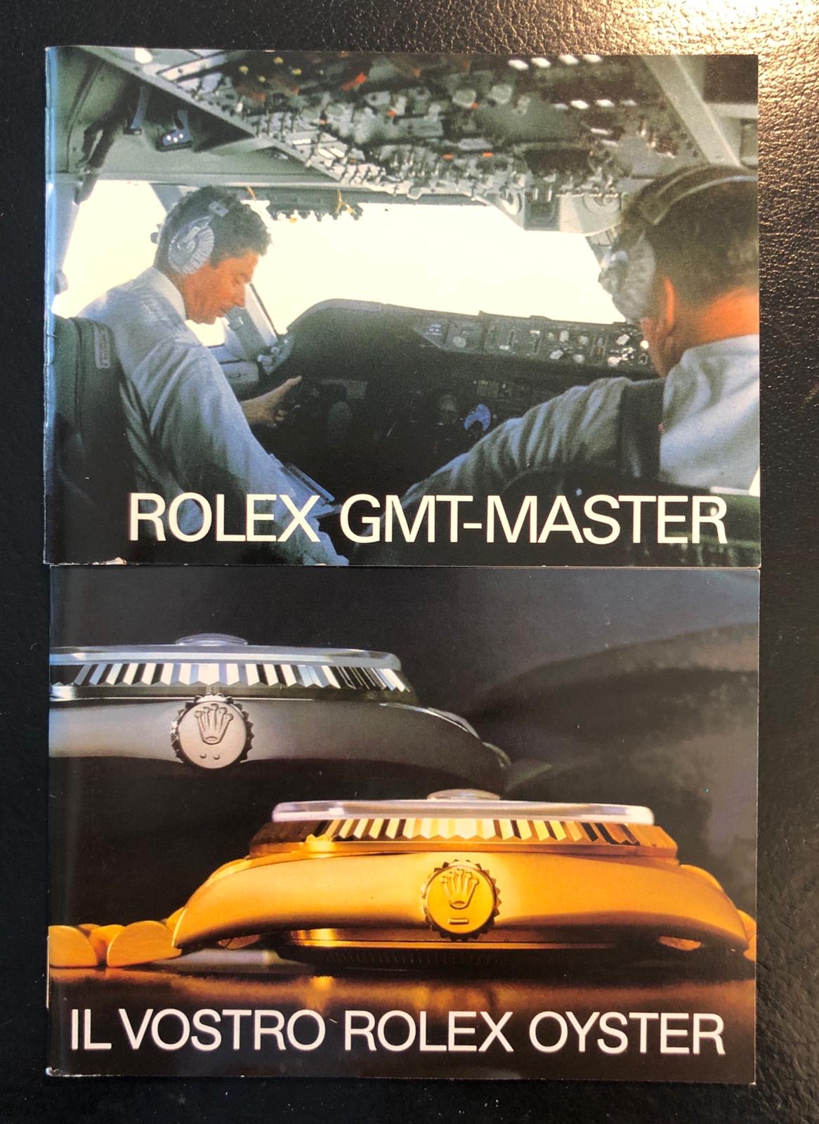 The watch comes with the full set: the original Rolex box (inner/outer) with sticker, the Rolex warranty certificate (punched papers), the Rolex warranty holder (green folder), the Rolex calendar, the Rolex booklets ('Your Rolex Oyster' 'GMT Master'), Rolex tags.