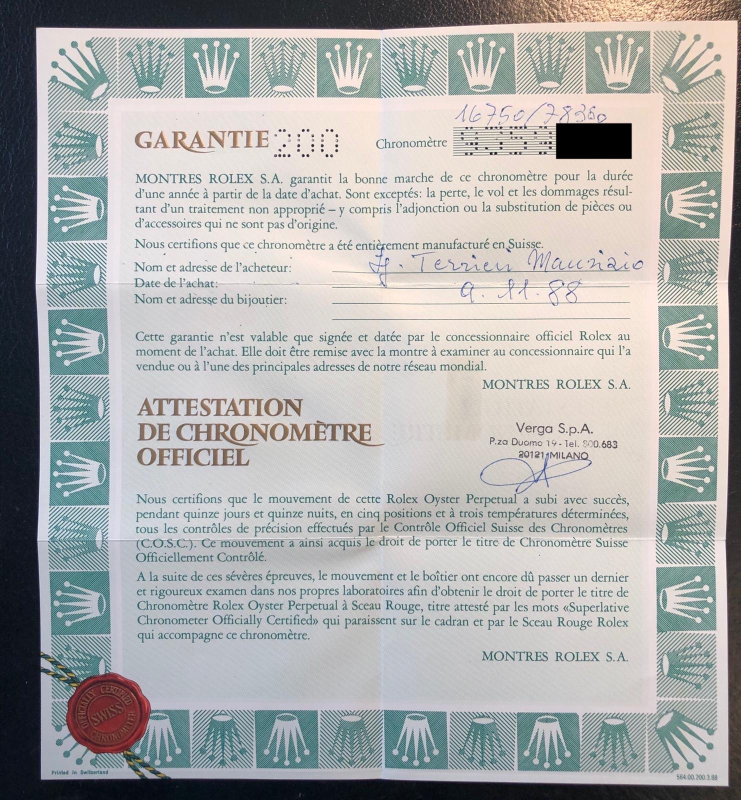 The watch was purchased at the historical Rolex AD 'Orologeria Luigi Verga' in Milan in 1988 and I got it directly from the first owner.