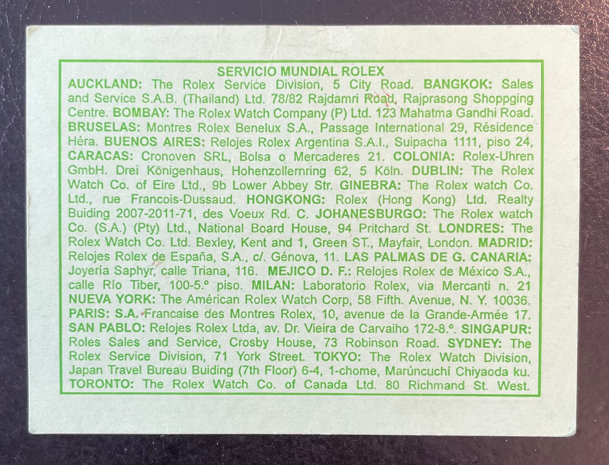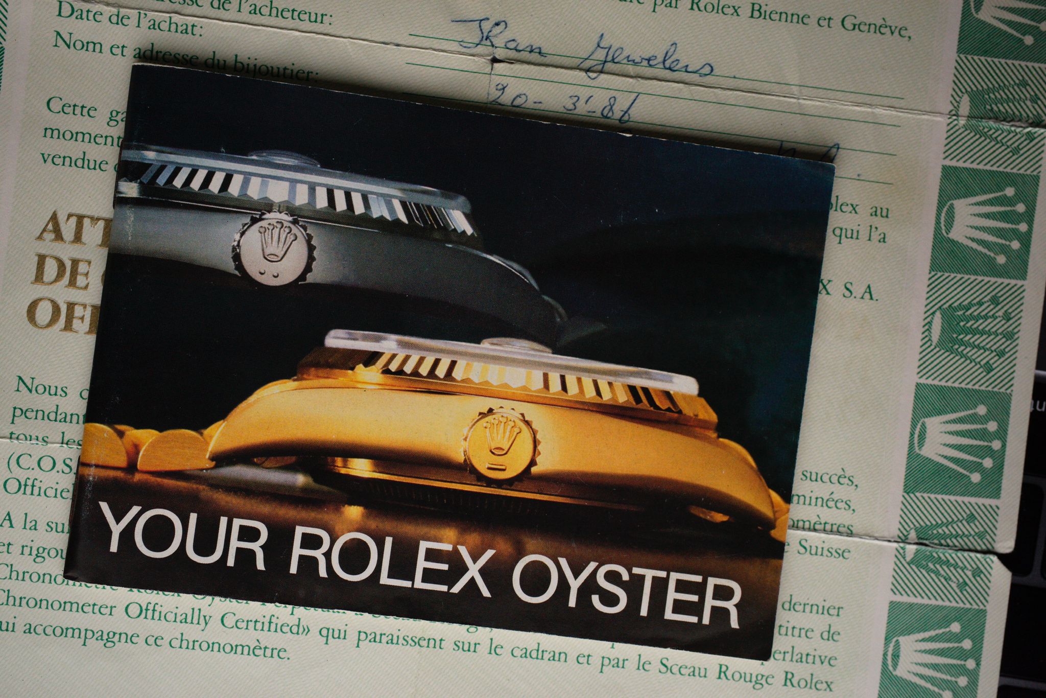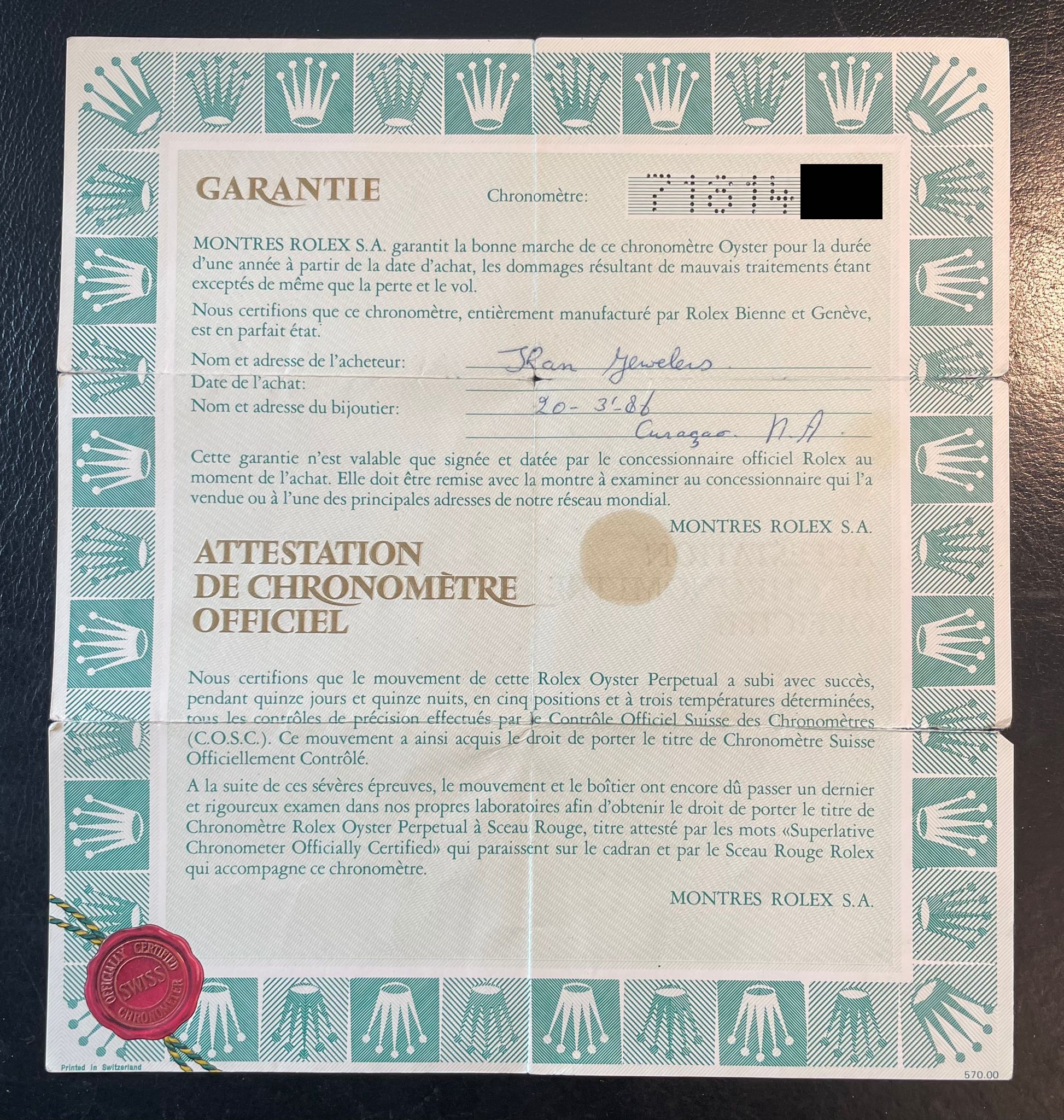 The watch was purchased in Curaçao at 'Gandelman Jewelers' and it comes with the complete full set, including the original Rolex guarantee and the Rolex service papers.