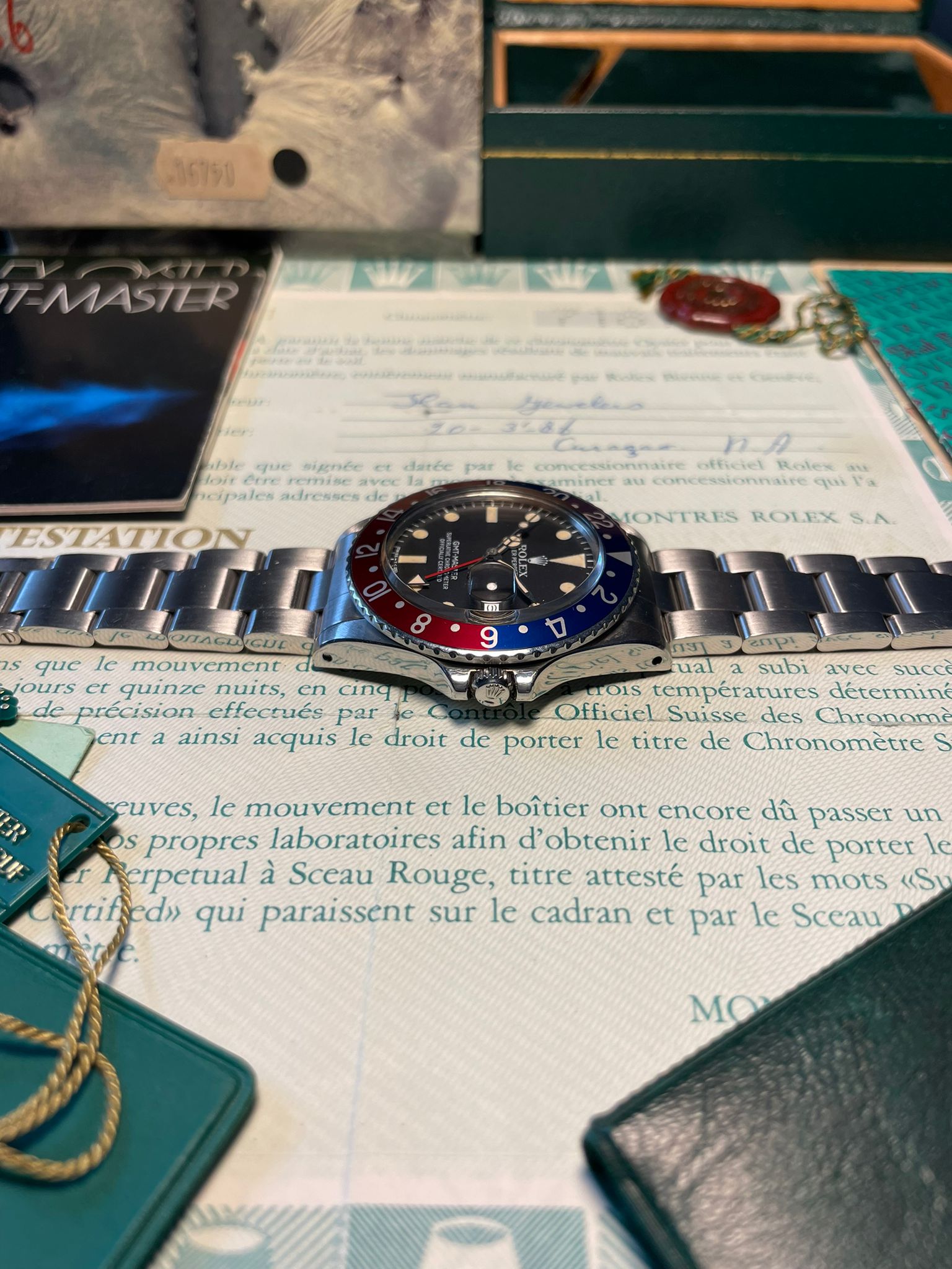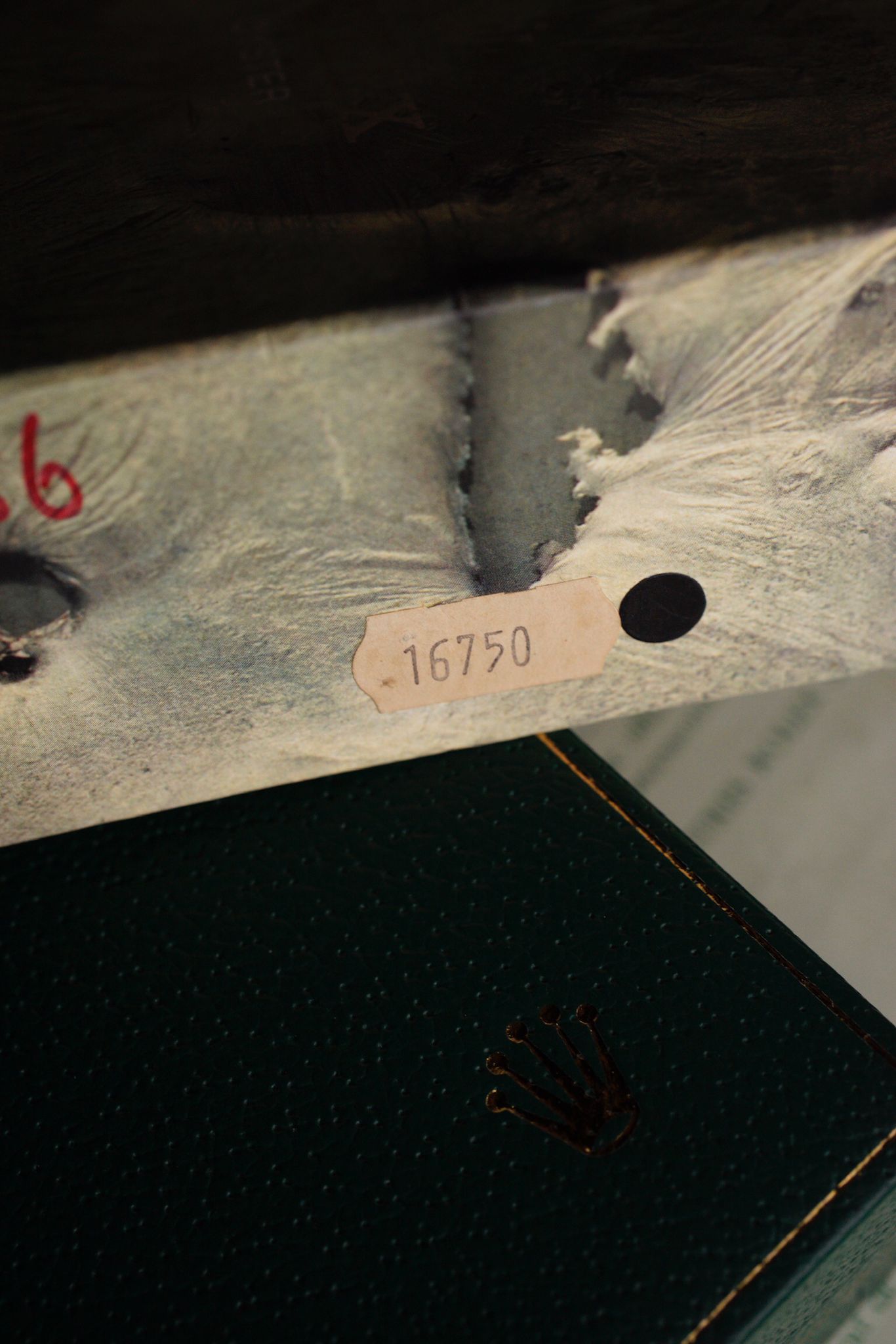 The watch comes with the full set: the original Rolex box (inner/outer) with "ref.16750" sticker, the Rolex warranty certificate (punched papers), the Rolex warranty holder (green folder), the Rolex calendar, the Rolex booklets ('Your Rolex Oyster' 'GMT Master'), Rolex GMT price tag, Rolex tag, Rolex service papers, Rolex pochette.