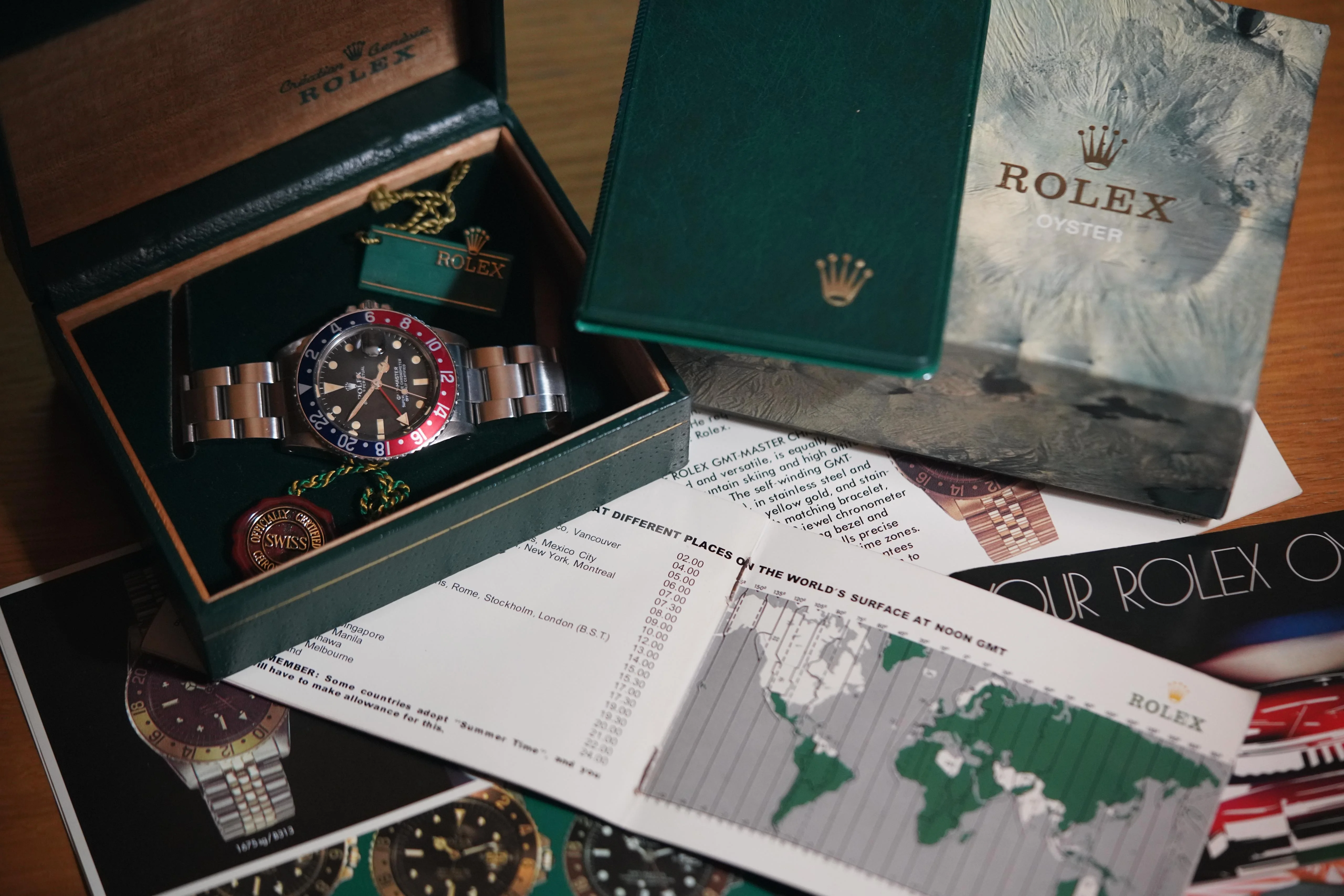 The watch comes with the full set except for the warranty certificate: the original Rolex box (inner/outer), the Rolex warranty holder (green folder), the Rolex calendar, the Rolex booklets ('Your Rolex Oyster', 'GMT Master'), Rolex tags.