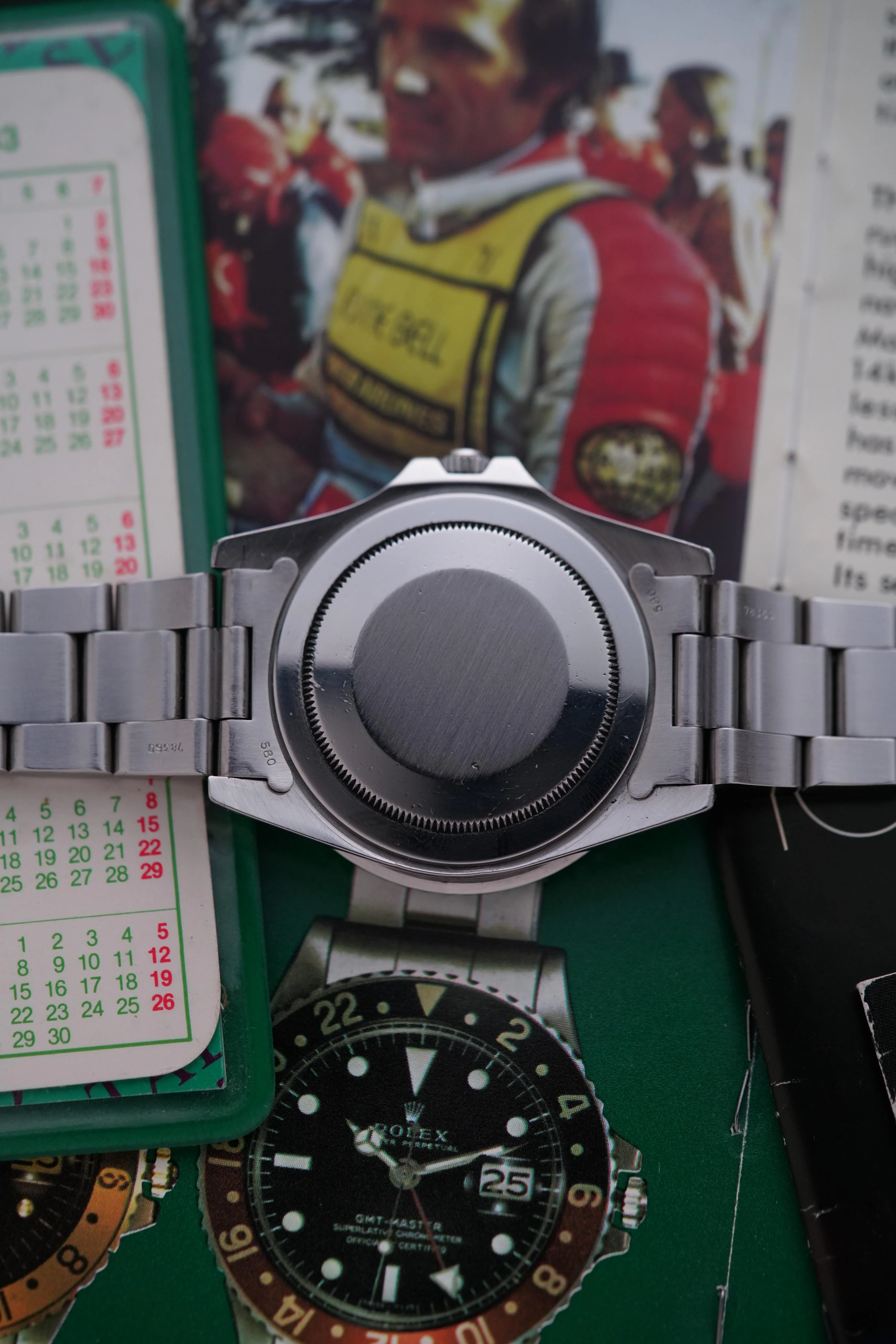 Further, this example comes with its original set: Rolex inner and outer box, guarantee holder with serial tag, ‘Oyster’ and ‘GMT Master’ instruction booklets, translation booklet, both swing tags and calendar card.