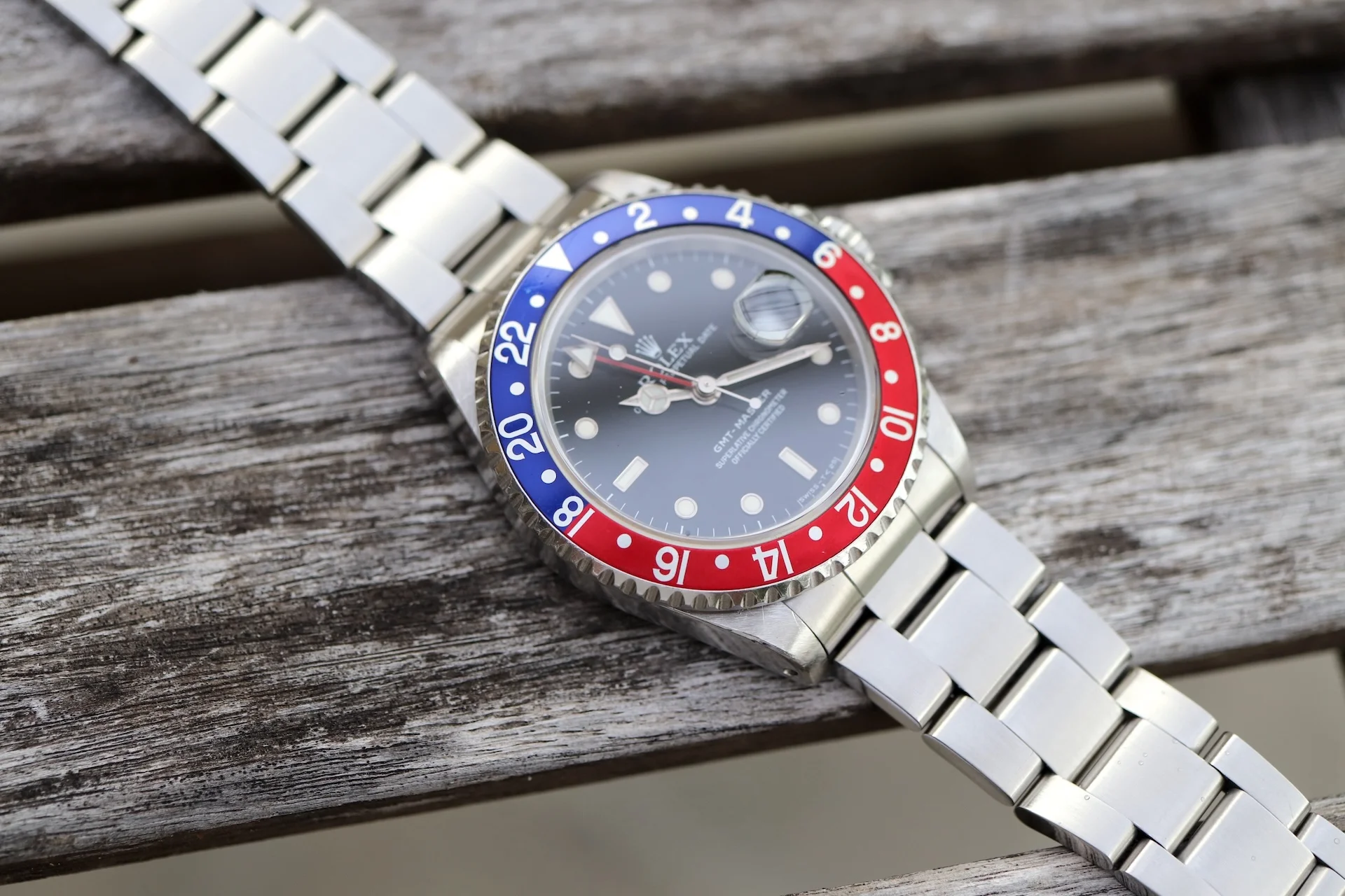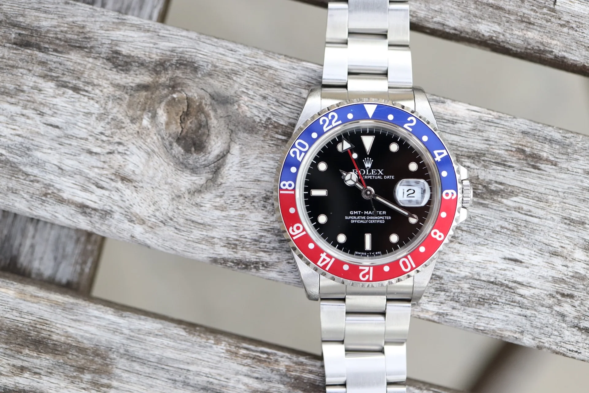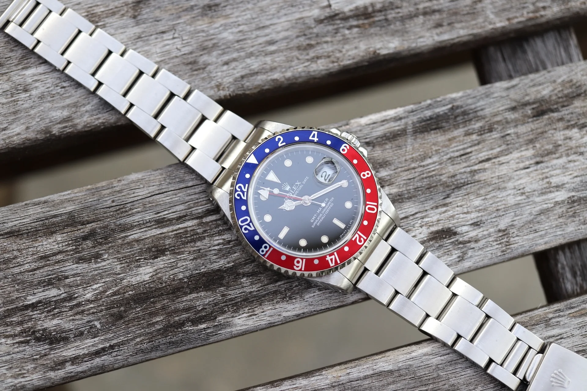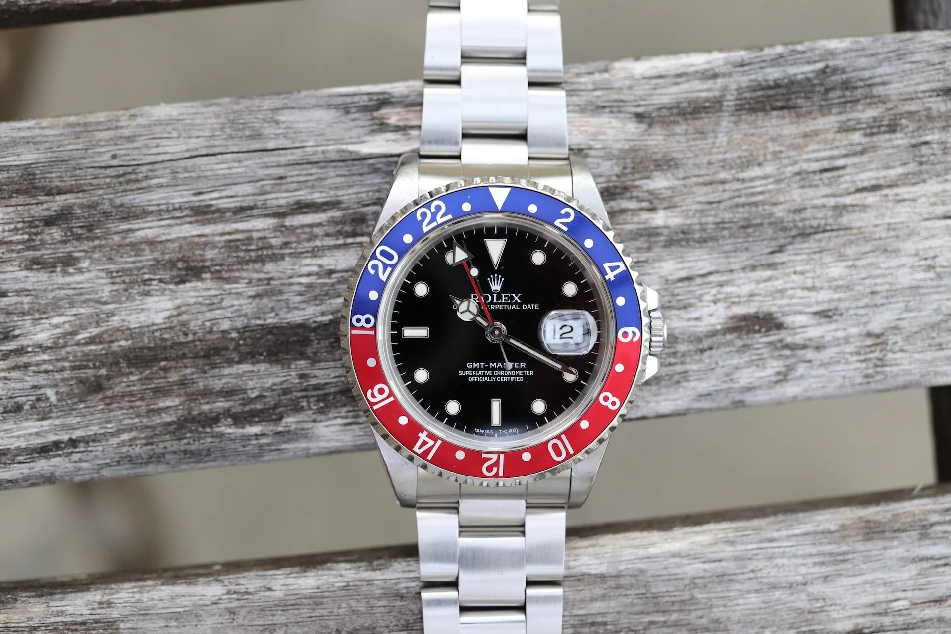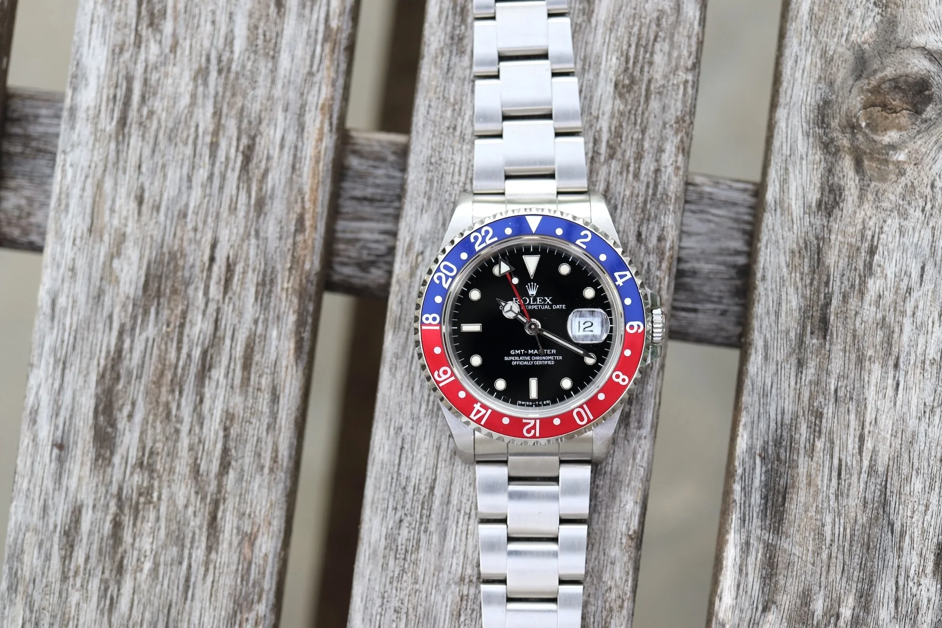 ·I have for sale a Rolex GMT Master Reference 16700, equipped with the Rolex 3175 Movement. The case measures 40mm without the crown. It has an E serial number dating back to 1990. The watch is working well, and all functions are working correctly. The watch was just serviced, and it comes with a 1-year warranty. It's an original bracelet and is full-length with 12 links. The watch has a beautiful, rich, creamy colour patina.