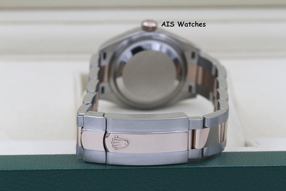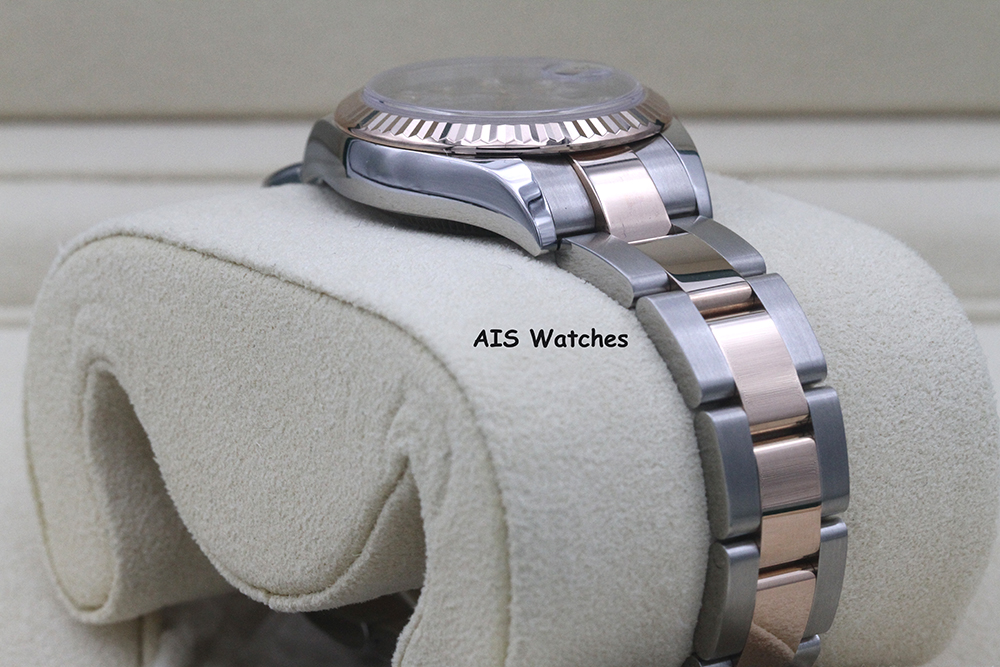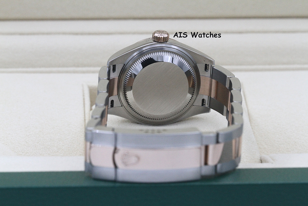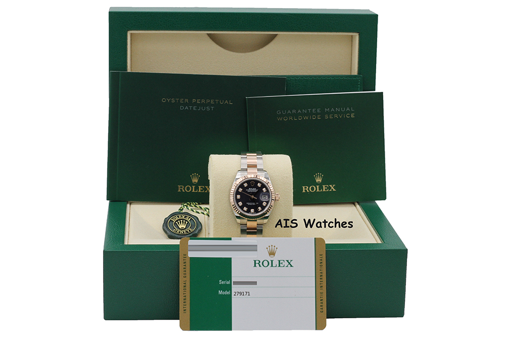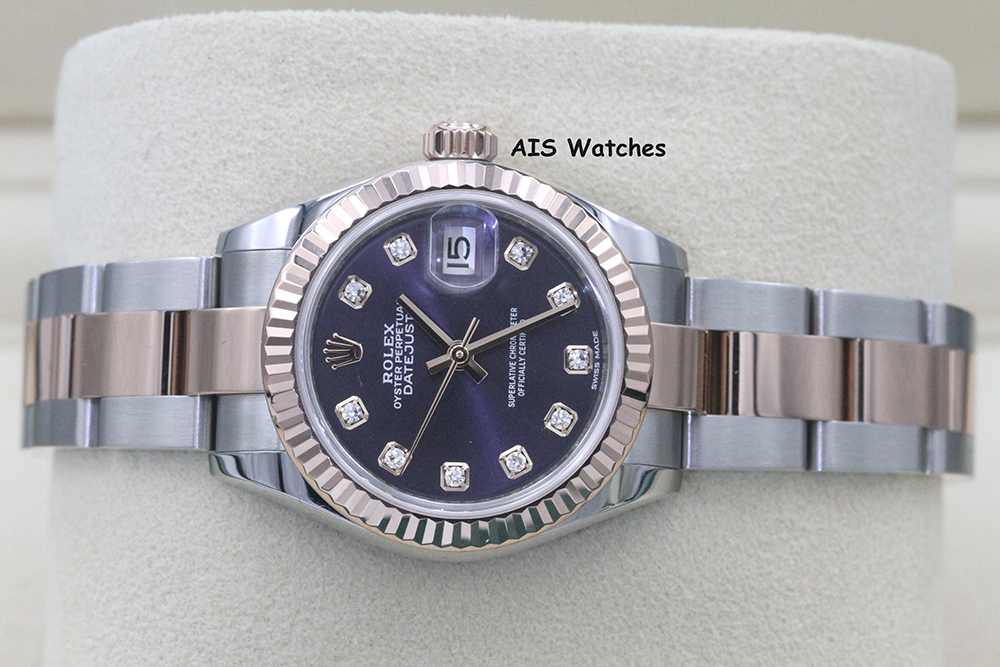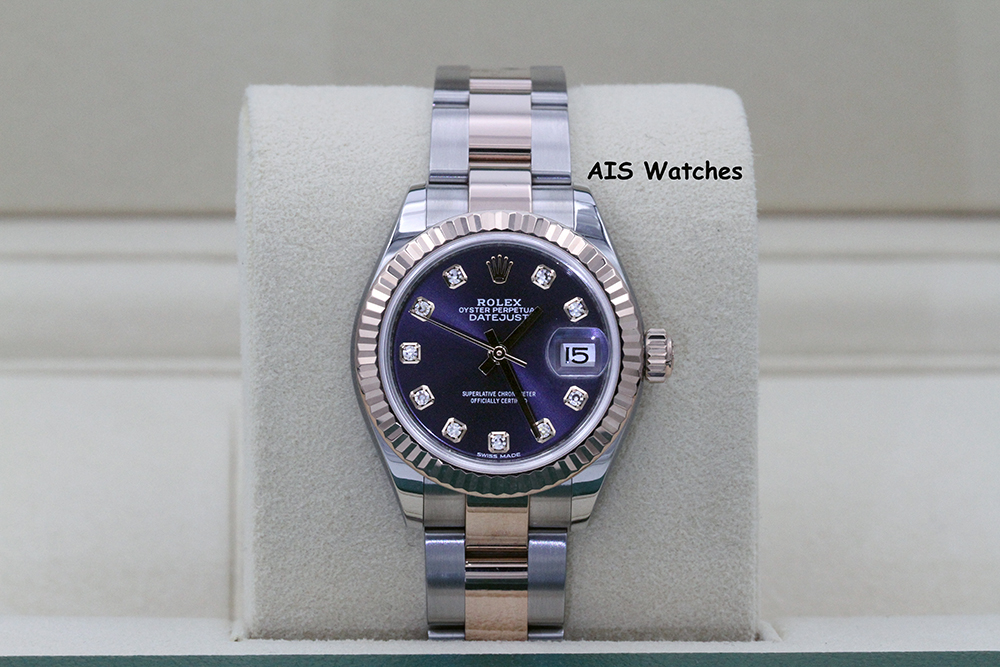 Up for sale is a Rolex Ladies DateJust 279171 Aubergine Diamond Dial 28MM 18K RG/SS Oyster Box & Papers The timepiece is in excellent condition.