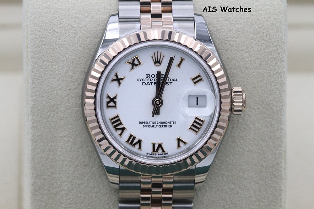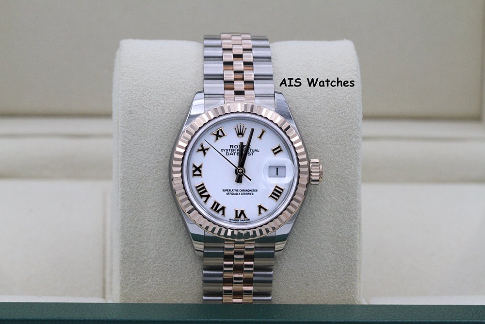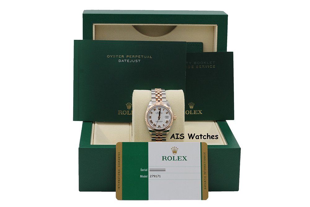 Up for sale is a Rolex Ladies DateJust 279171 White Roman Dial 28MM 18K RG/SS Jubilee Box & Papers The timepiece is in excellent condition.