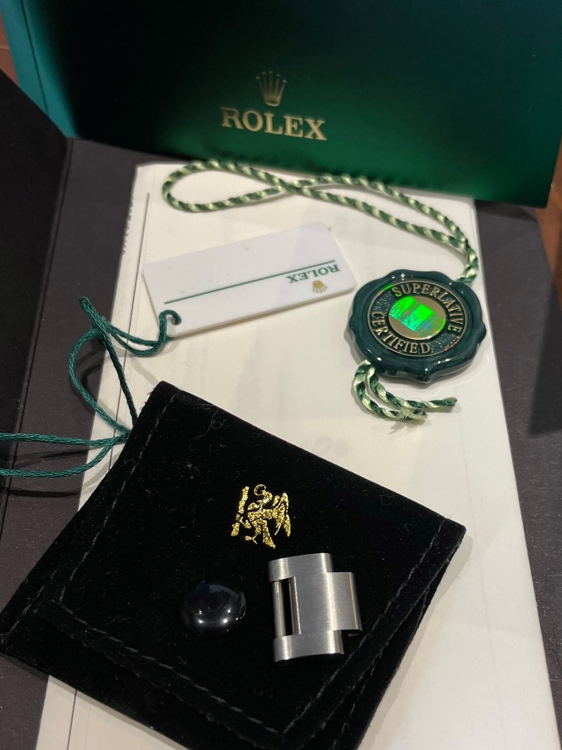 Fully original one owner watch comes with inner/ outer box and sleeve, tags, extra link, booklet, service manual and guarantee card.