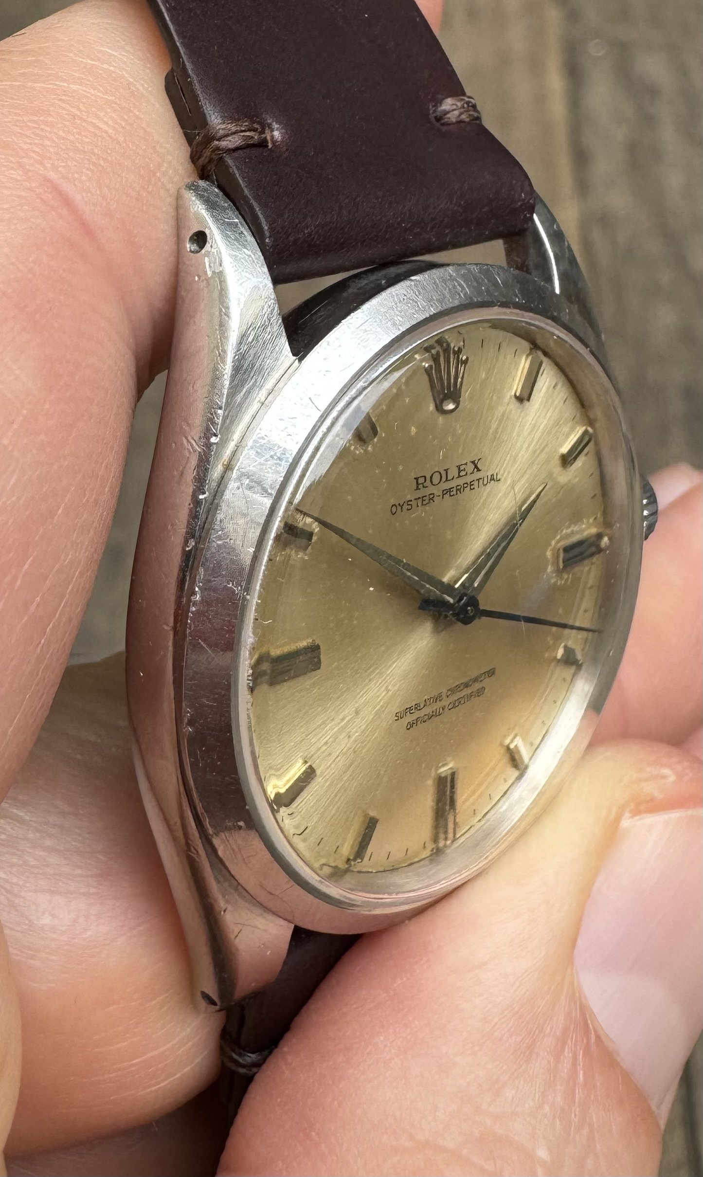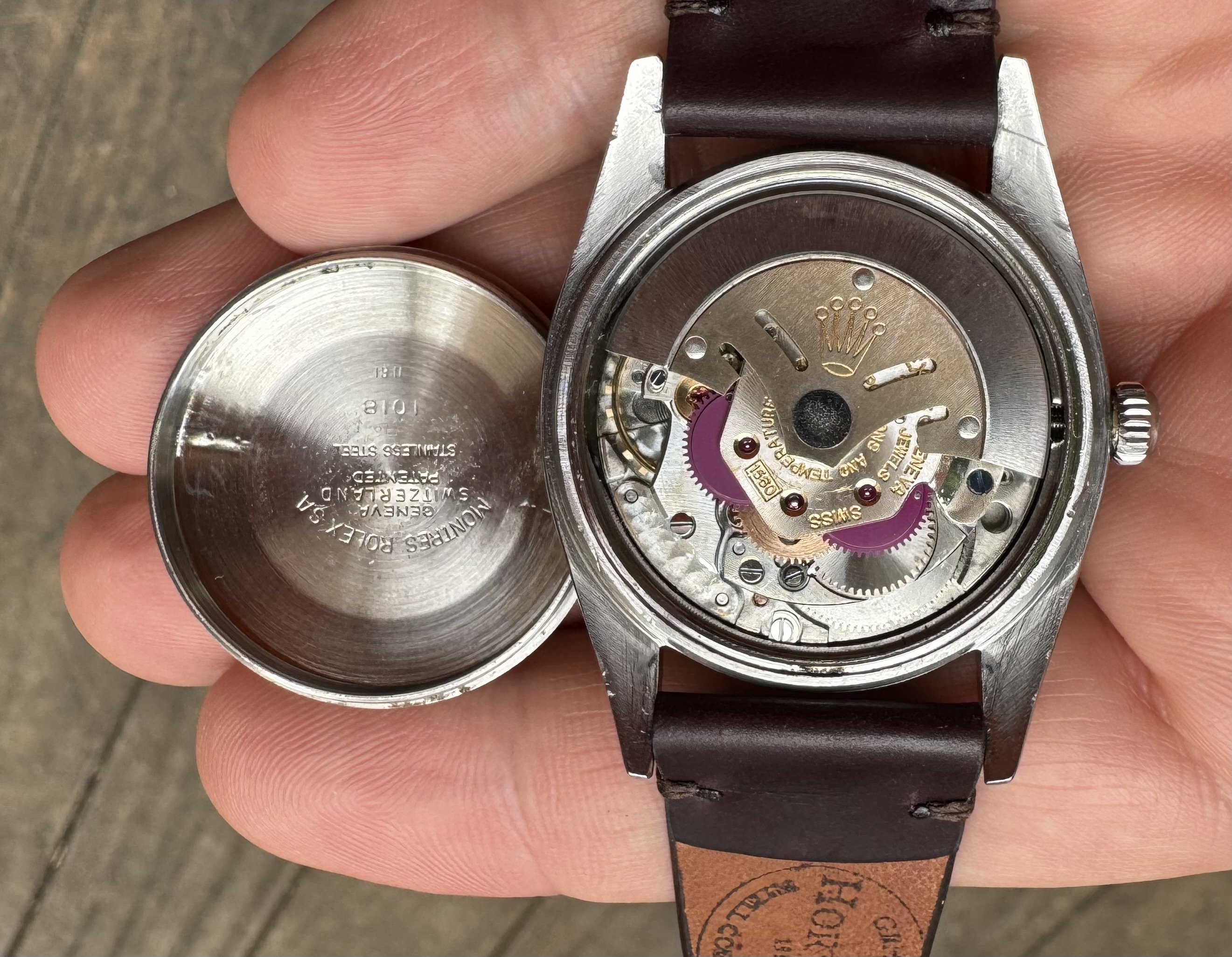 caseback : the « weaker part ». Stamped II.61. It had been butchered when I got it by someone who didn’t have the tools to open it and made 2 big cuts. So I had it laser welded (only case I would ever consider this…) and repolished. It looks fine but not as original condition as the rest