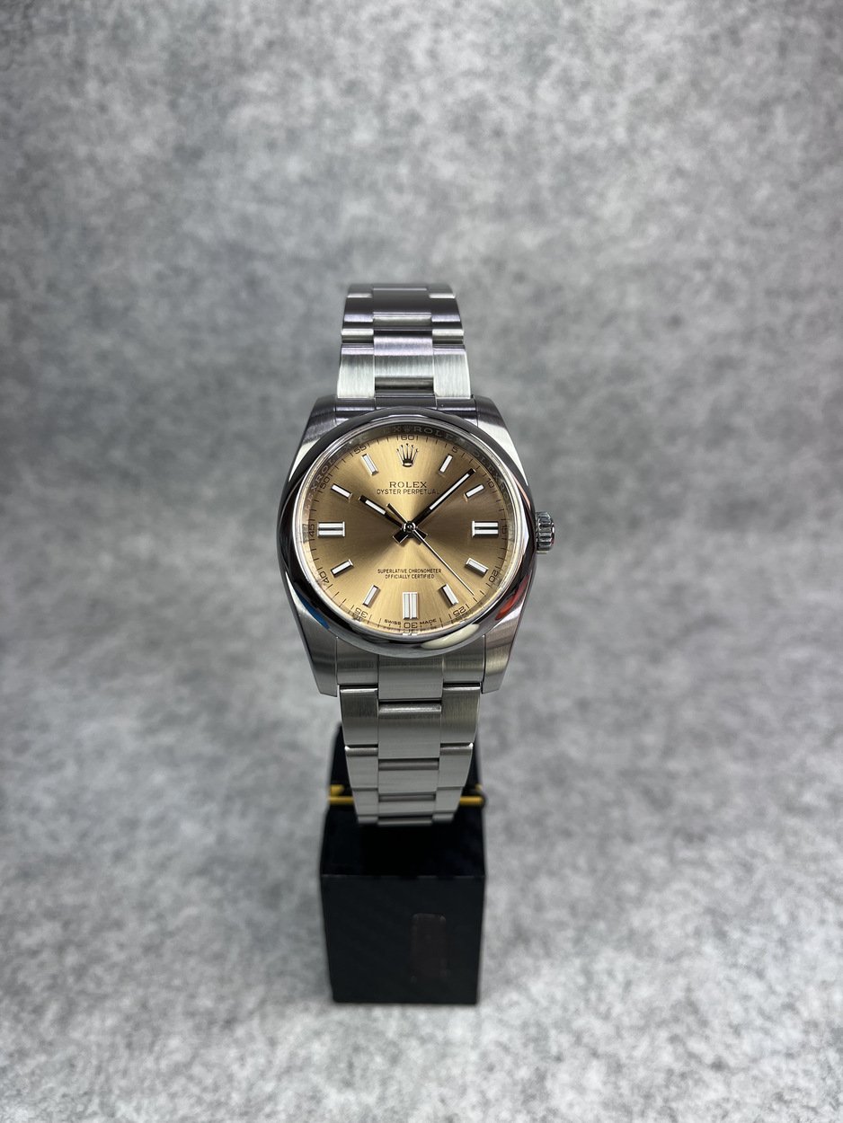 I have a 2016 Rolex Oyster Perpetual 116000, 36mm in White Grape dial. Selling for only £5,950 or best offer. The watch is in excellent cosmetic and functional quality. Worn minimally and taken good care of. It comes complete with outer card box, Rolex plastic box, watch cushion, factory warranty card and manuals. Watch is in excellent condition with minimal hair line marks. The watch has been kept in my tough, watertight, dustproof, pressure equalised PELI 1450 watch case (not included) in a temperature controlled room and opened once a month to give the movement a full wind.