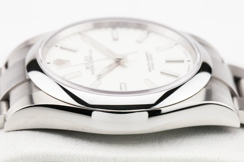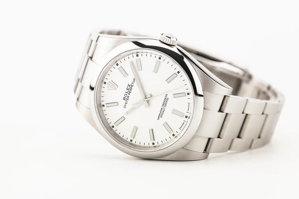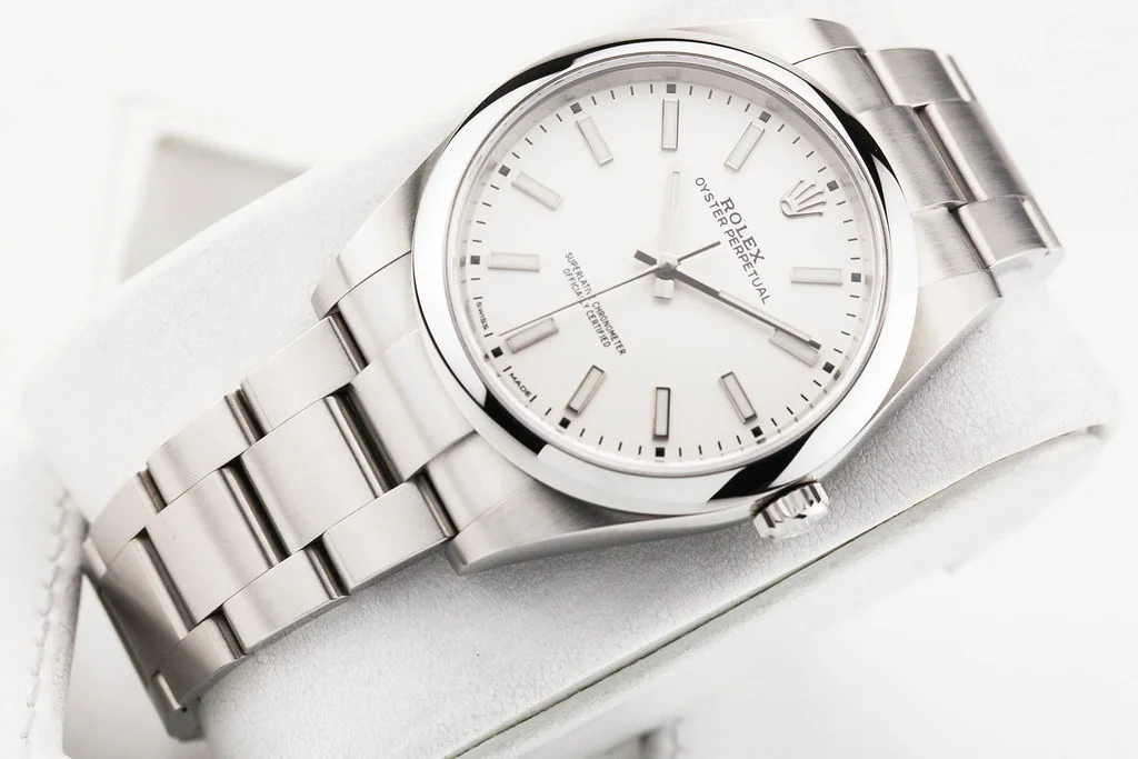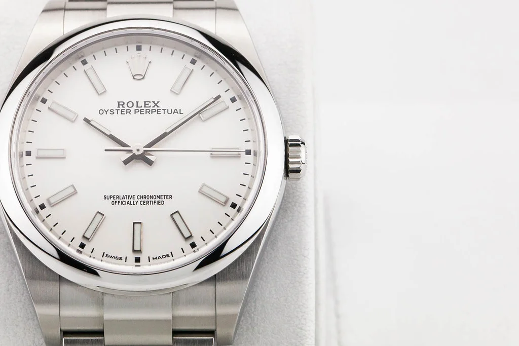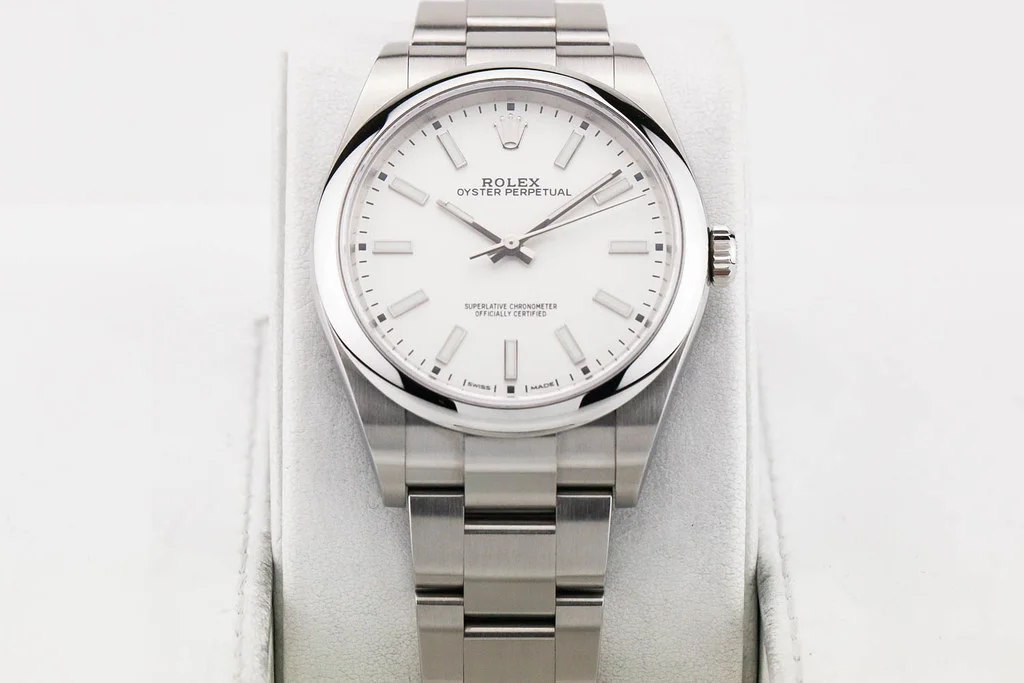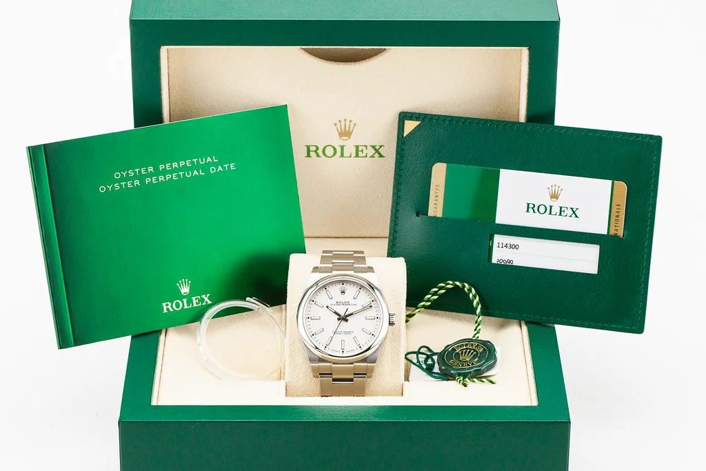 ·Up for sale is an excellent condition Rolex Oyster Perpetual 39 with White Dial, reference # 114300. It comes complete with all boxes, papers, booklets, hang tags, bezel guard and Rolex Warranty Card dated August 2019.