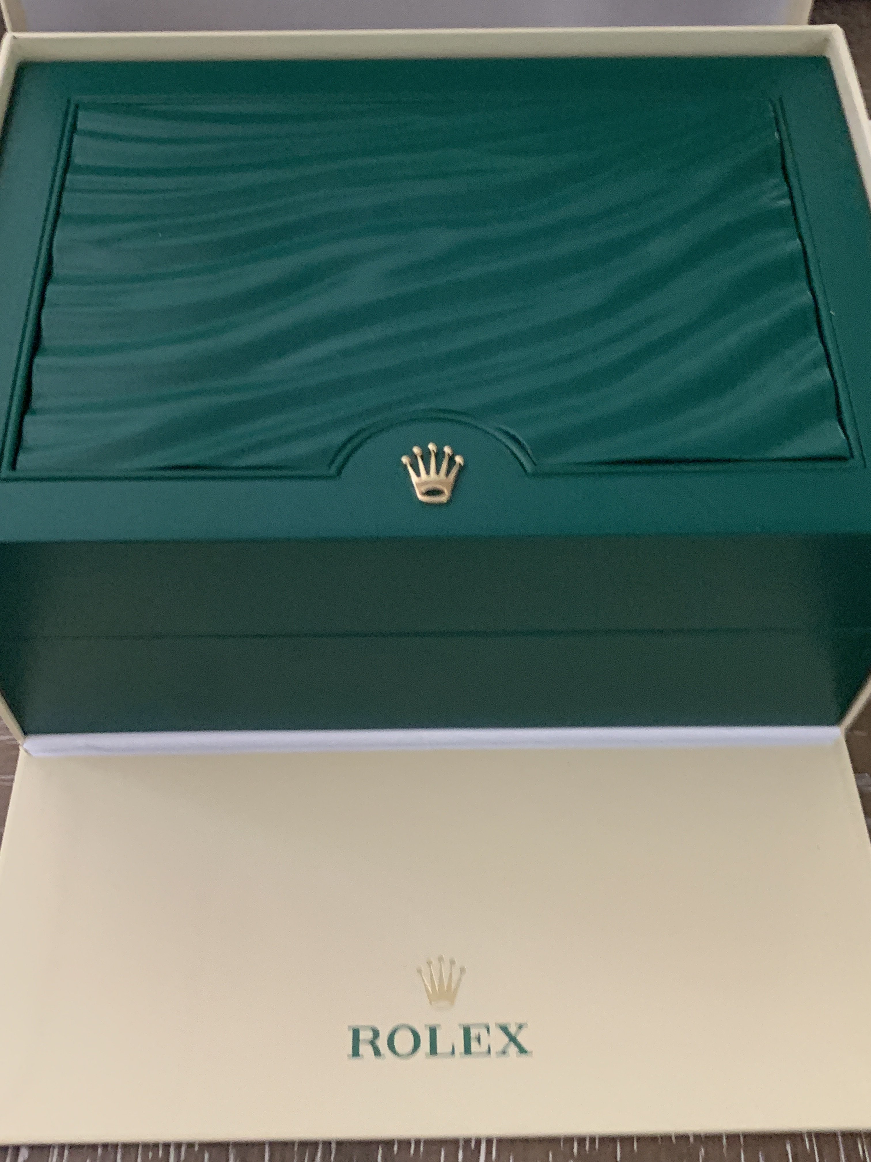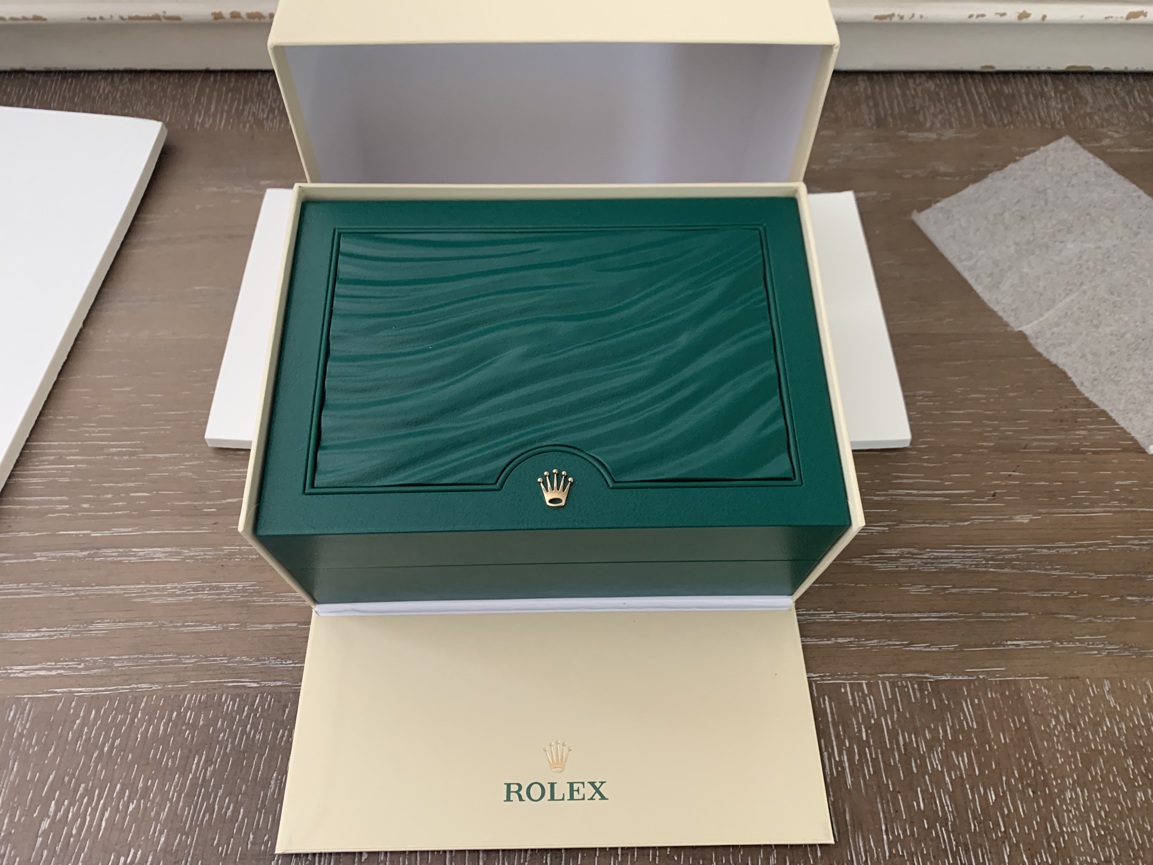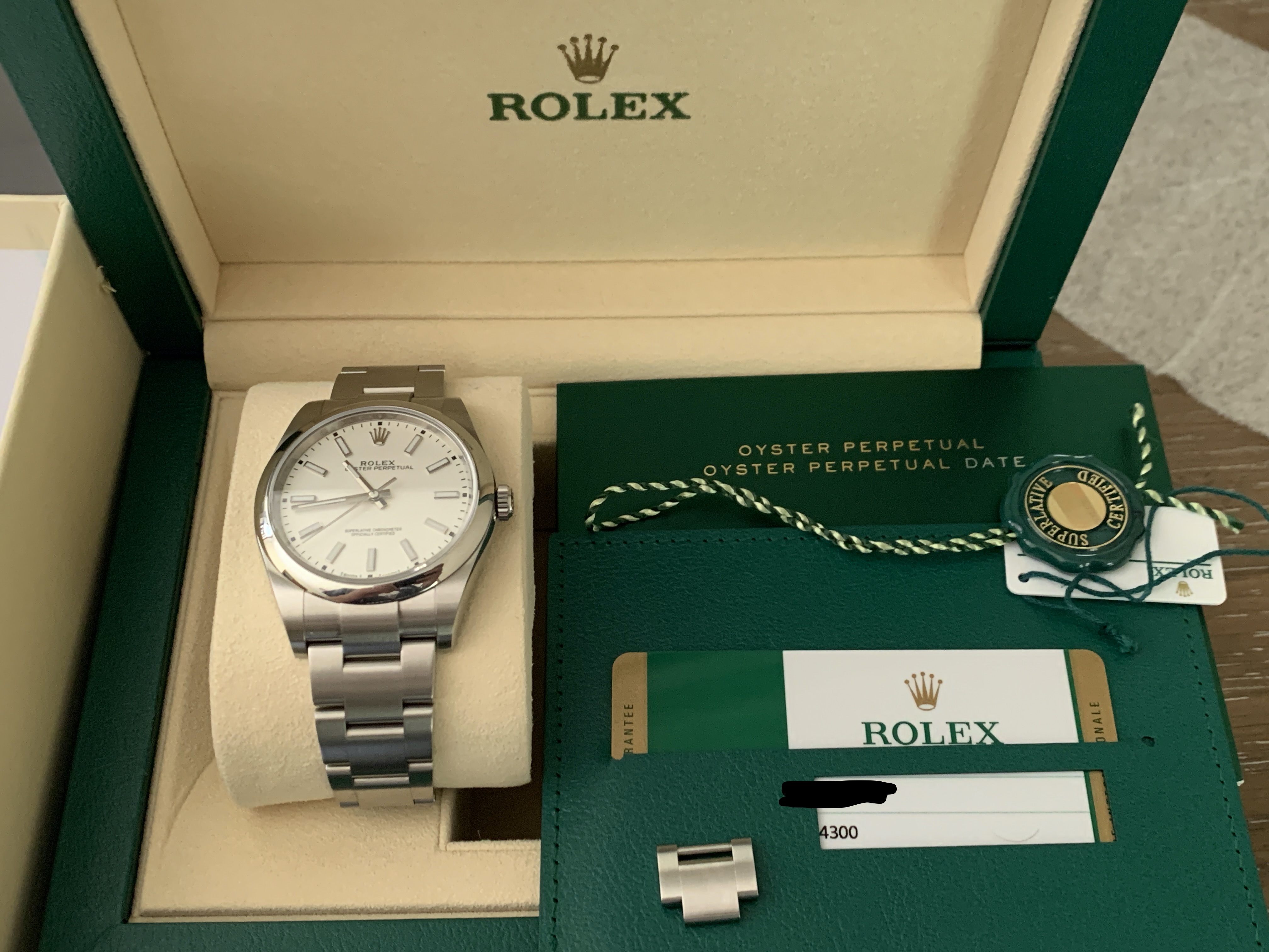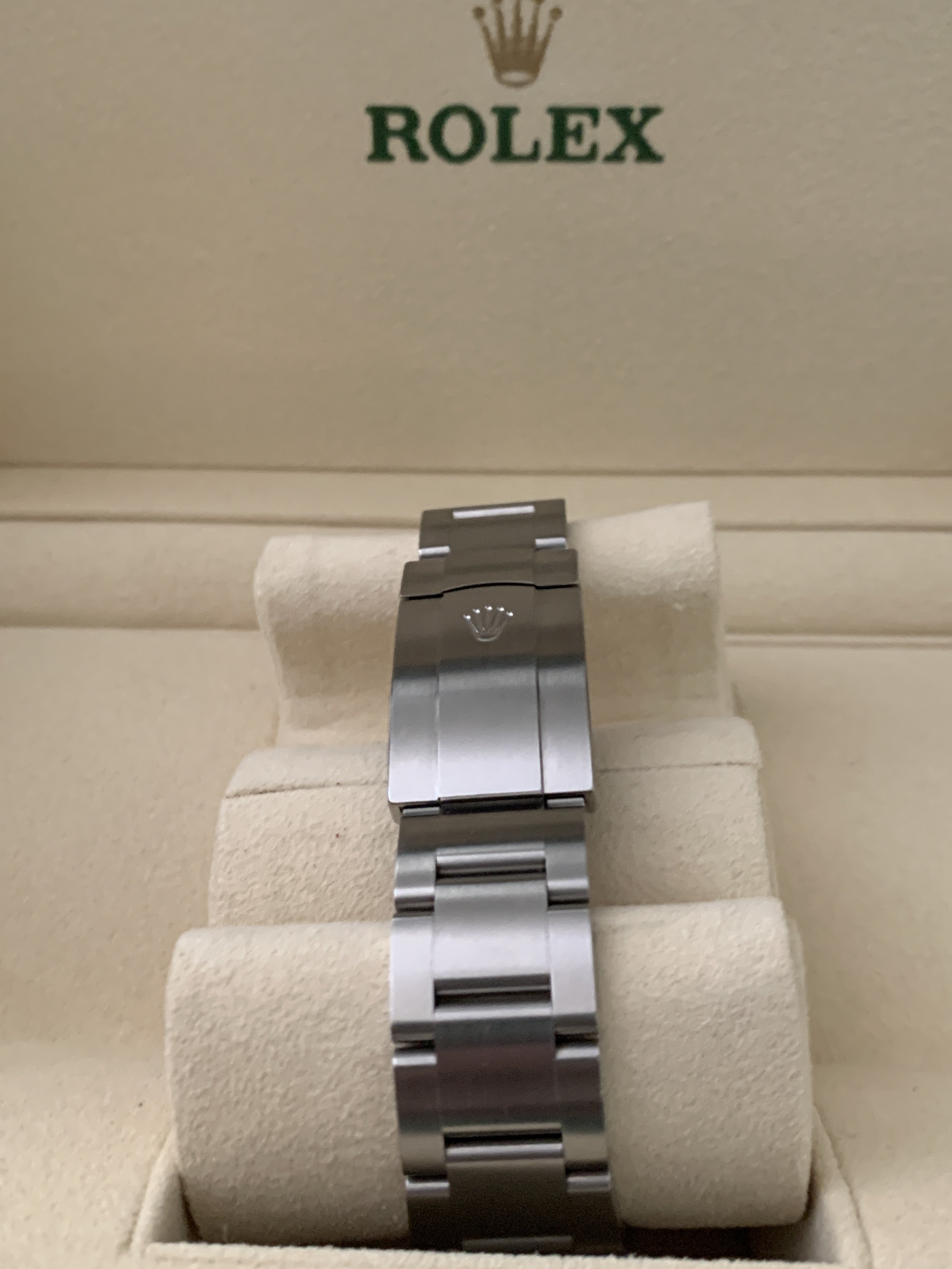 Comes with everything that was purchased with it: Rolex green box, Rolex outer white box, both Rolex hang tags, Rolex warranty card, Rolex extra bracelet link (removed when sizing at purchase), Rolex operational booklet. Sticker on back of watch has been removed.