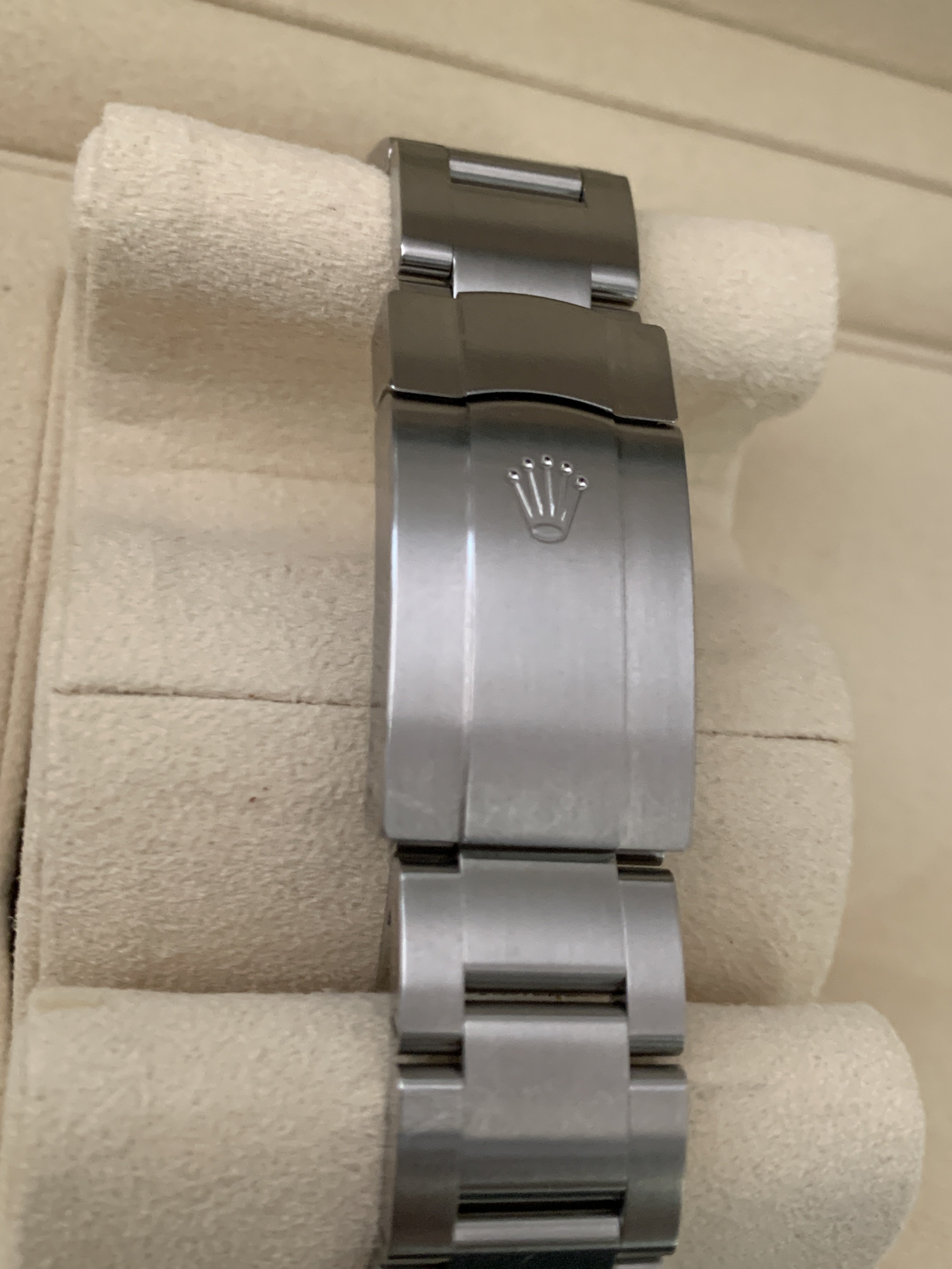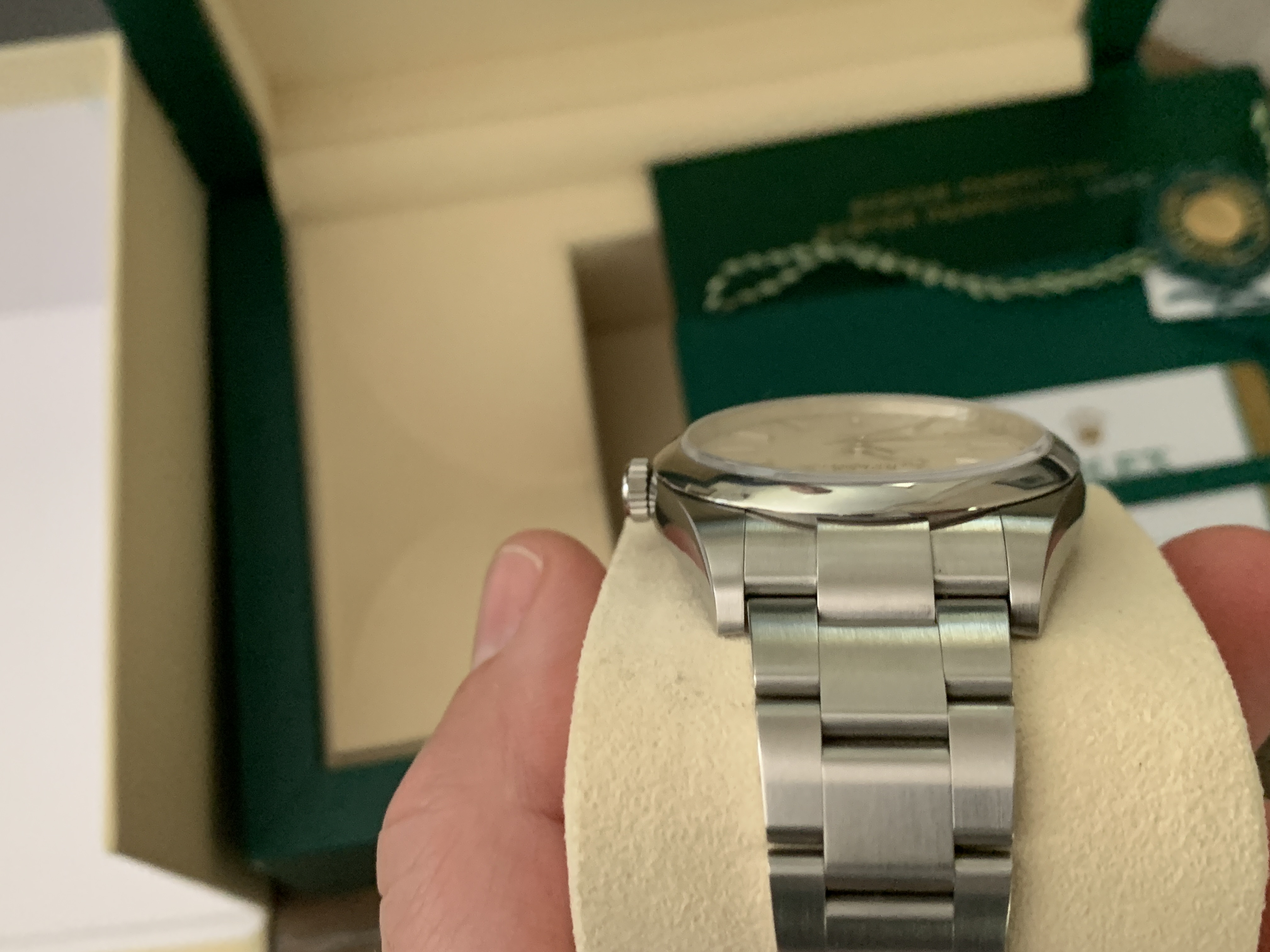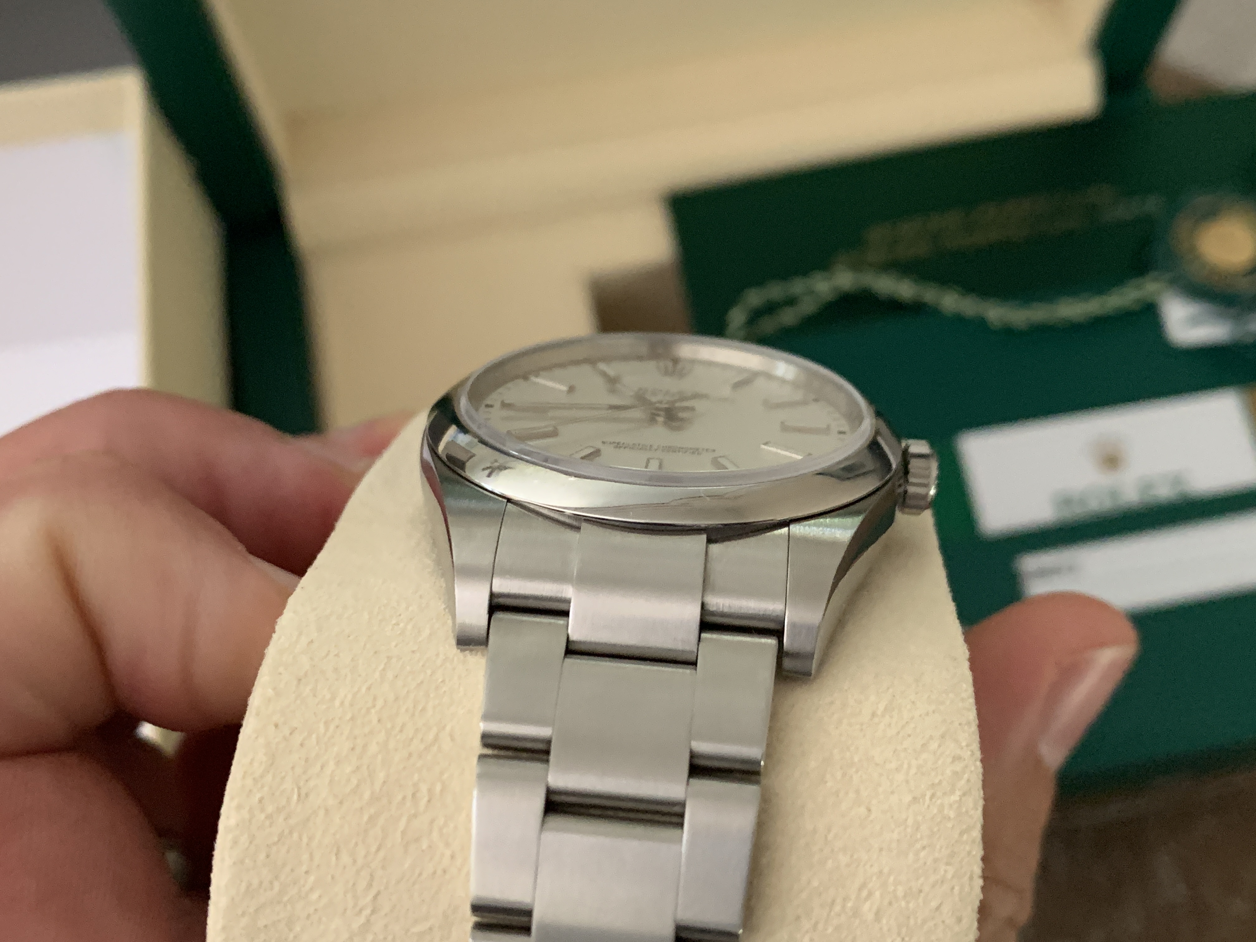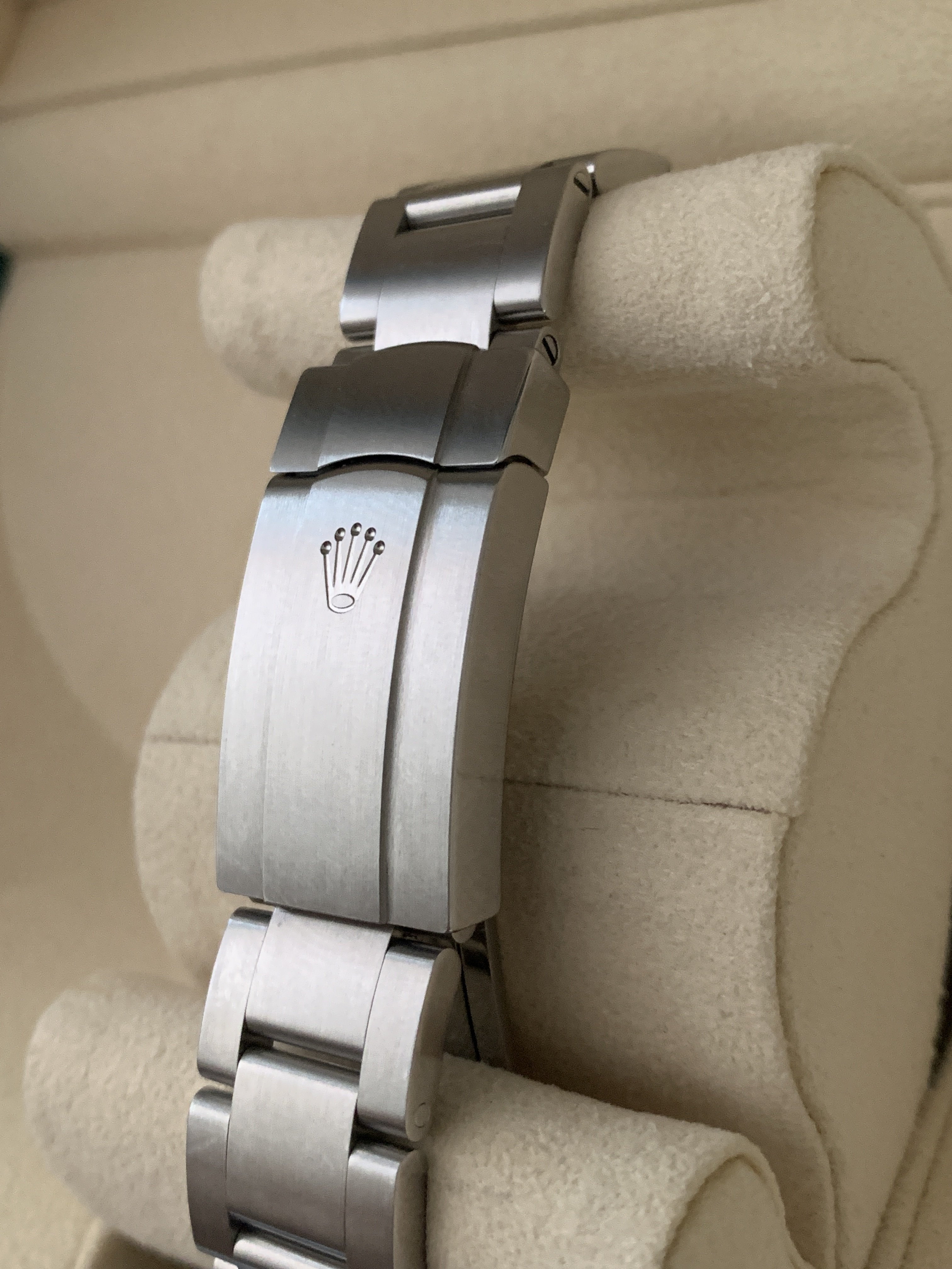 Comes with everything that was purchased with it: Rolex green box, Rolex outer white box, both Rolex hang tags, Rolex warranty card, Rolex extra bracelet link (removed when sizing at purchase), Rolex operational booklet. Sticker on back of watch has been removed.