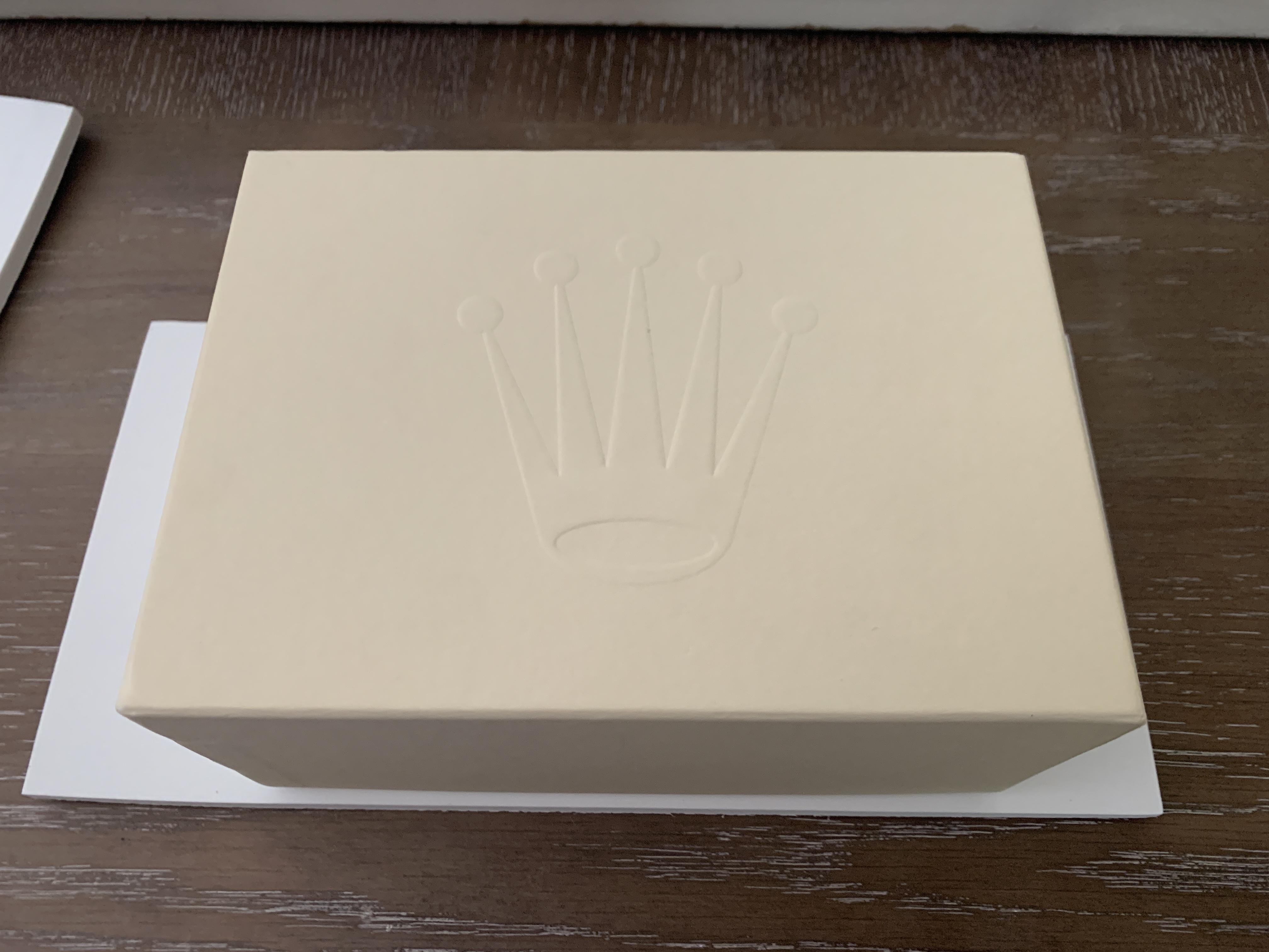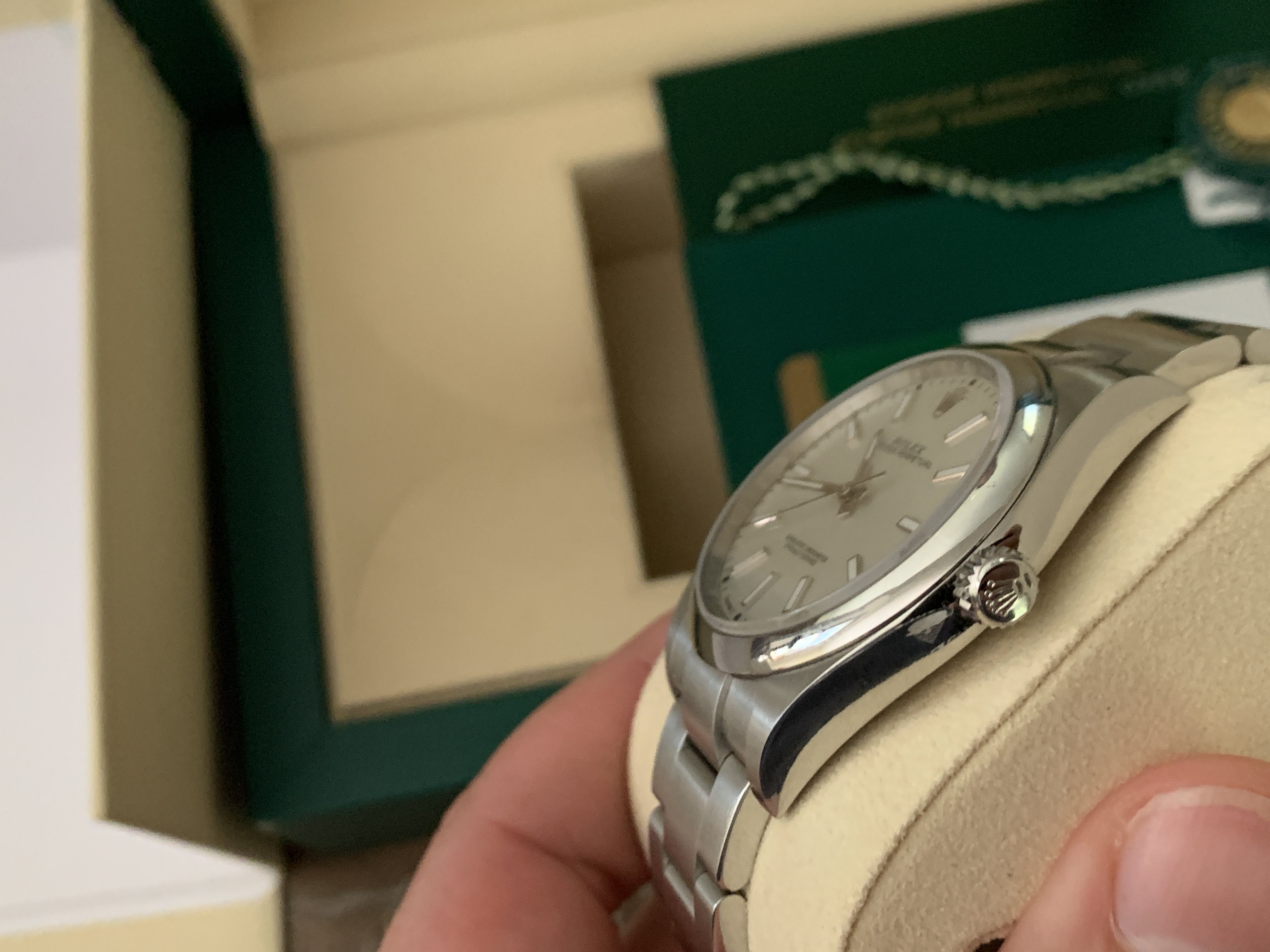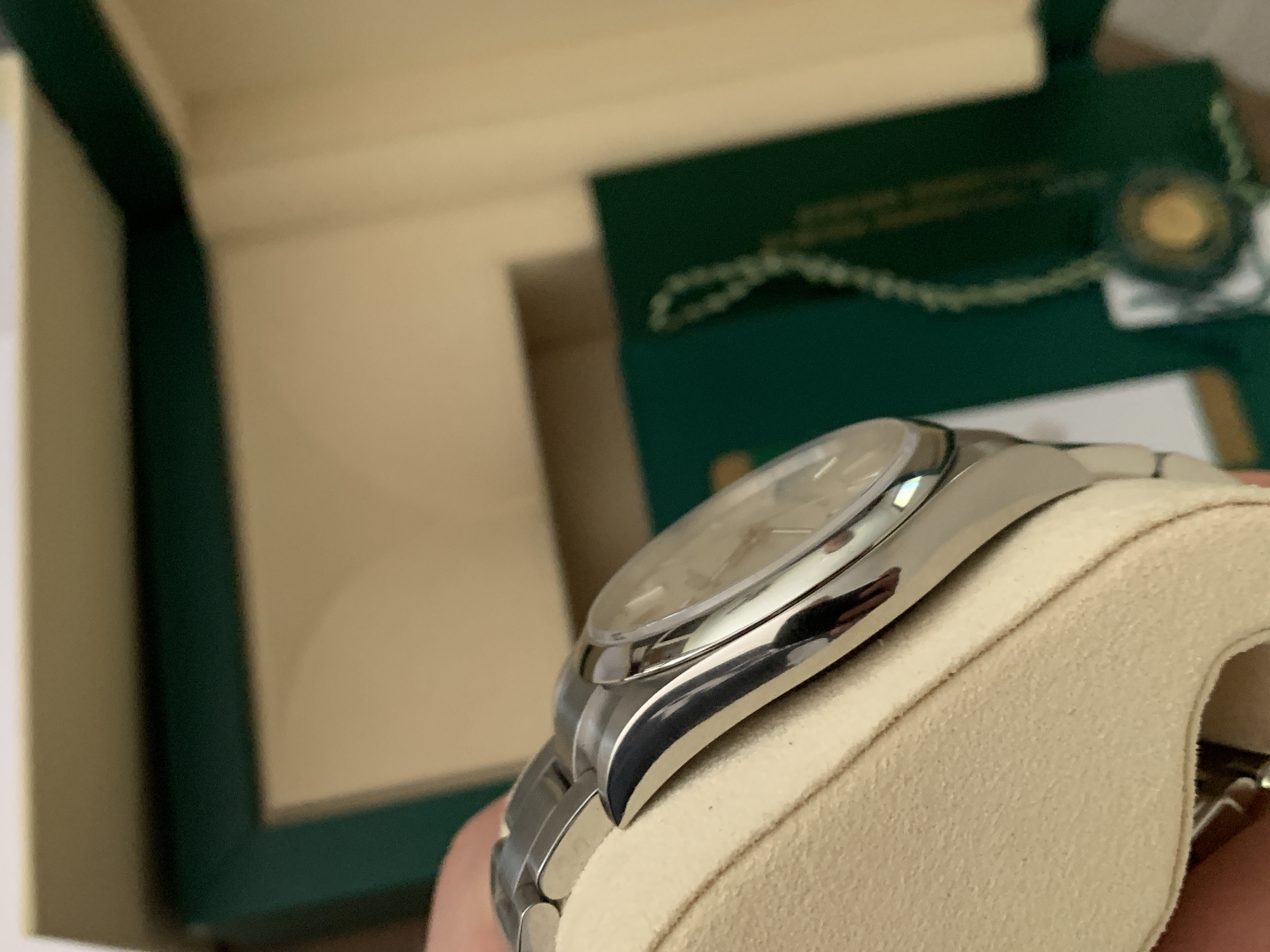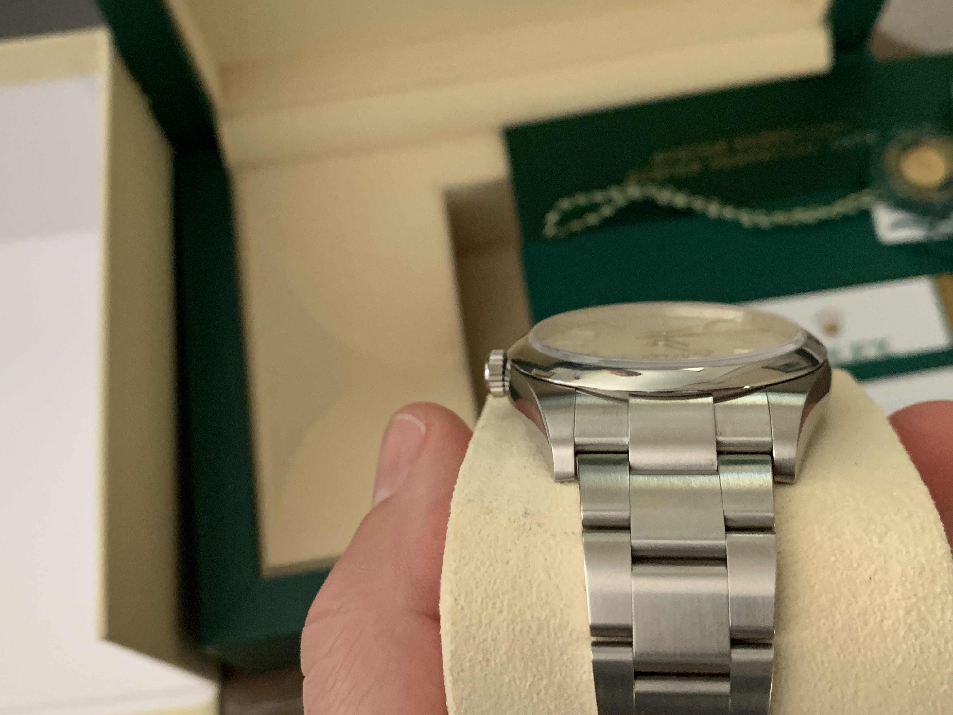 Comes with everything that was purchased with it: Rolex green box, Rolex outer white box, both Rolex hang tags, Rolex warranty card, Rolex extra bracelet link (removed when sizing at purchase), Rolex operational booklet. Sticker on back of watch has been removed.