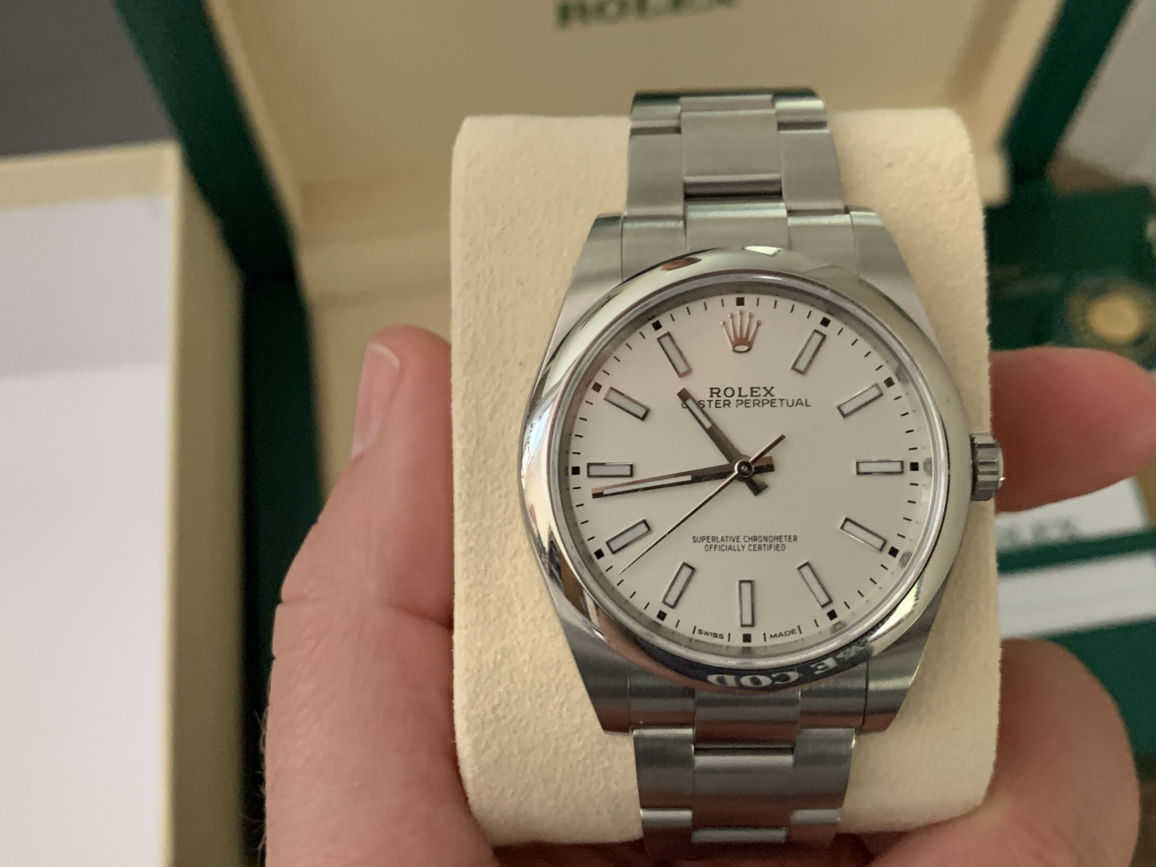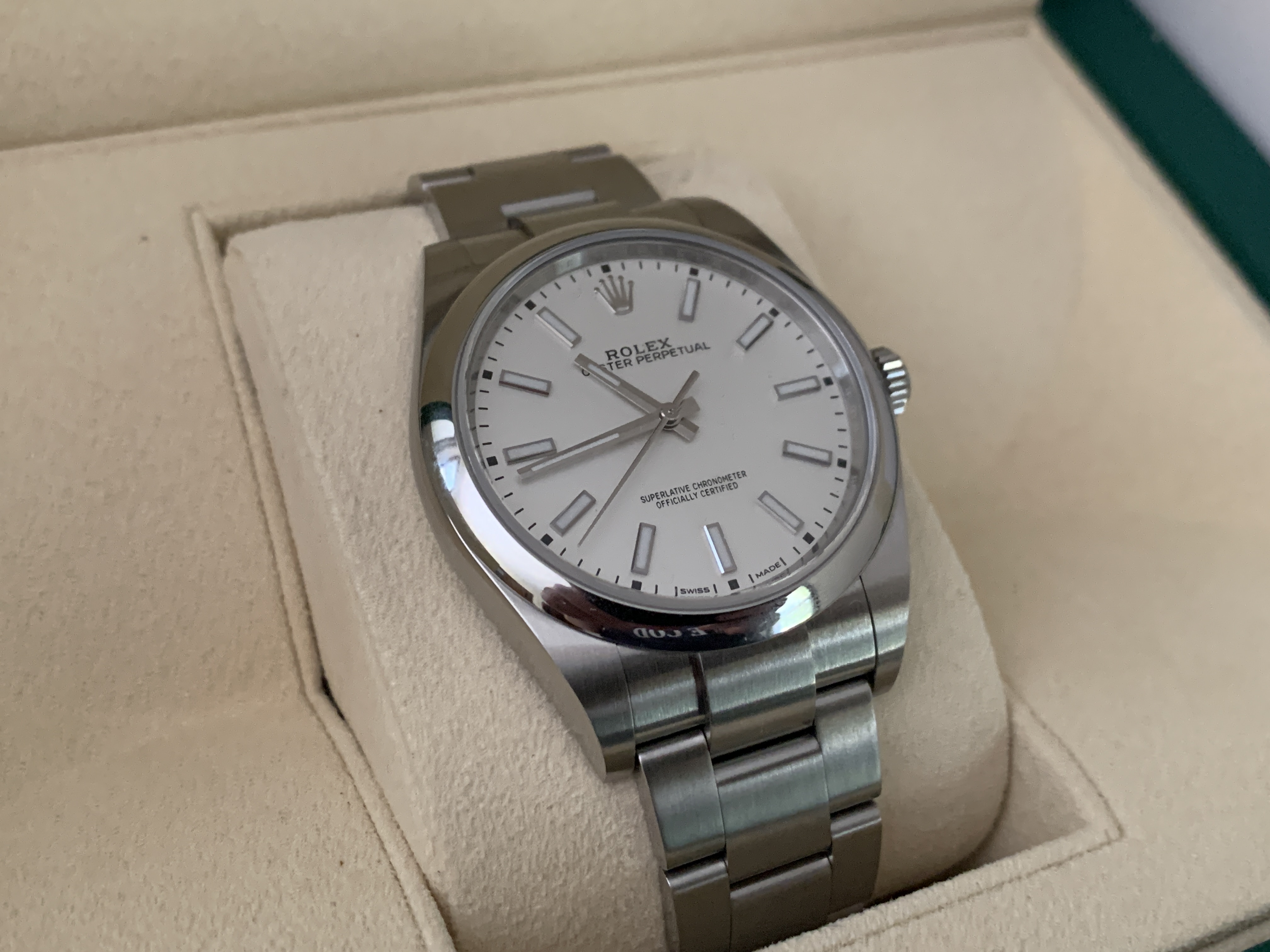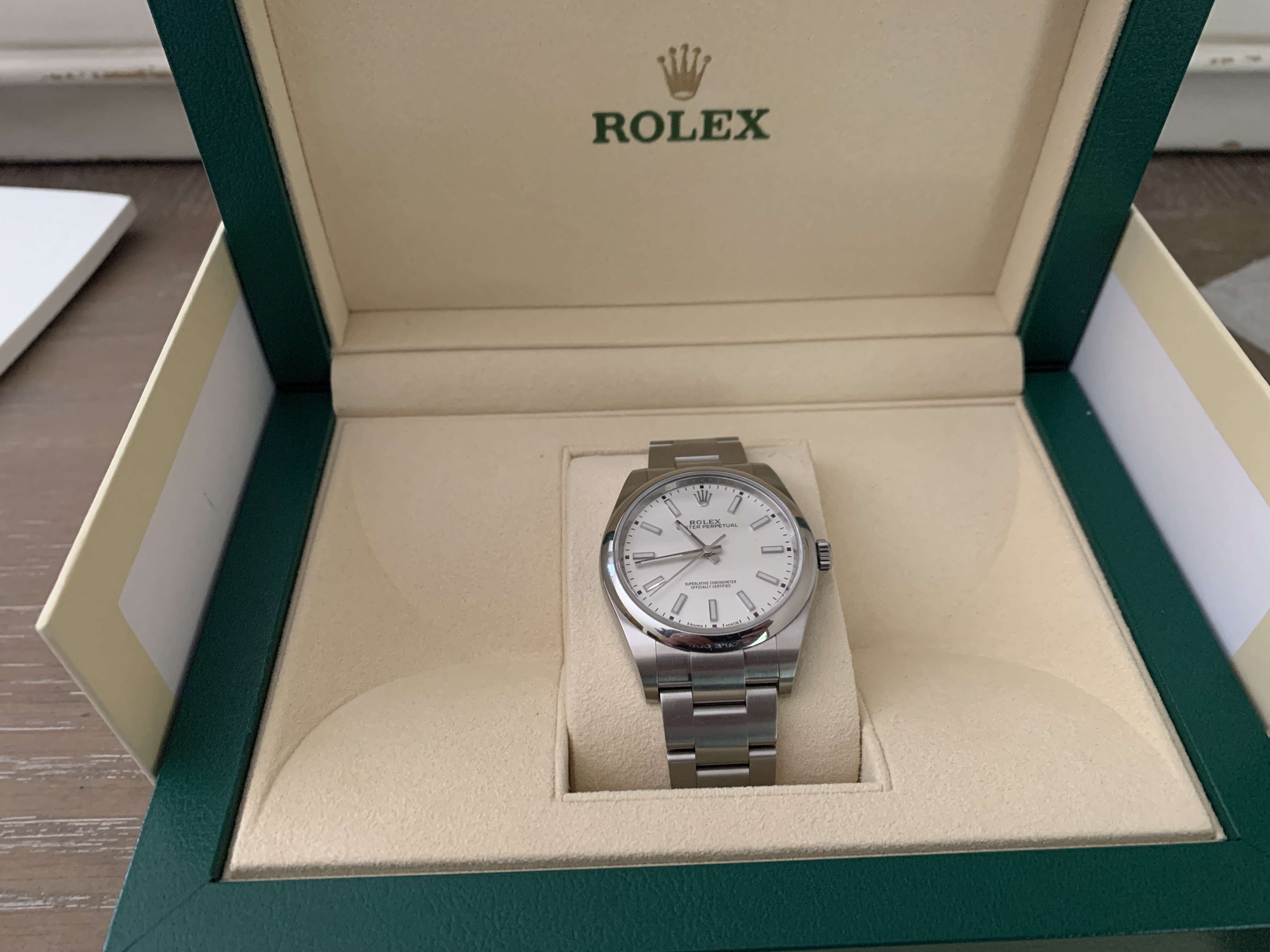 Up for sale is a gently used Rolex Oyster Perpetual 39mm White Dial. Reference #114300