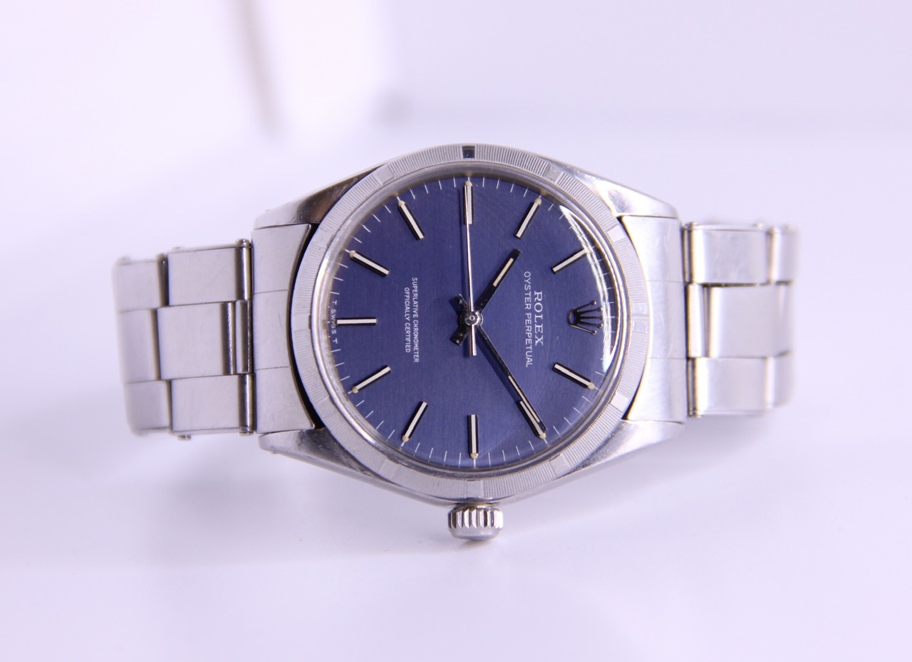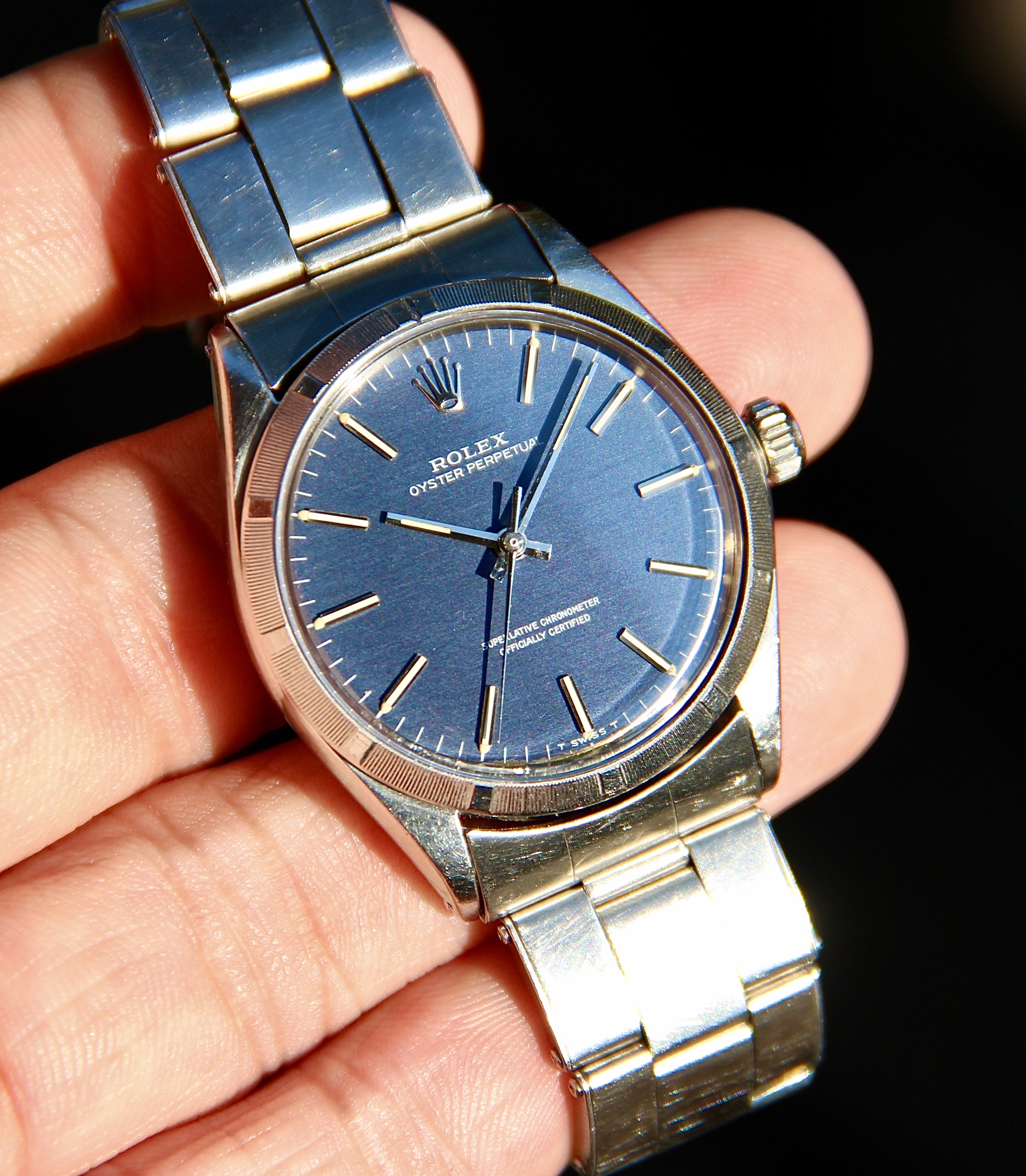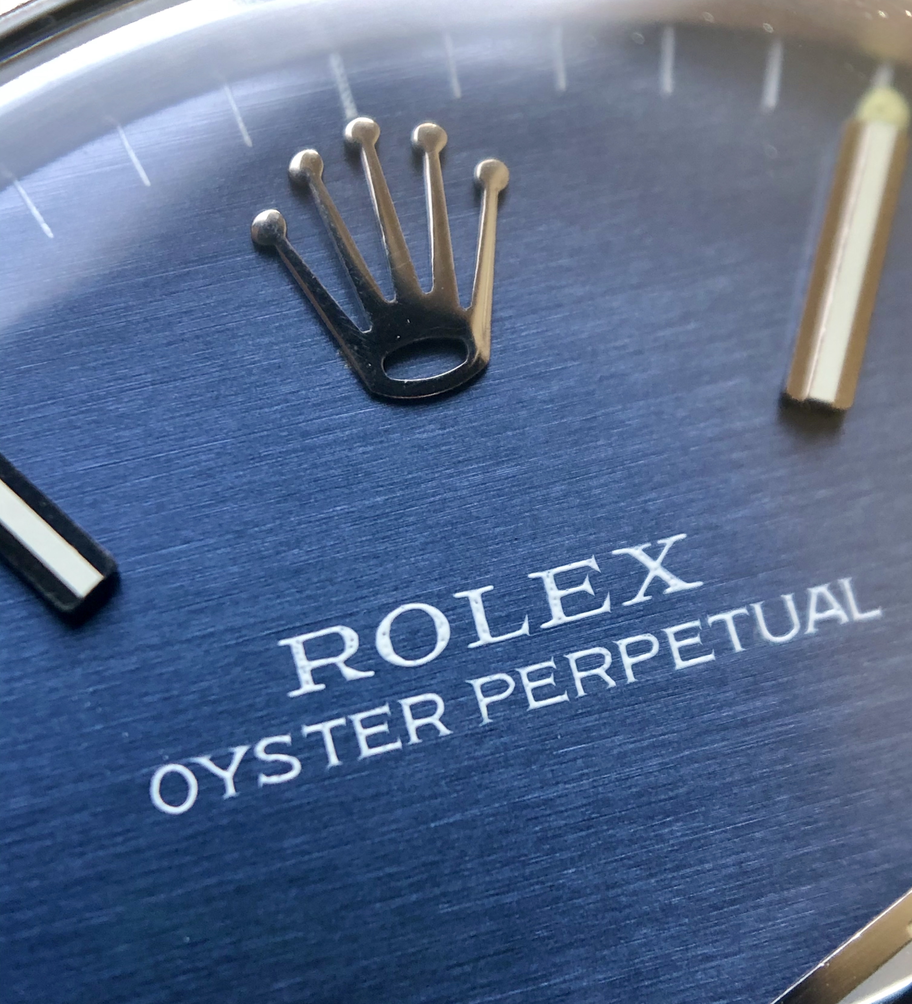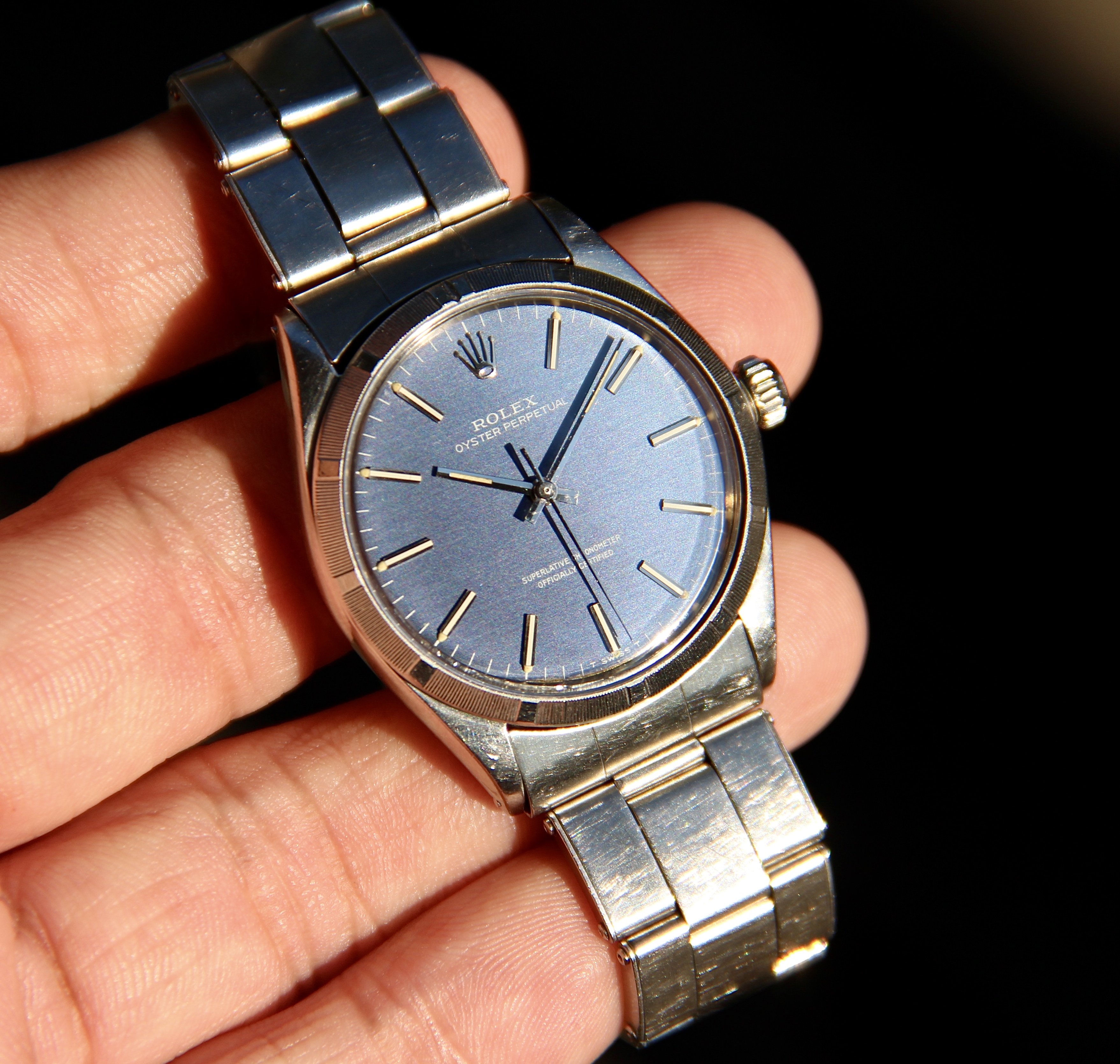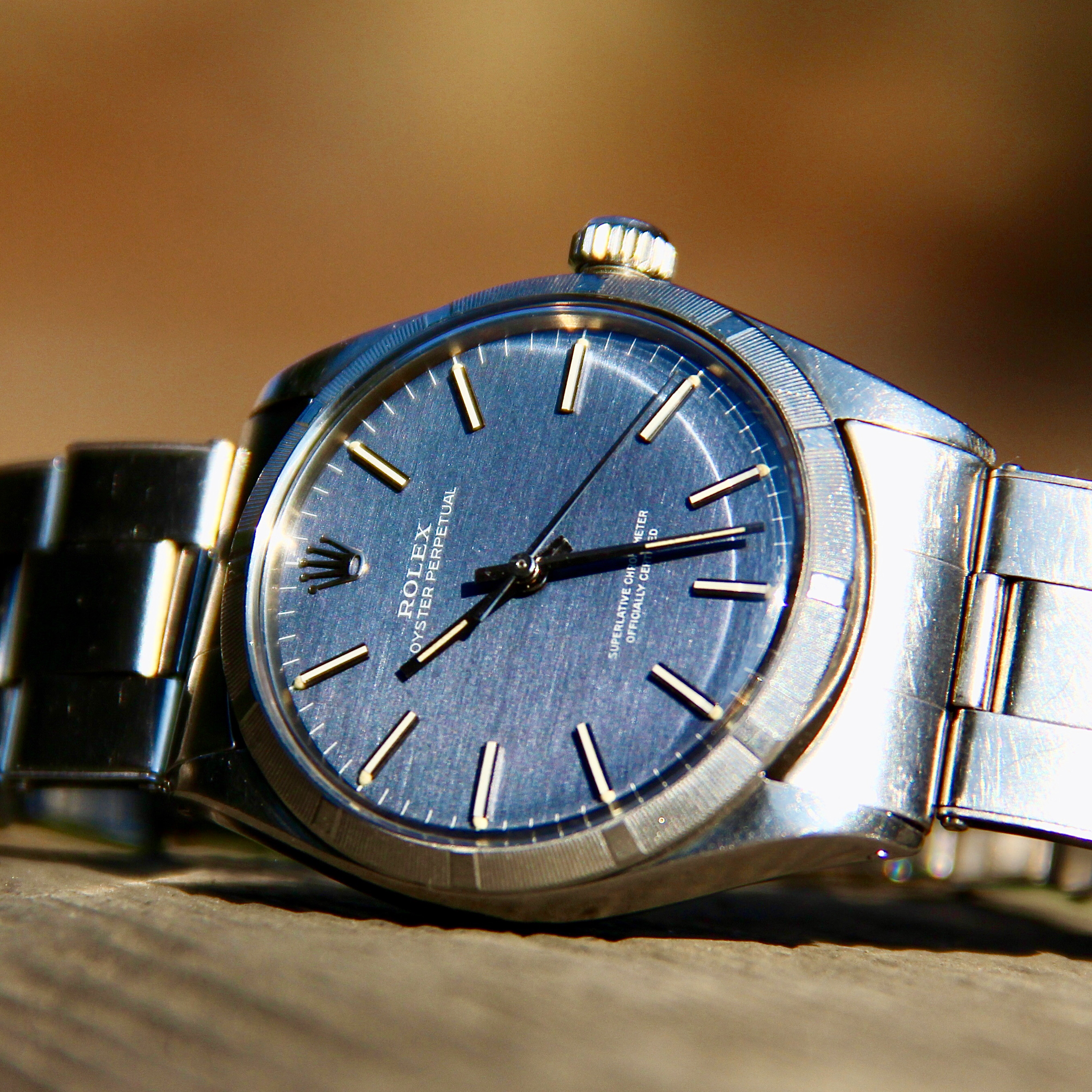 Up for sale today is my Rolex Oyster Perpetual ref 1003 in stainless steel with a brushed blue dial. I've owned a fair number of midsize Rolex references from the 1960s/70s/80s and this is one of the rarest dial variations - a beautiful blue dial with a horizontal brushed finish. The dial is also quite dynamic, changing from a dark blue to a medium blue-purple depending on ambient lighting. The lume on the dial and hands is original and has aged to a pleasant, creamy color. The engine turned bezel is another nice touch and adds some presence on the wrist. The watch comes on a later but period correct Rolex C+I stretch rivet bracelet that will fit up to a 7.75" wrist.
