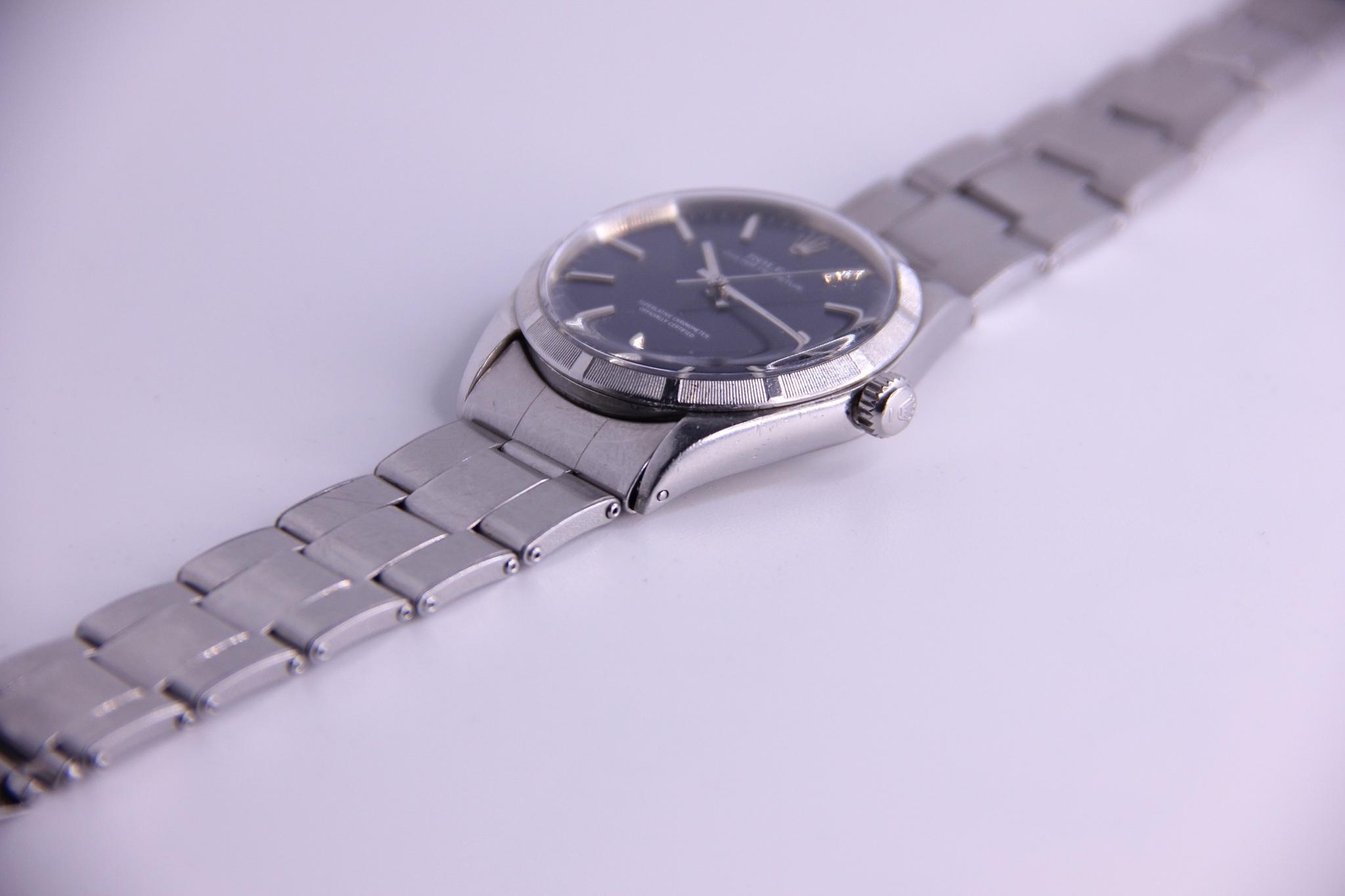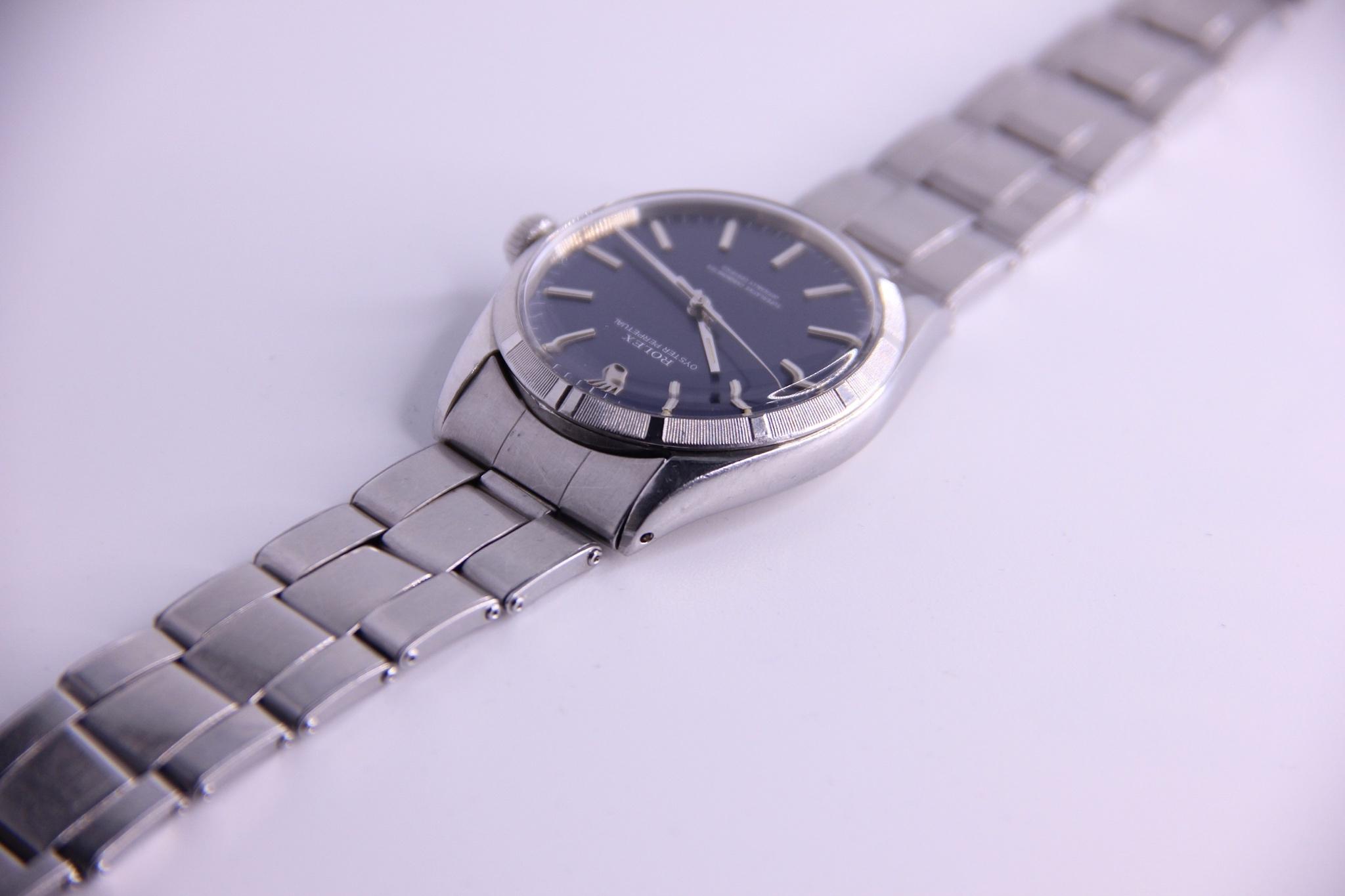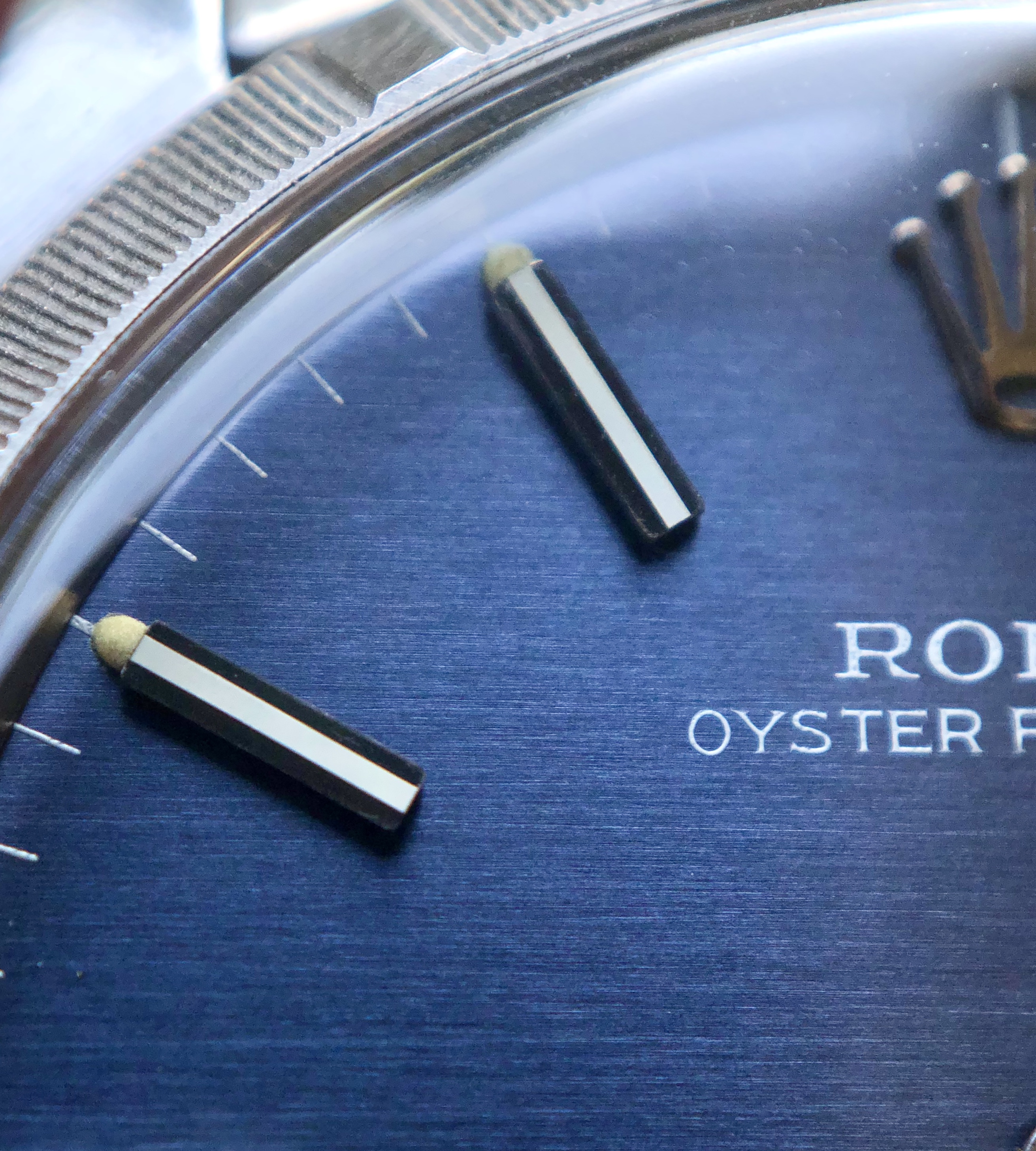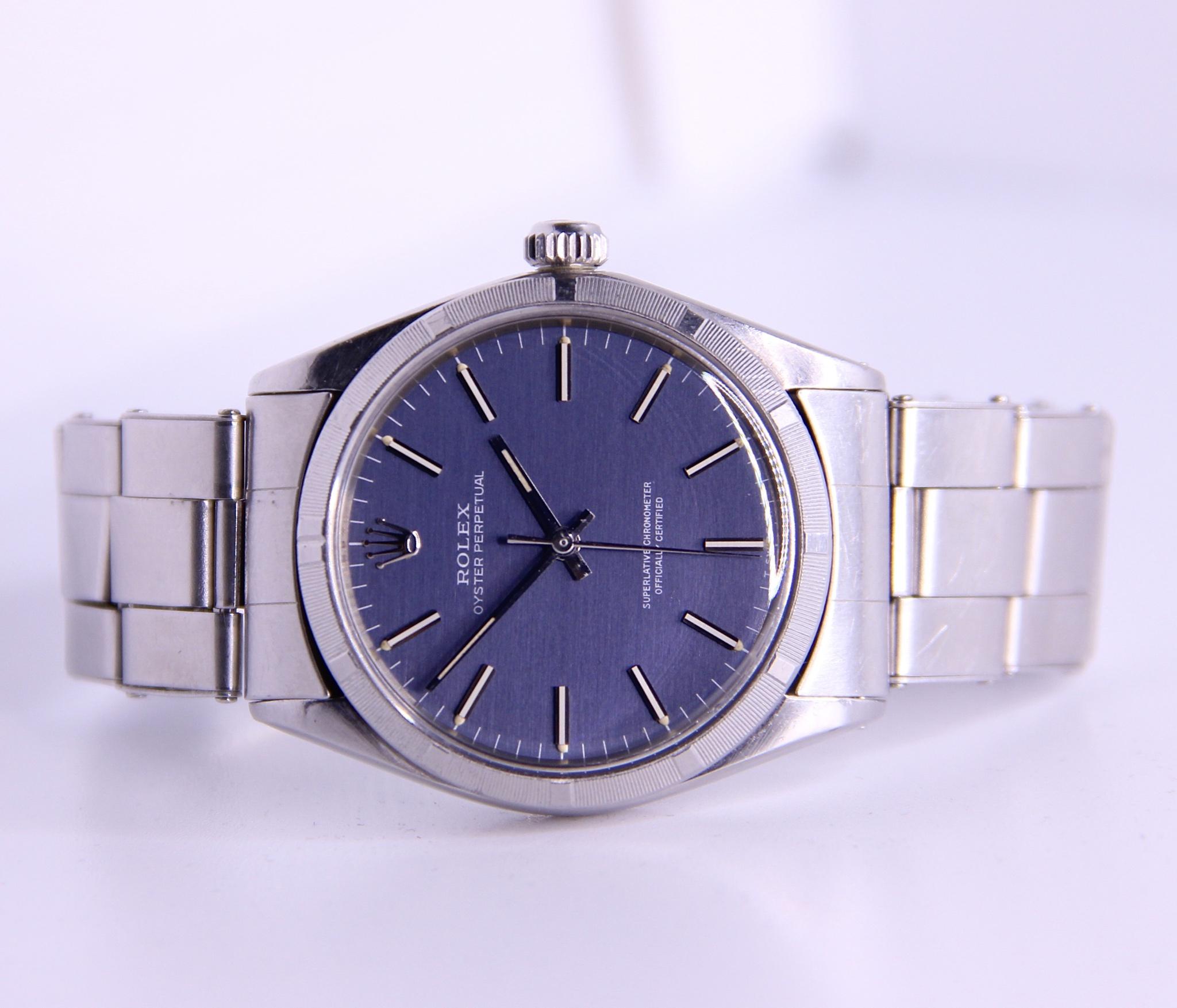 Up for sale today is my Rolex Oyster Perpetual ref 1003 in stainless steel with a brushed blue dial. I've owned a fair number of midsize Rolex references from the 1960s/70s/80s and this is one of the rarest dial variations - a beautiful blue dial with a horizontal brushed finish. The dial is also quite dynamic, changing from a dark blue to a medium blue-purple depending on ambient lighting. The lume on the dial and hands is original and has aged to a pleasant, creamy color. The engine turned bezel is another nice touch and adds some presence on the wrist. The watch comes on a later but period correct Rolex C+I stretch rivet bracelet that will fit up to a 7.75" wrist.