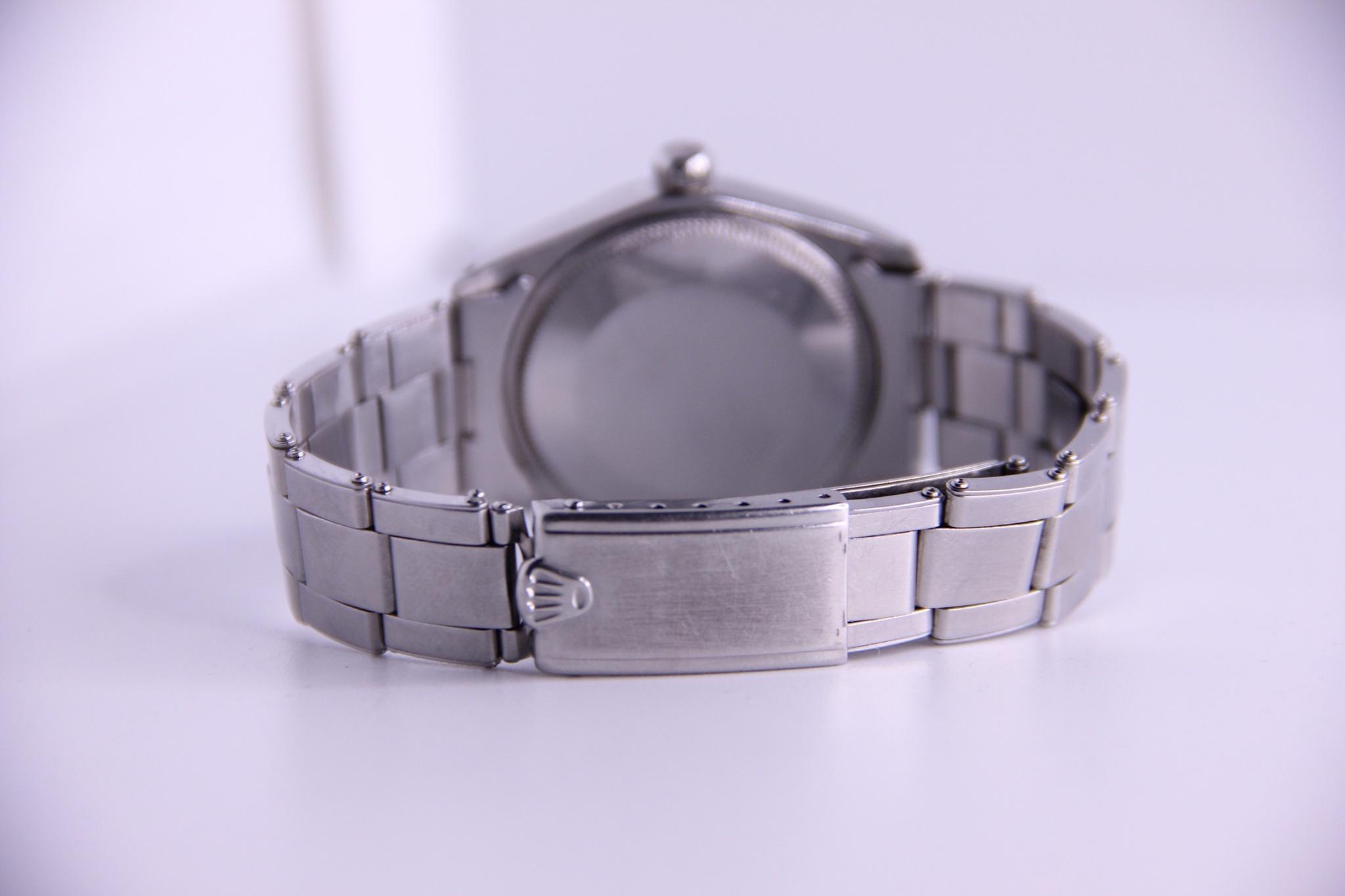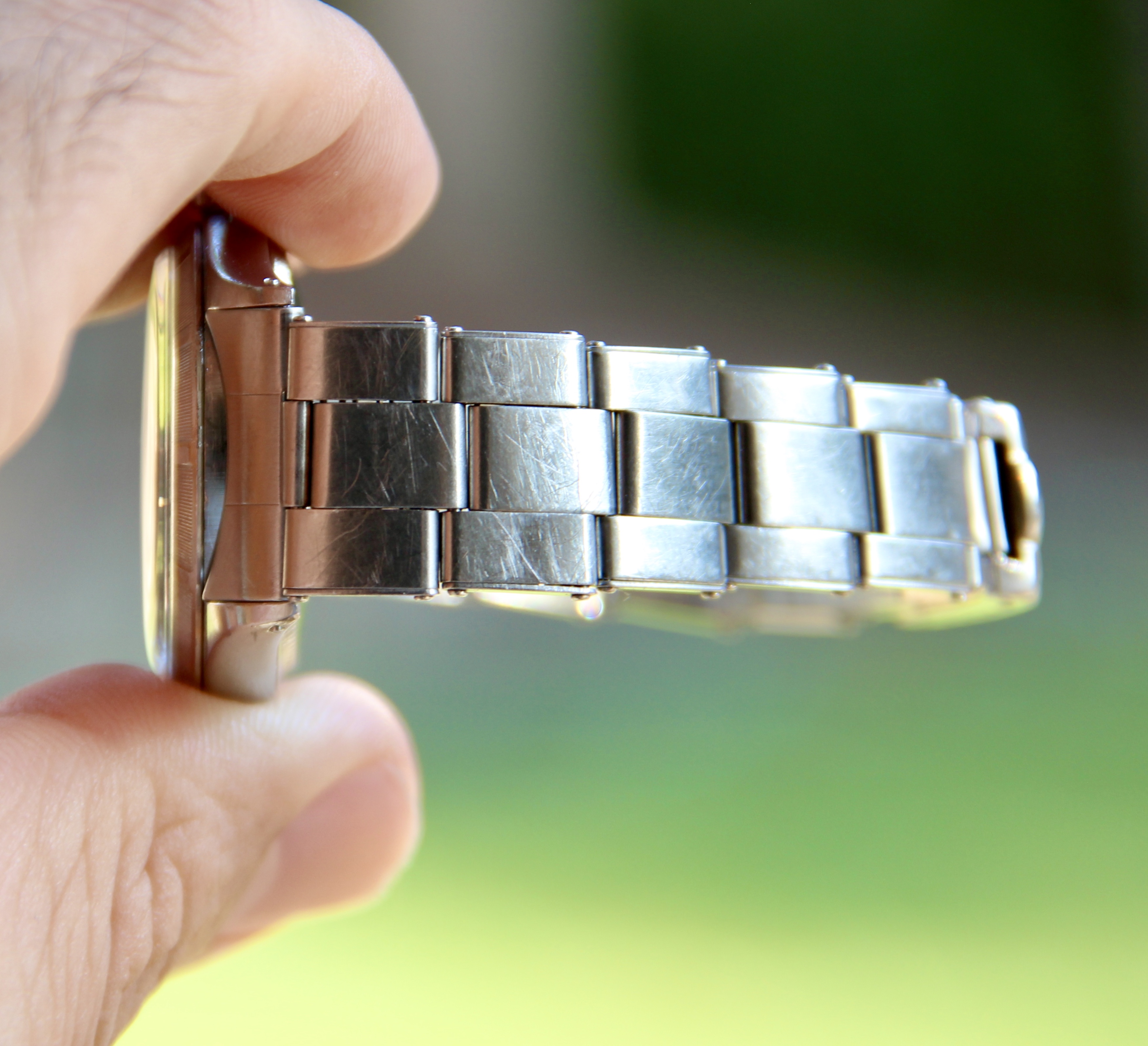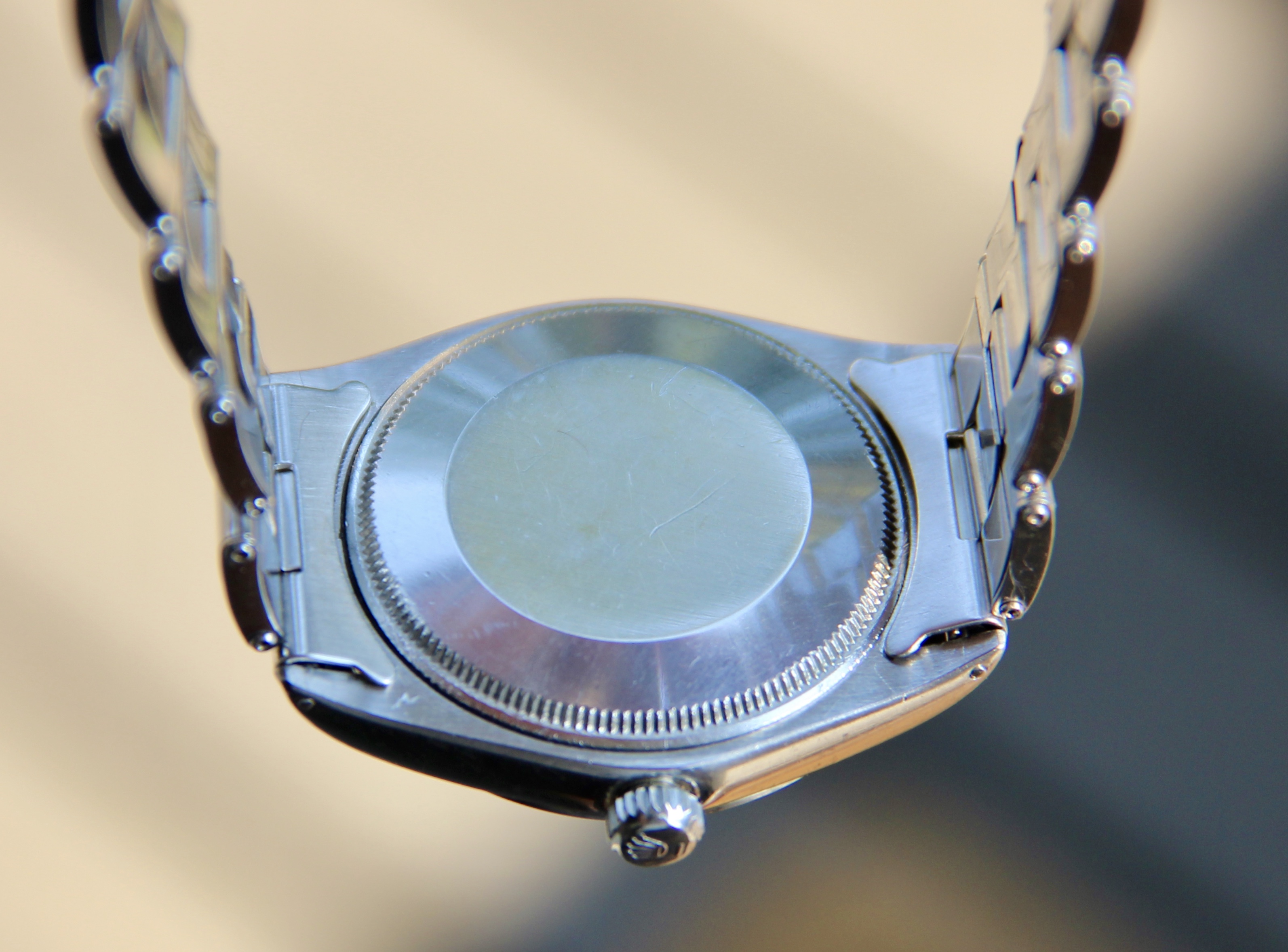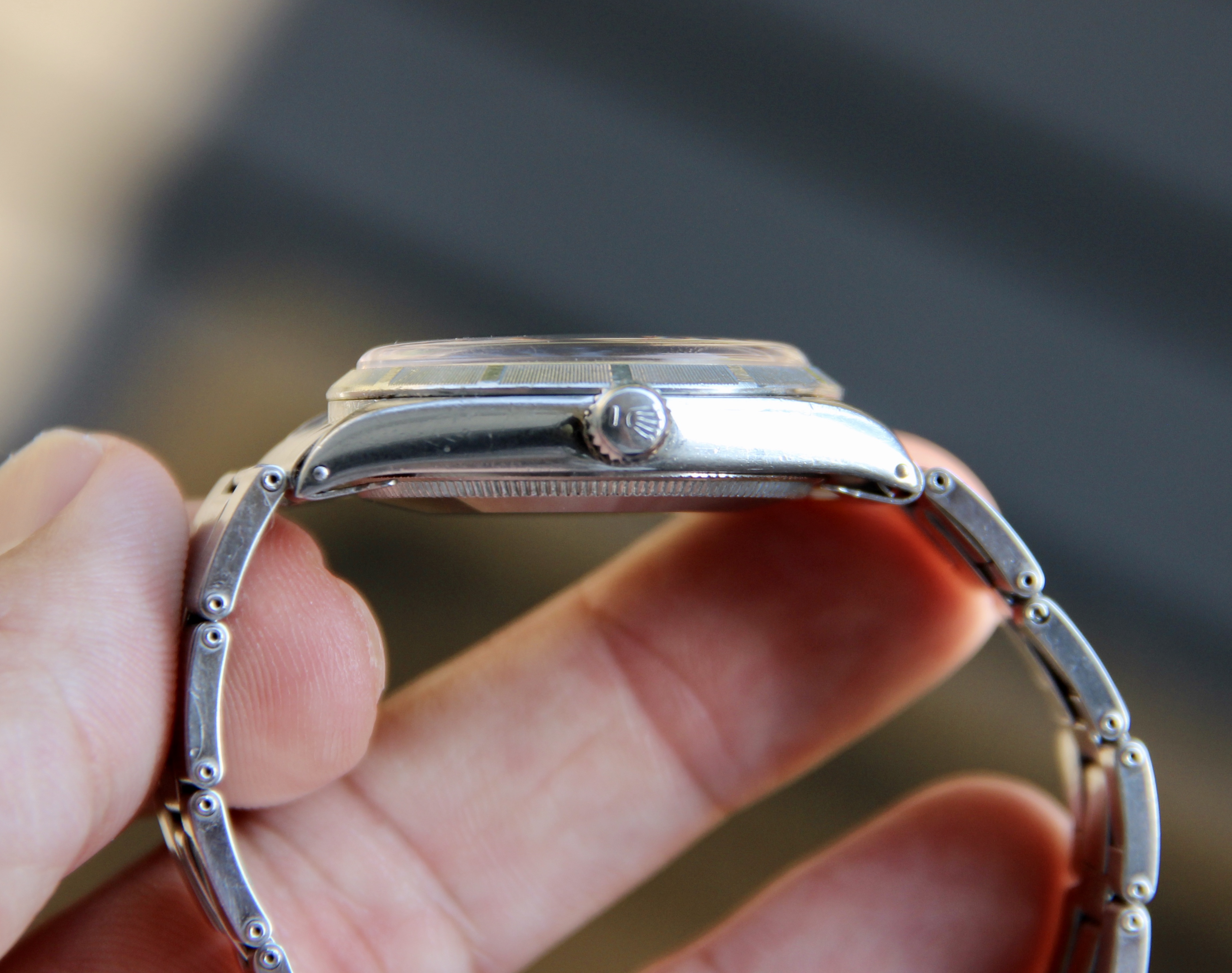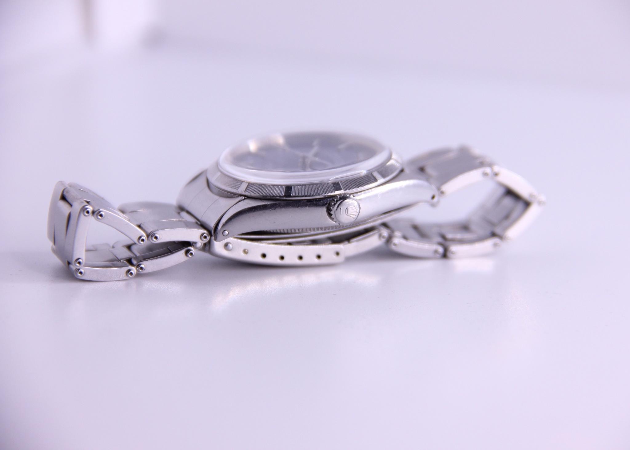 Up for sale today is my Rolex Oyster Perpetual ref 1003 in stainless steel with a brushed blue dial. I've owned a fair number of midsize Rolex references from the 1960s/70s/80s and this is one of the rarest dial variations - a beautiful blue dial with a horizontal brushed finish. The dial is also quite dynamic, changing from a dark blue to a medium blue-purple depending on ambient lighting. The lume on the dial and hands is original and has aged to a pleasant, creamy color. The engine turned bezel is another nice touch and adds some presence on the wrist. The watch comes on a later but period correct Rolex C+I stretch rivet bracelet that will fit up to a 7.75" wrist.