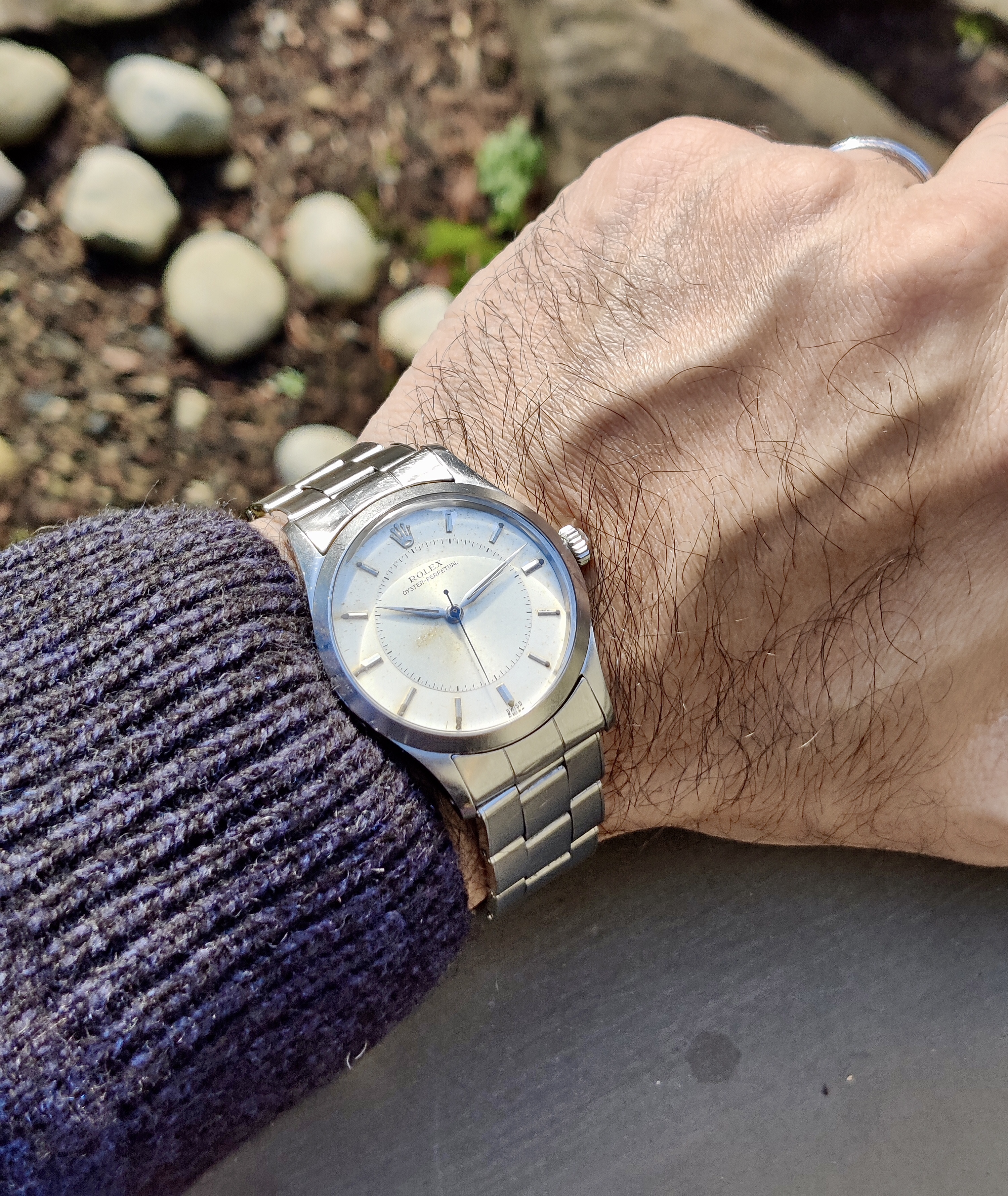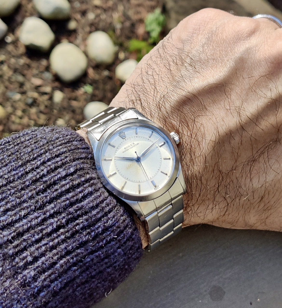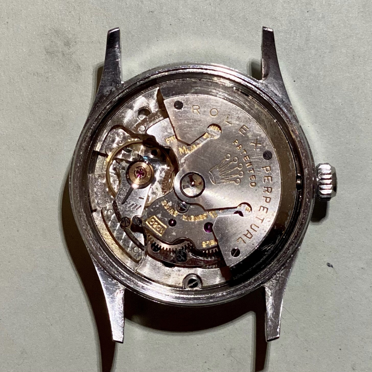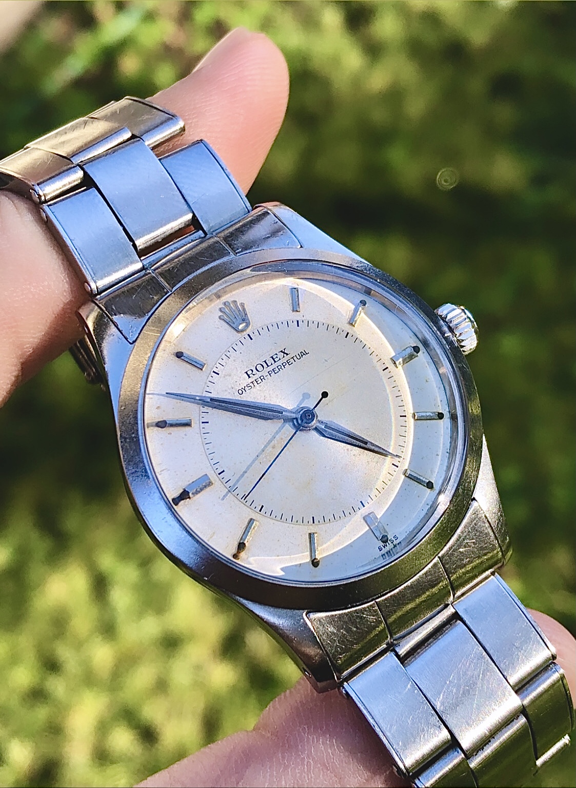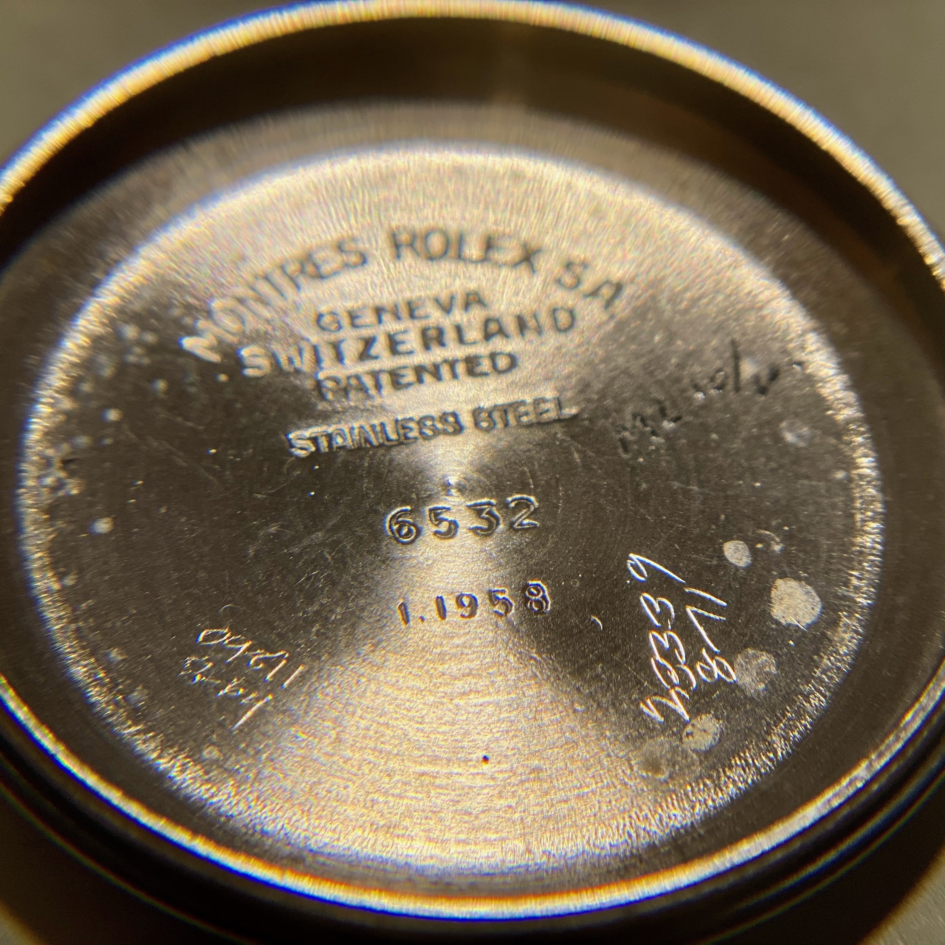 Serial number of this watch is 363XXX which dates it to 1958. Caseback is engraved 6532 and with IV.58 (fourth quarter 1958). Bracelet is a rivet style, clasp has ‘1-58’ date code. Movement is the automatic winding Rolex Caliber 1030 with 25 jewels. Original stainless steel case is approx 34mm in diameter and 11mm thick.