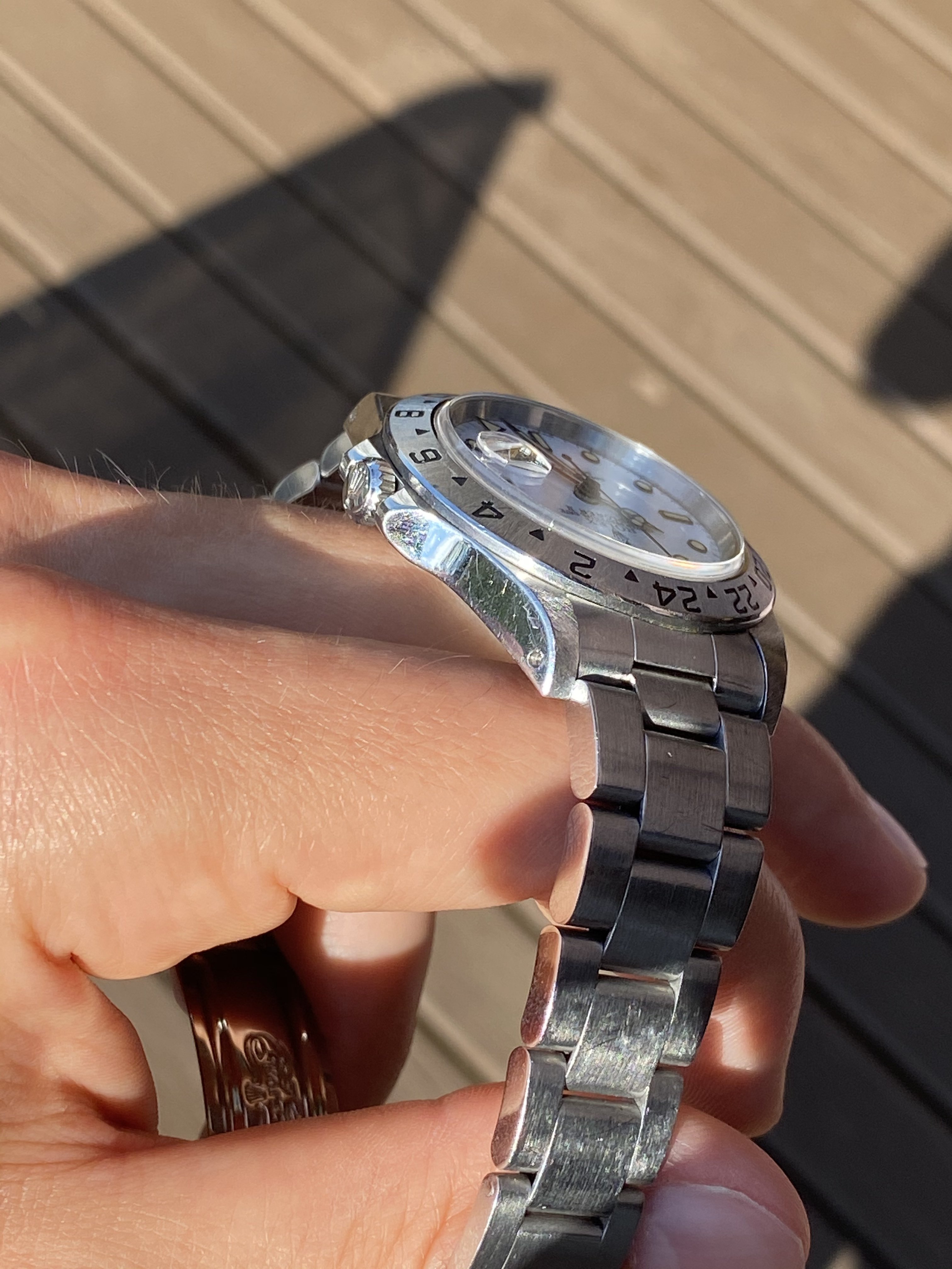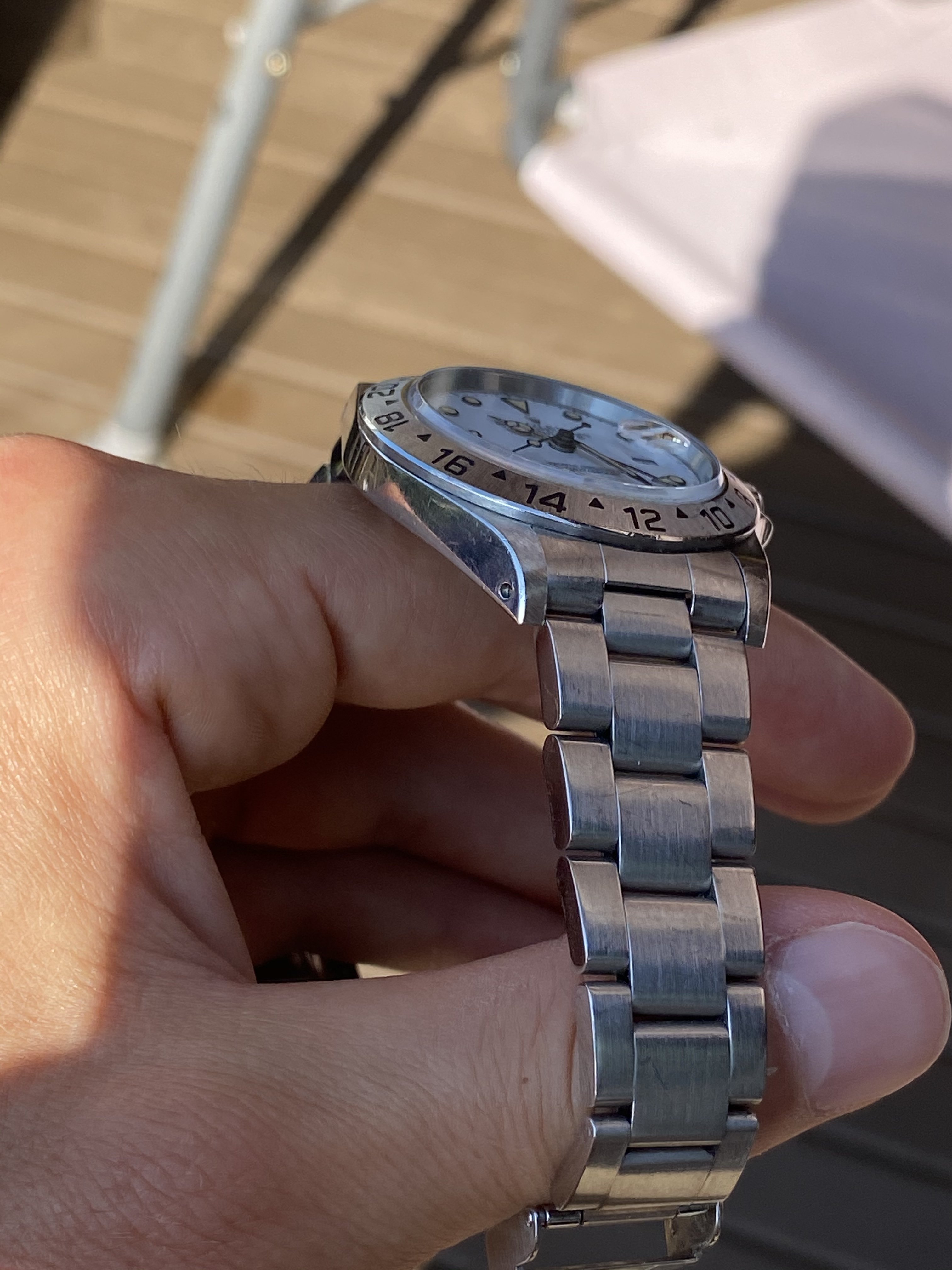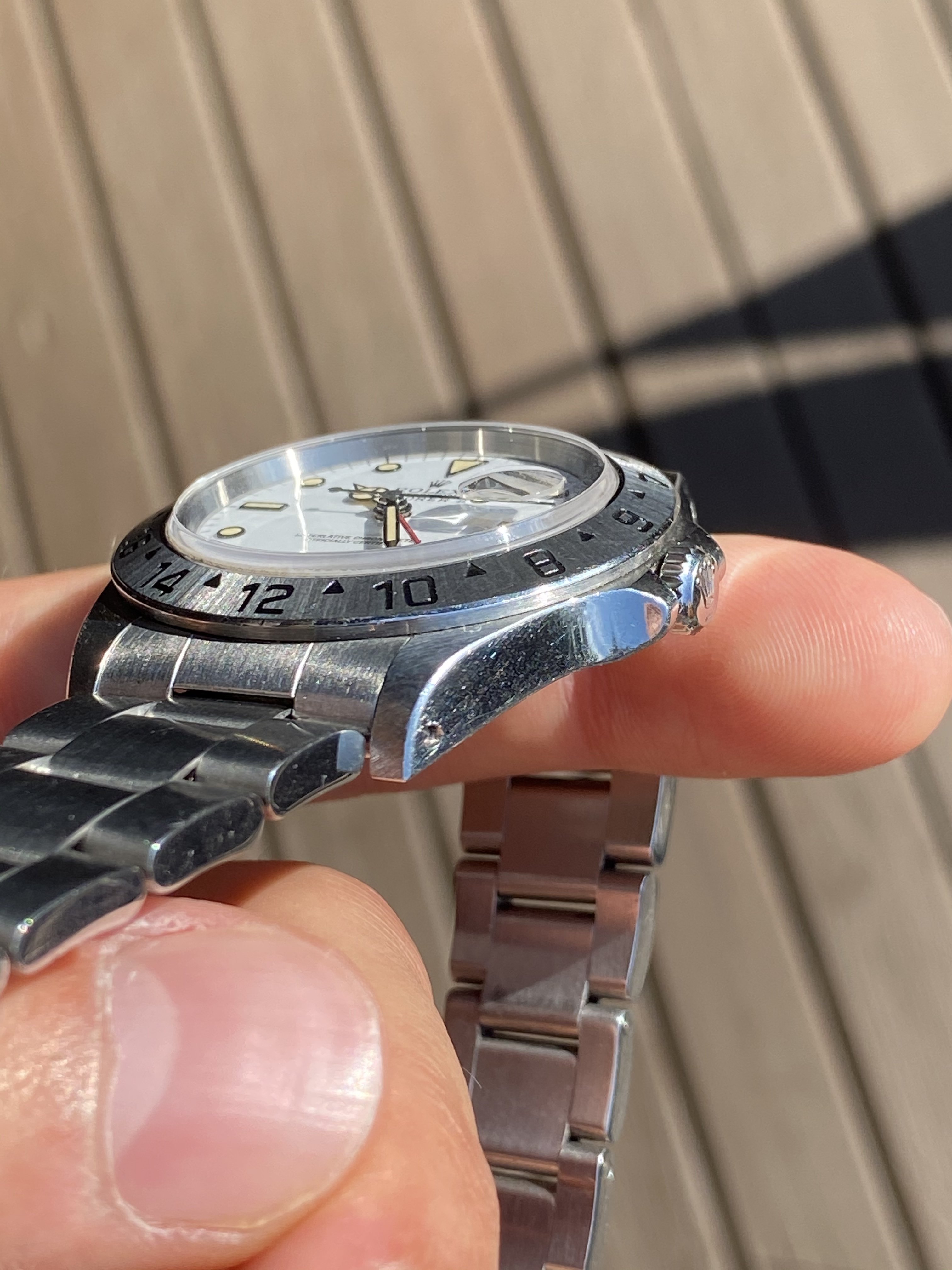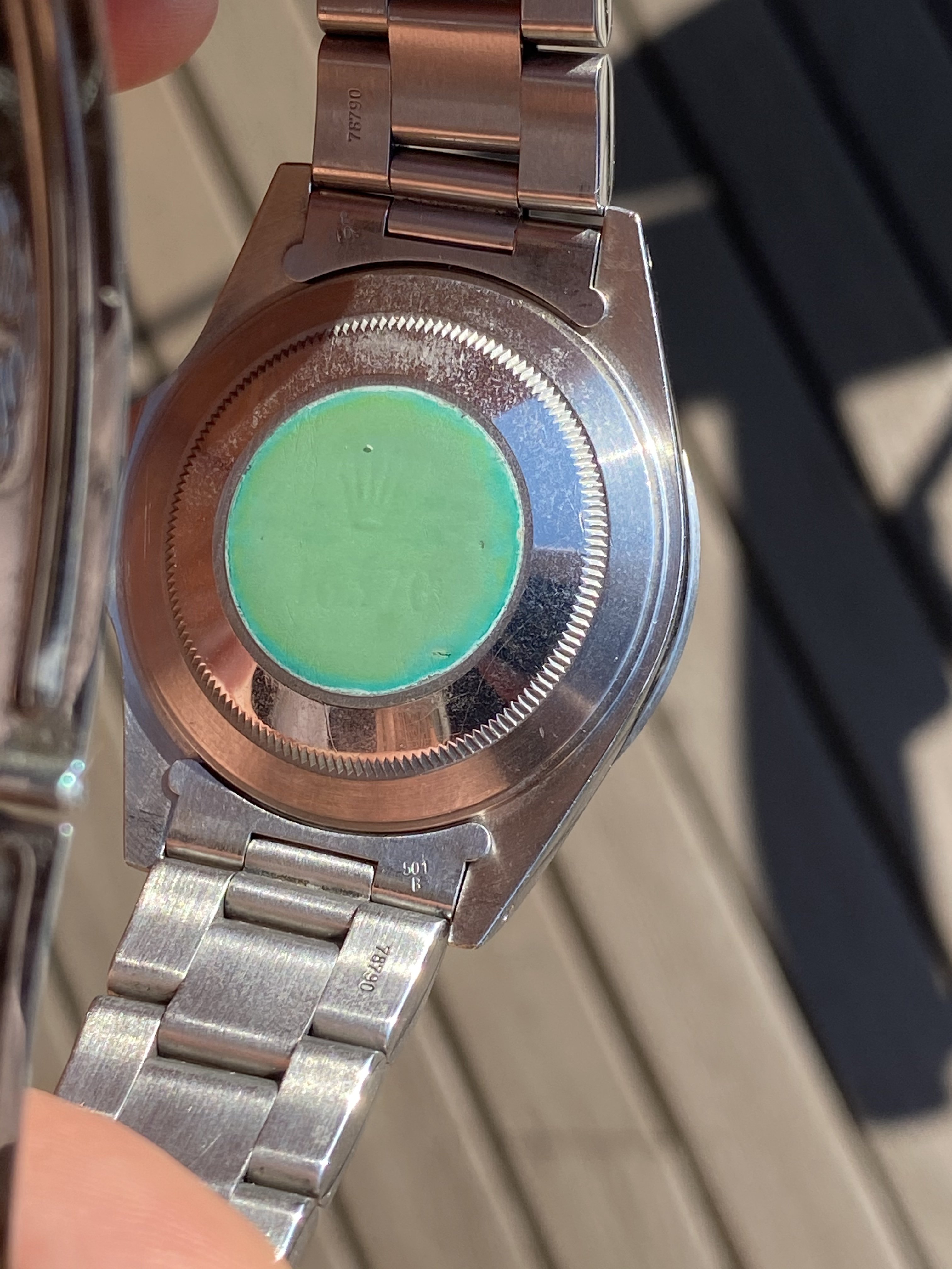 the case and bezel are in excellent condition showing no signs of polishing maintaining thick, crisp bevels. The crown guards are crisp and sharp with clean separation between brushing and polish as it should be. The case-back retains the original rolex sticker which still has 16570 and the rolex crown which can be seen on the sticker.