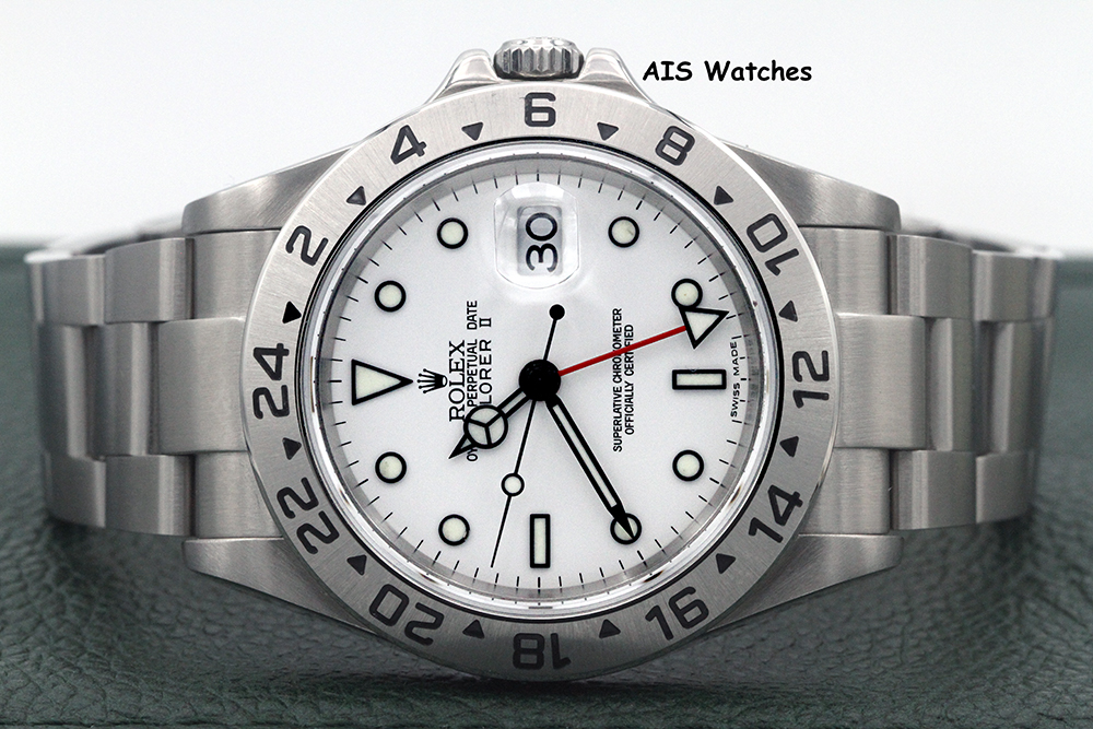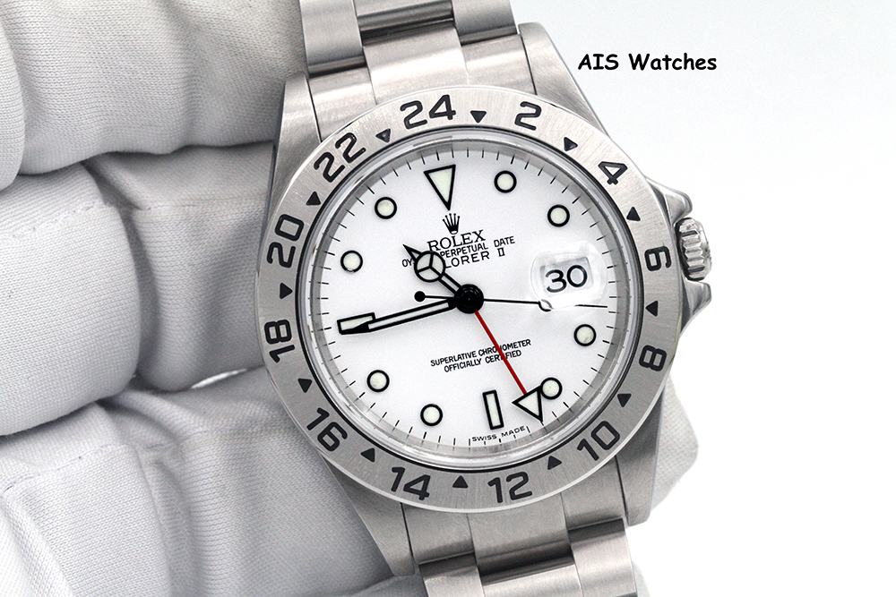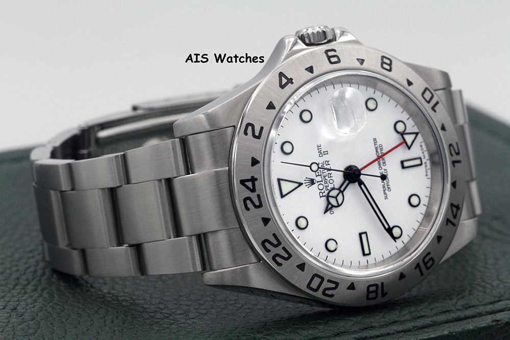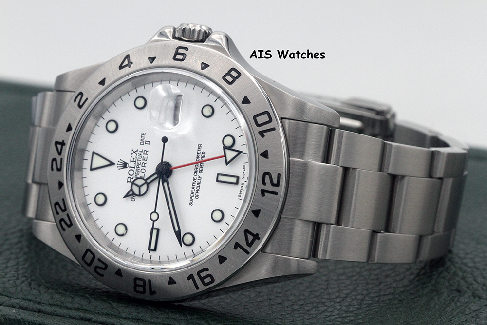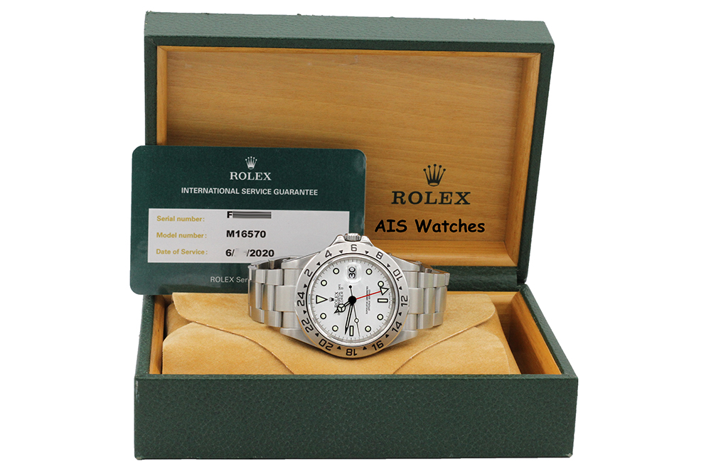 Up for sale is a Rolex Polar Explorer II 16570 with White Dial Box and RSC Card ONLY. Rolex Serviced in 2020. This watch is a F Serial NO Lug Hole Case with Solid End Links (SEL). The timepiece has minimal bracelet stretch and in excellent condition.