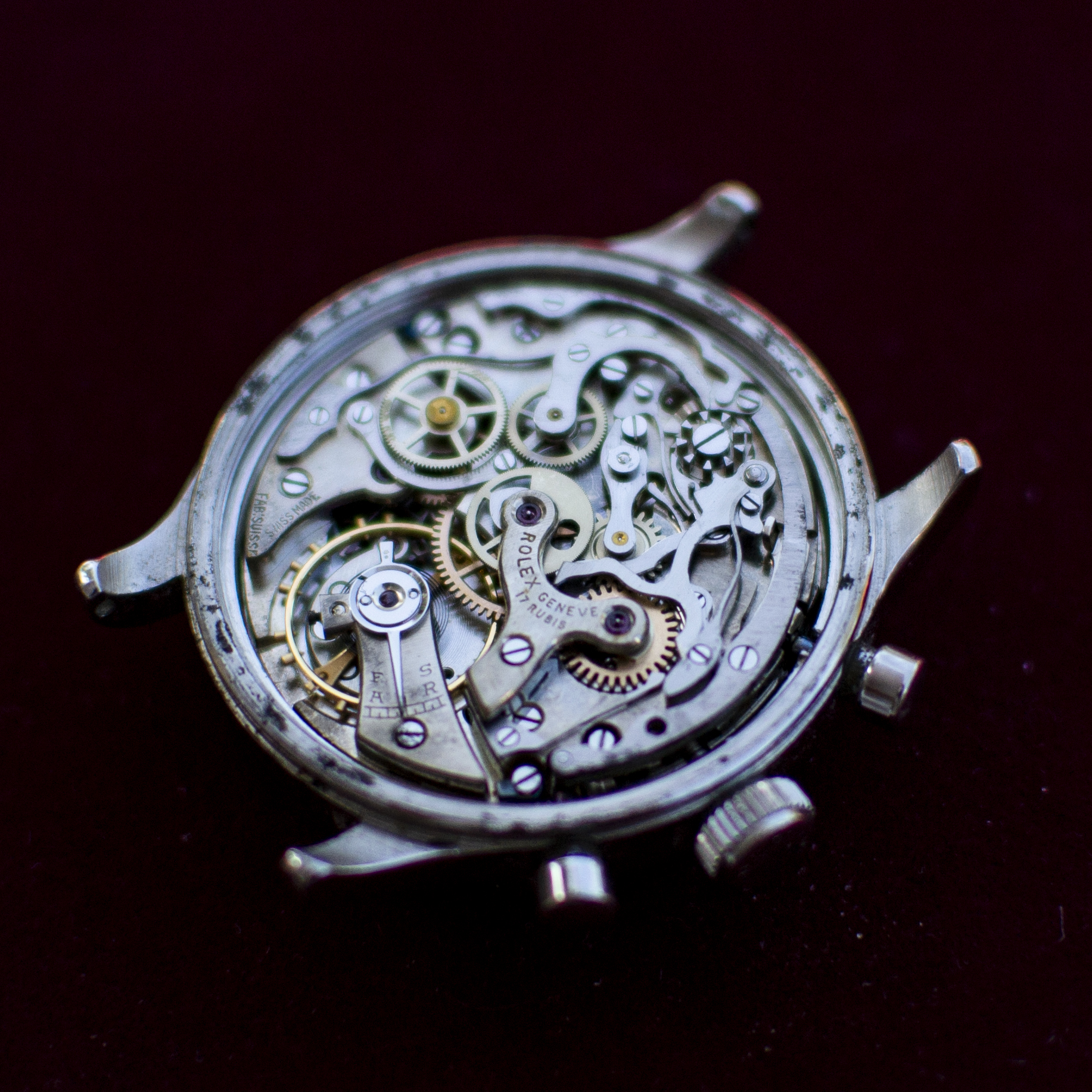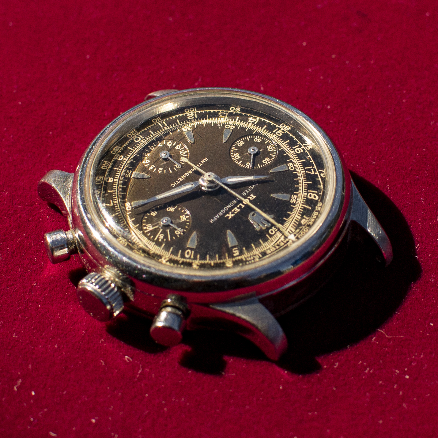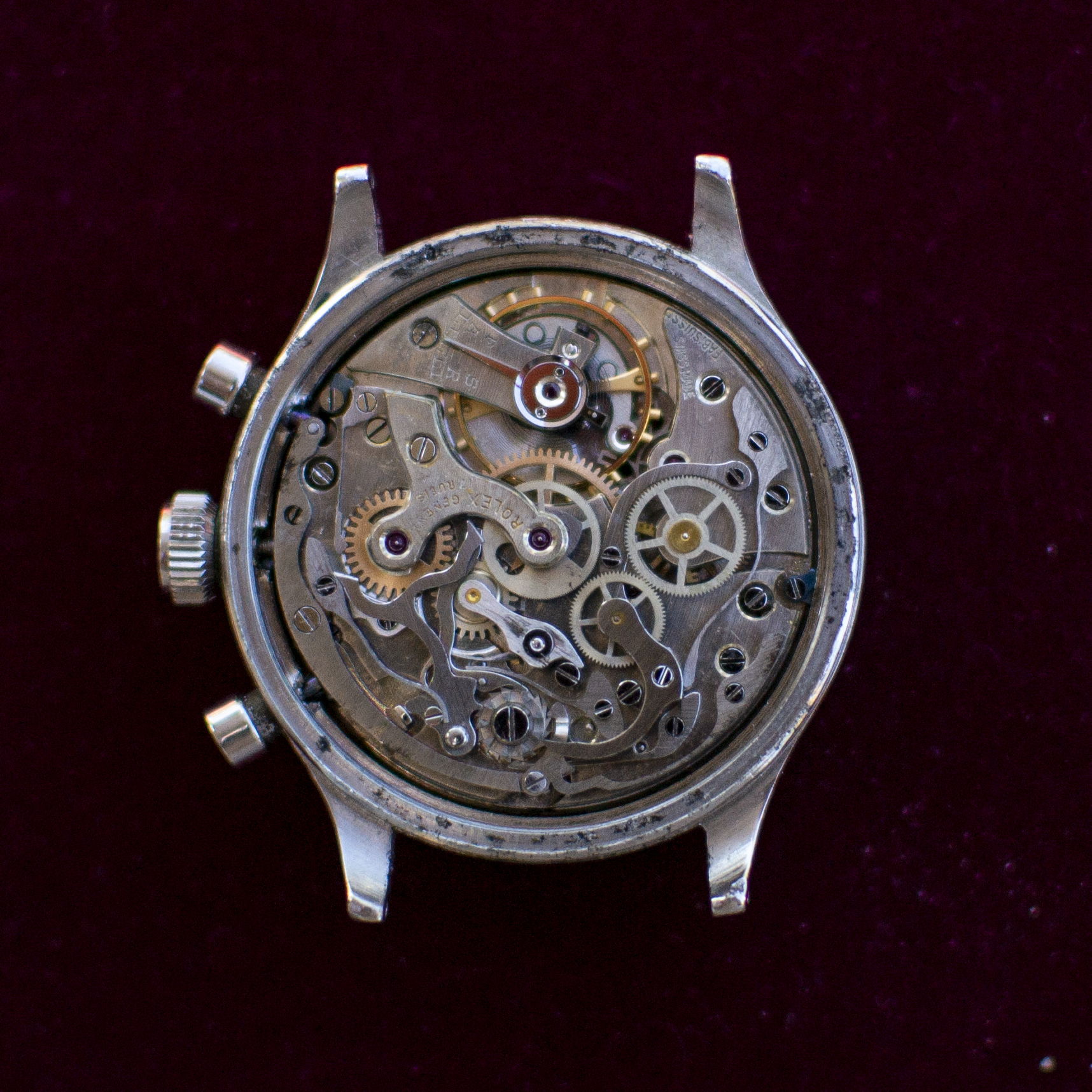 ·I've been provided a really interesting opportunity to examine a 1940's Rolex chronograph. The history is brief and coming to me second hand. It was a watch gifted to the original owner in the mid-twentieth century by the King of Belgium for his work for one of the government ministries. On his passing, his son took ownership and kept it in safe. As far as I can tell from the case back markings, it hasn't been touched since the 90's. I've been soliciting information on VRF and through my network of wis. At this point I feel fairly confident of the watch: