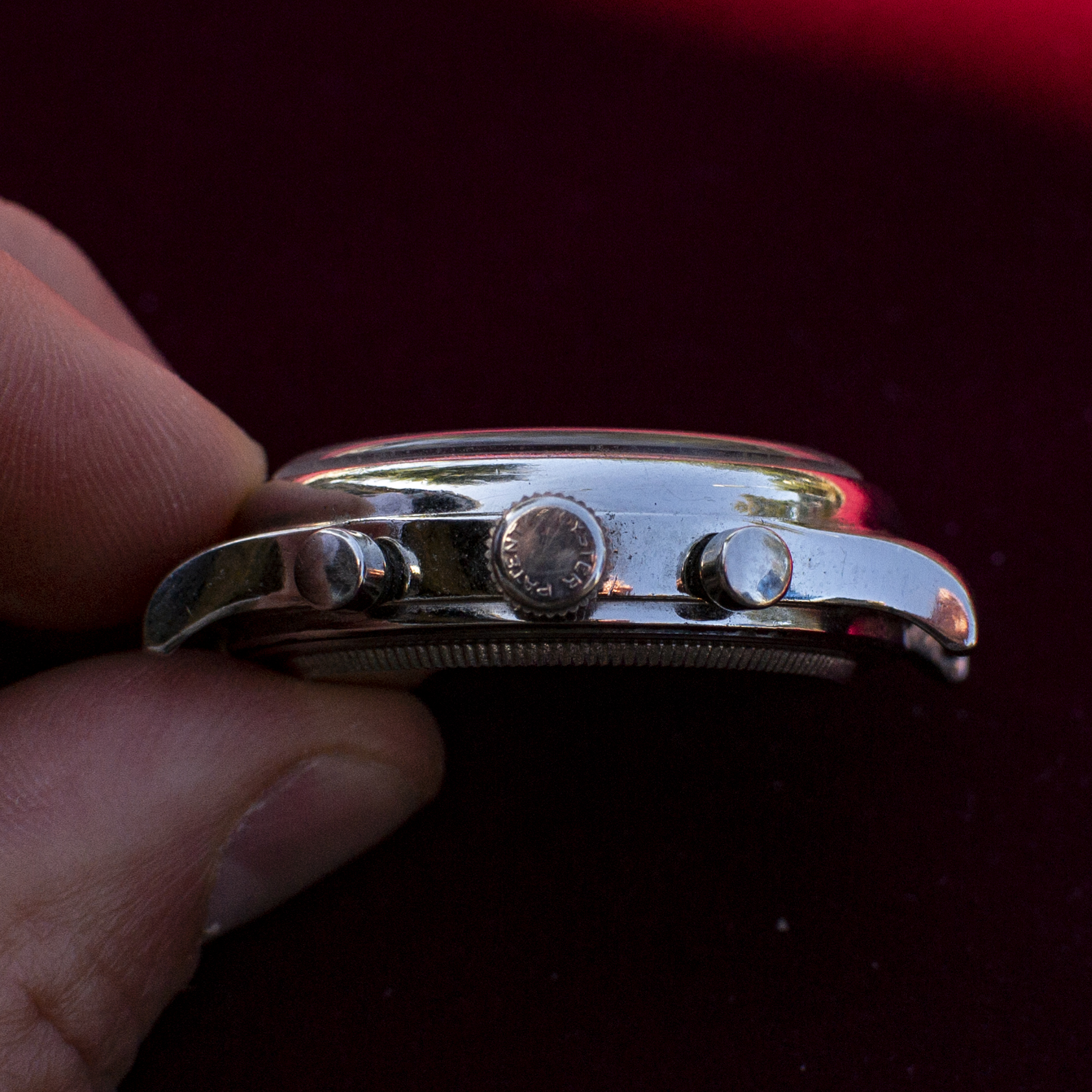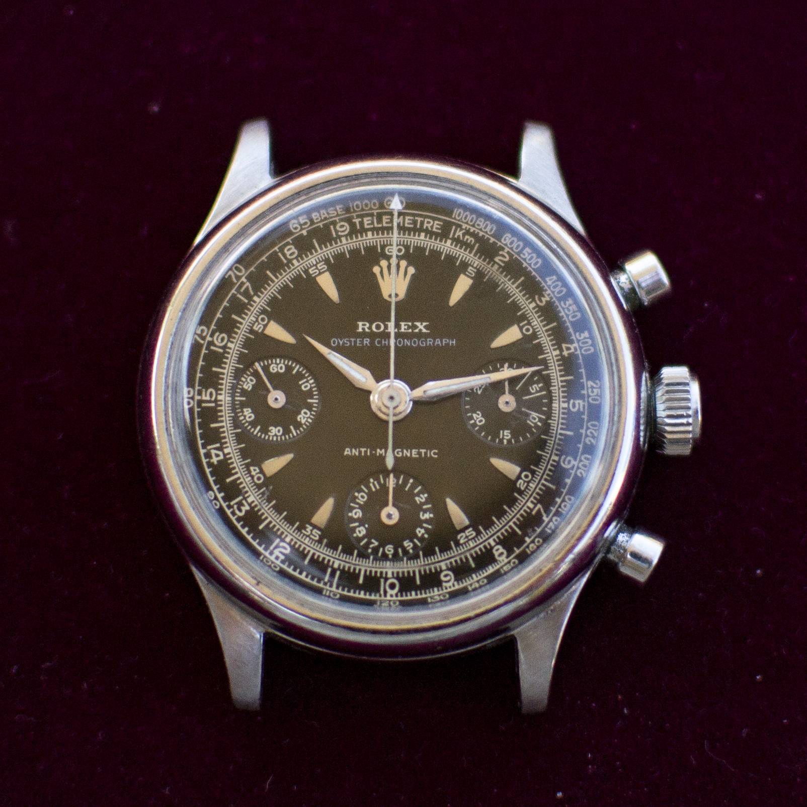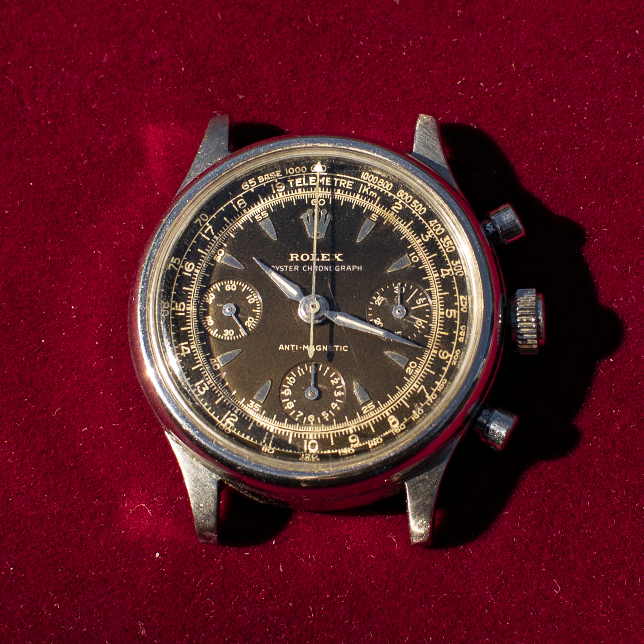 ·I've been provided a really interesting opportunity to examine a 1940's Rolex chronograph. The history is brief and coming to me second hand. It was a watch gifted to the original owner in the mid-twentieth century by the King of Belgium for his work for one of the government ministries. On his passing, his son took ownership and kept it in safe. As far as I can tell from the case back markings, it hasn't been touched since the 90's. I've been soliciting information on VRF and through my network of wis. At this point I feel fairly confident of the watch: