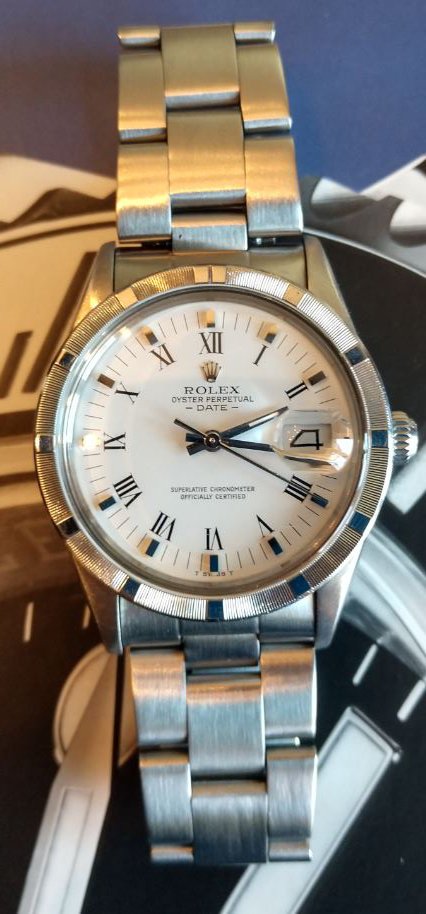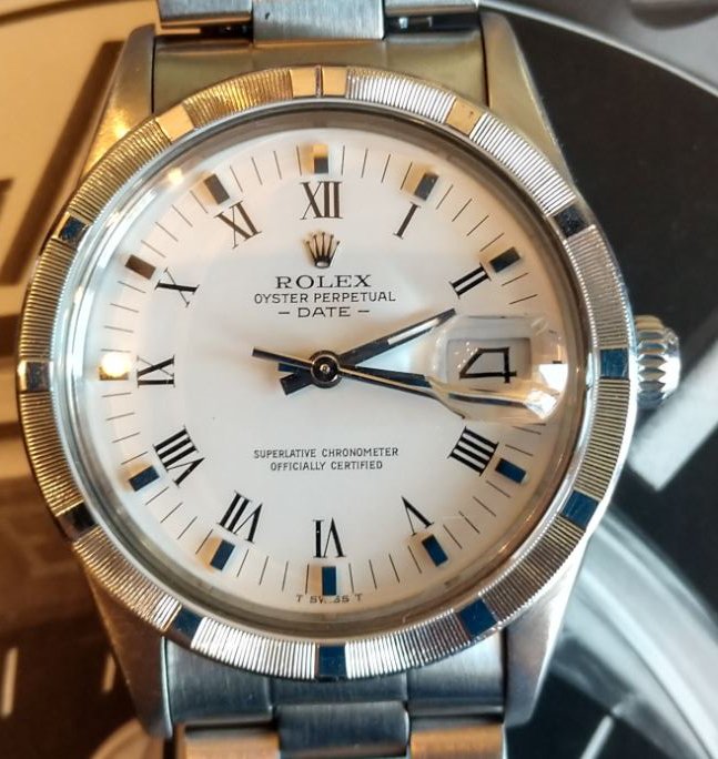 ·For sale or trade is a stunning white face Rolex Oyster Perpetual Date, 34mm. It features an engine-turned bezel, white face, roman numerals, Rolex bracelet fits up to 7”, and includes two Rolex clasps.
