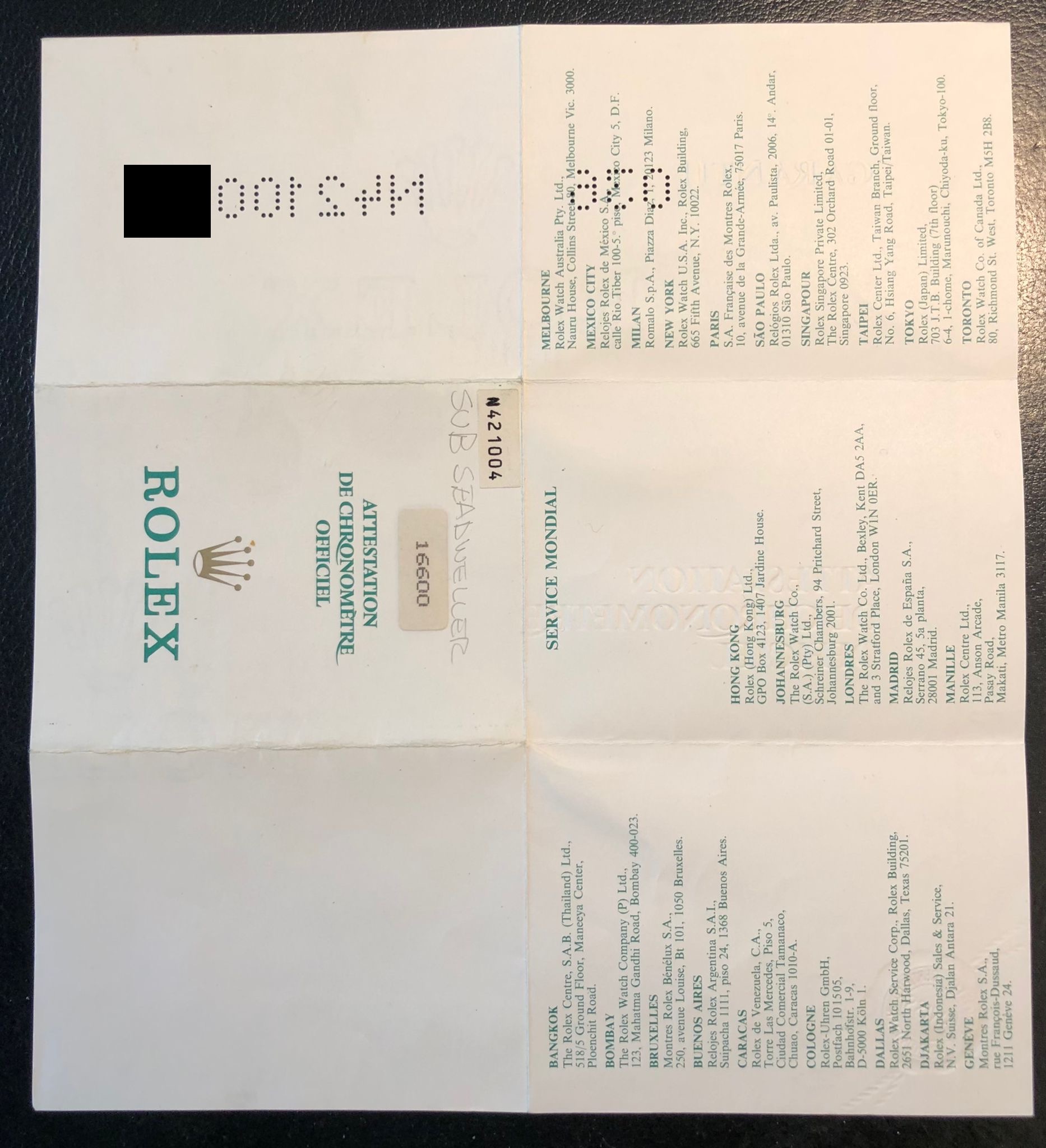 The watch comes with the complete full set: original Rolex box (inner/outer) with sticker, the Rolex warranty certificate, the Rolex warranty holder, the Rolex translation booklet, the Rolex calendar, the Rolex booklets ('Your Rolex Oyster' and 'Rolex Submariner'), Rolex Anchor, Rolex Sea-Dweller toolkit, Rolex tag.