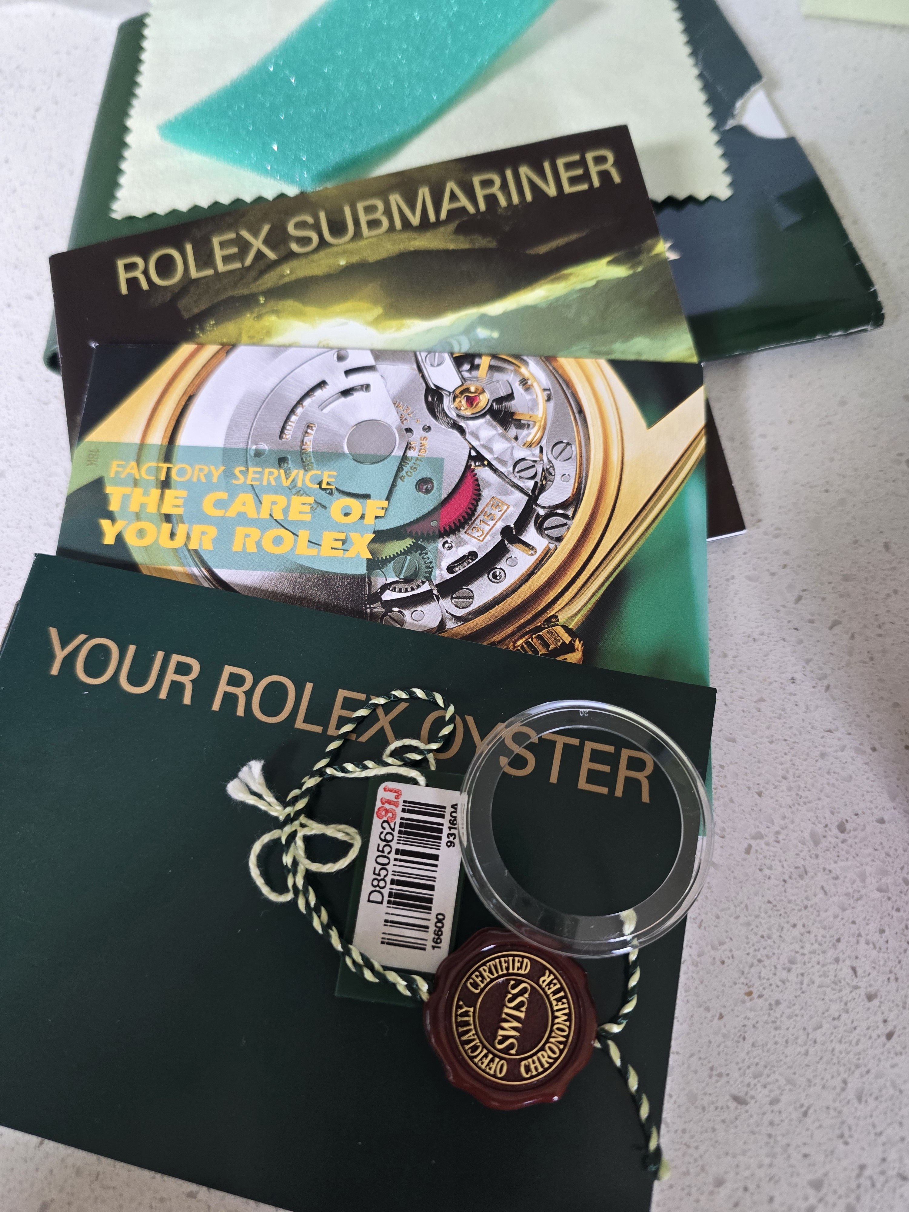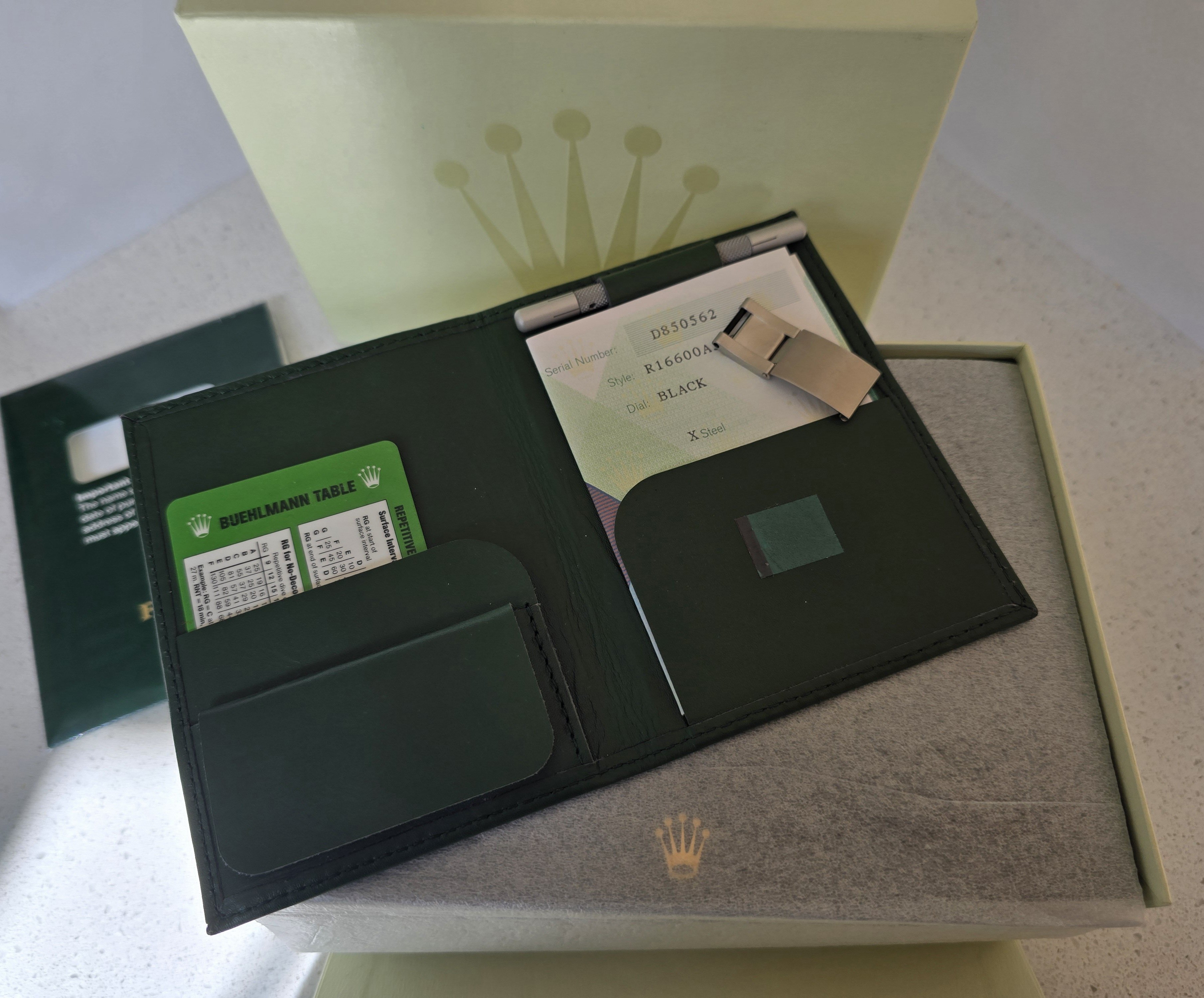 Inner and outer boxes, warranty certificate, booklets, bracelet tool, extra link, hang tag, bezel cover (see photos.)
