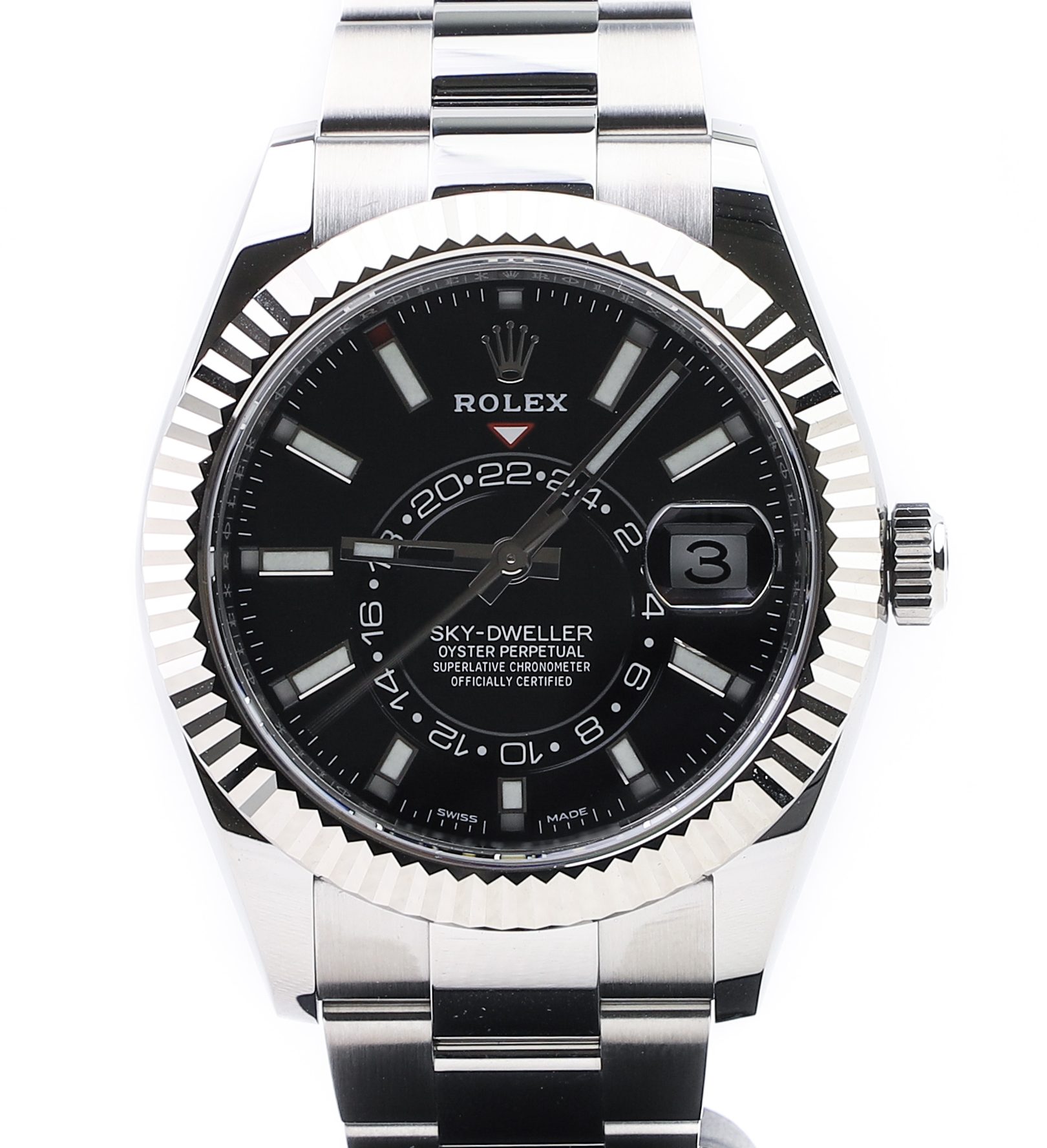 Selling a complete set Rolex Sky-Dweller 326934 Black Dial Unworn 2019 with partial factory stickers left.