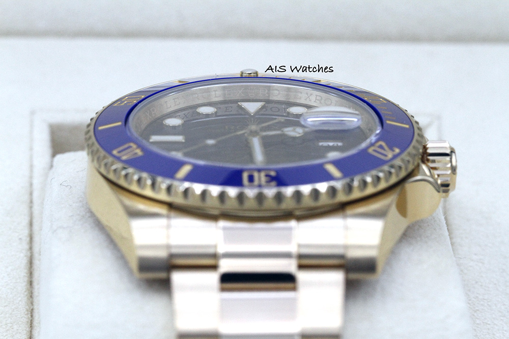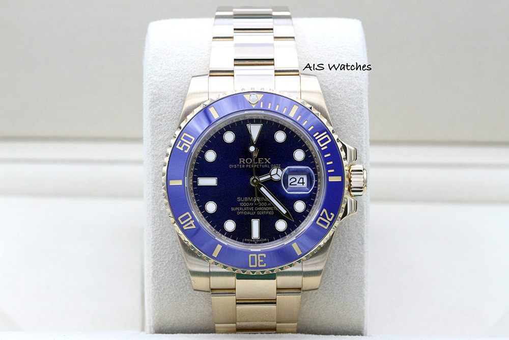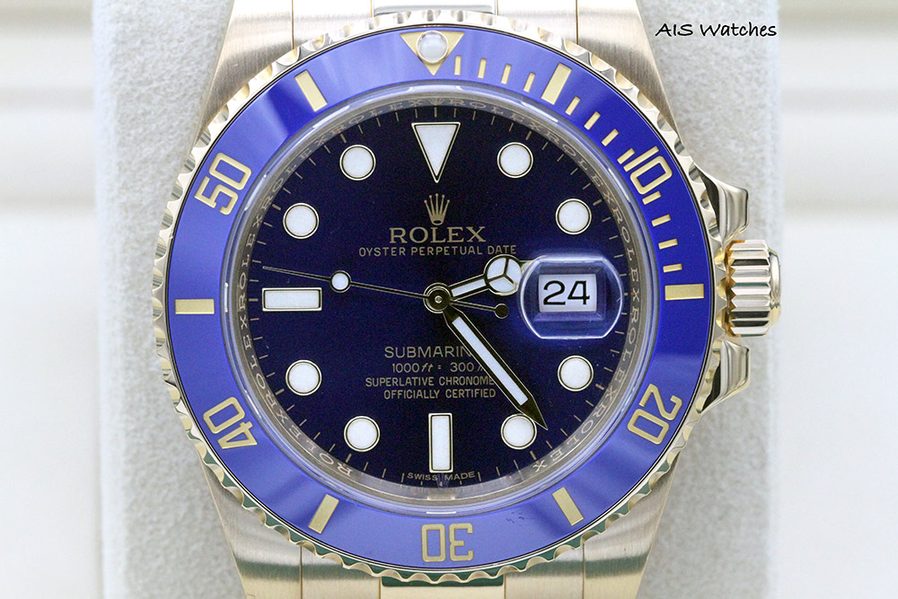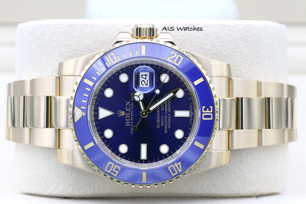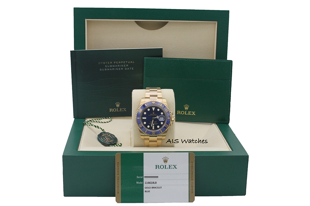 Up for sale a Rolex Submariner 116618LB Ceramic 18K Yellow Gold Sunburst Blue Dial Box & Papers. The timepiece has 11 links total and will fit a wrist size up to 8 inches. Overall the timepiece is in good condition.