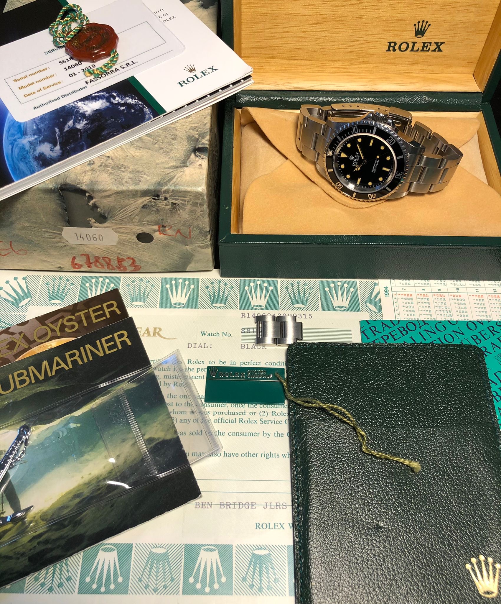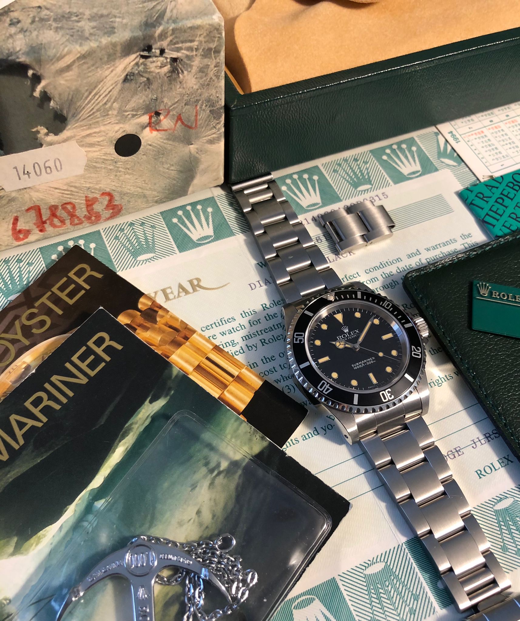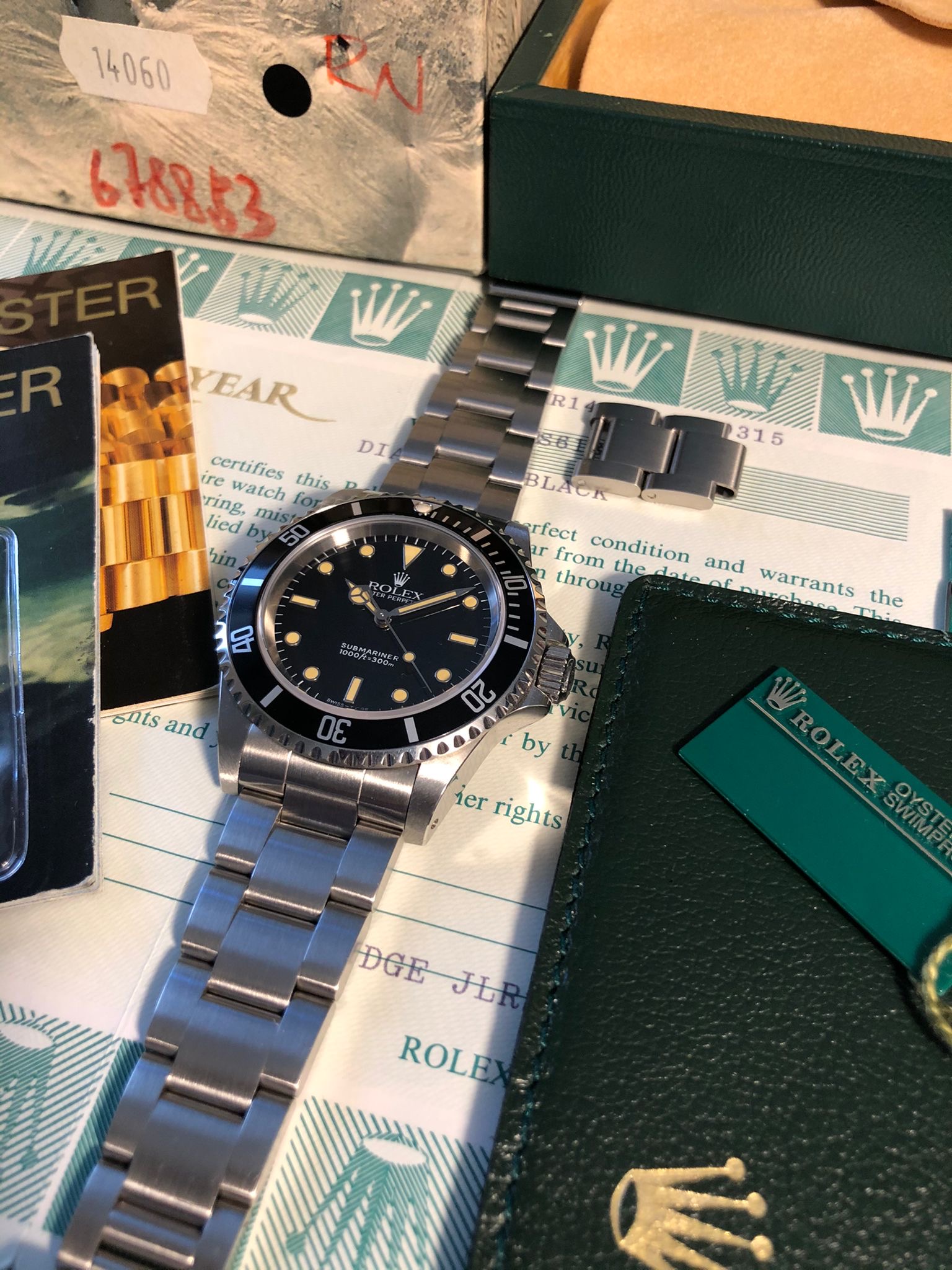 The watch comes with the full set: the original Rolex box (inner/outer), the Rolex warranty holder (green folder), the Rolex guarantee (punched papers) the Rolex calendar, the Rolex booklets ('Your Rolex Oyster' and 'Rolex Submariner'), Rolex price tag, Rolex anchor.