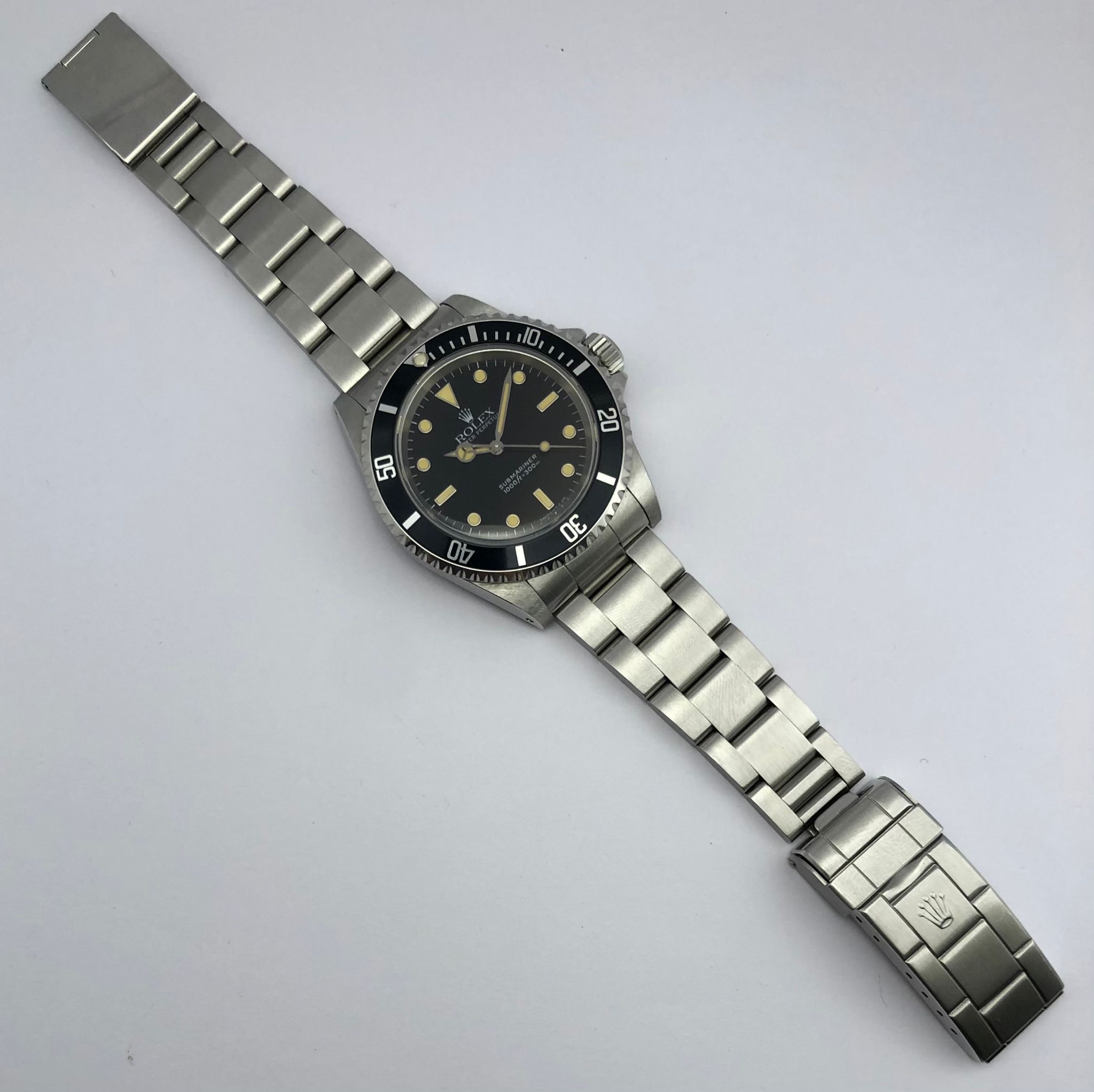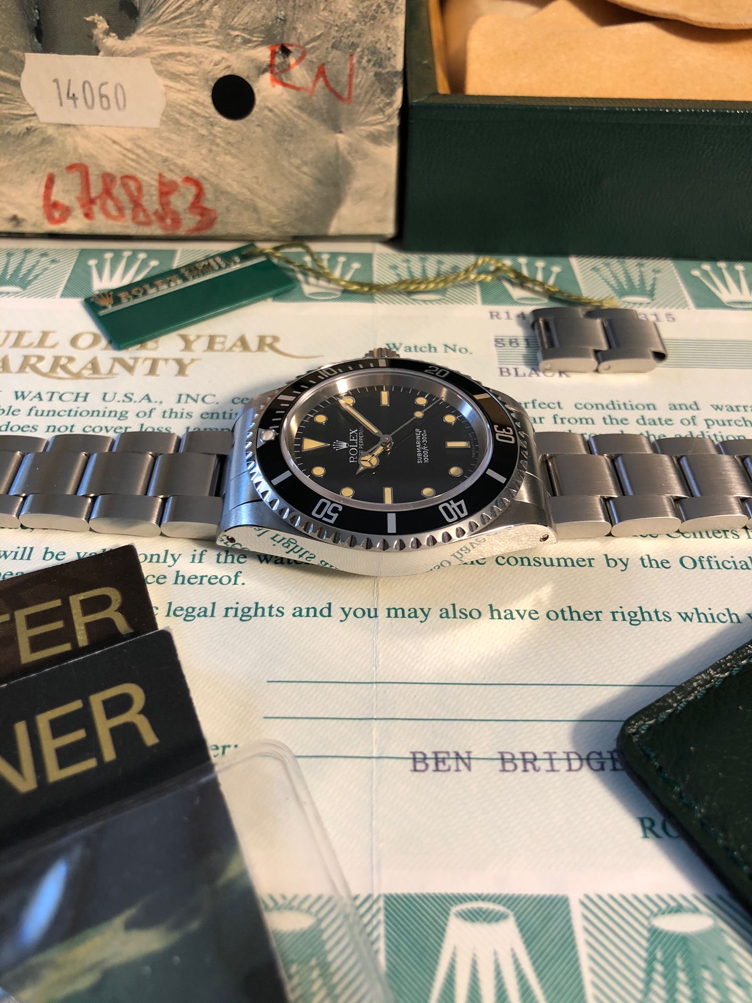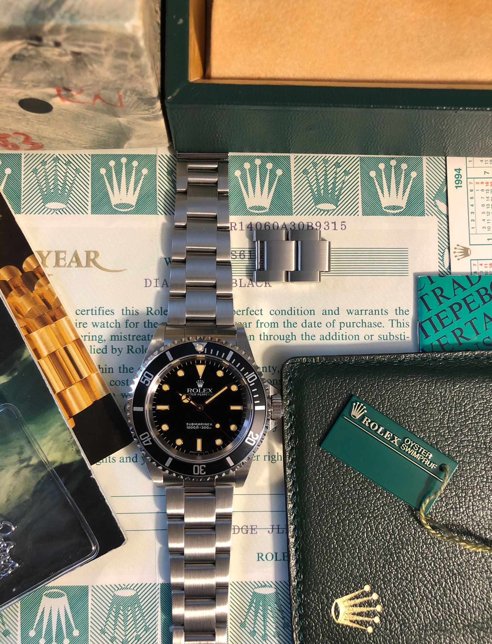 The watch comes with the full set: the original Rolex box (inner/outer), the Rolex warranty holder (green folder), the Rolex guarantee (punched papers) the Rolex calendar, the Rolex booklets ('Your Rolex Oyster' and 'Rolex Submariner'), Rolex price tag, Rolex anchor.