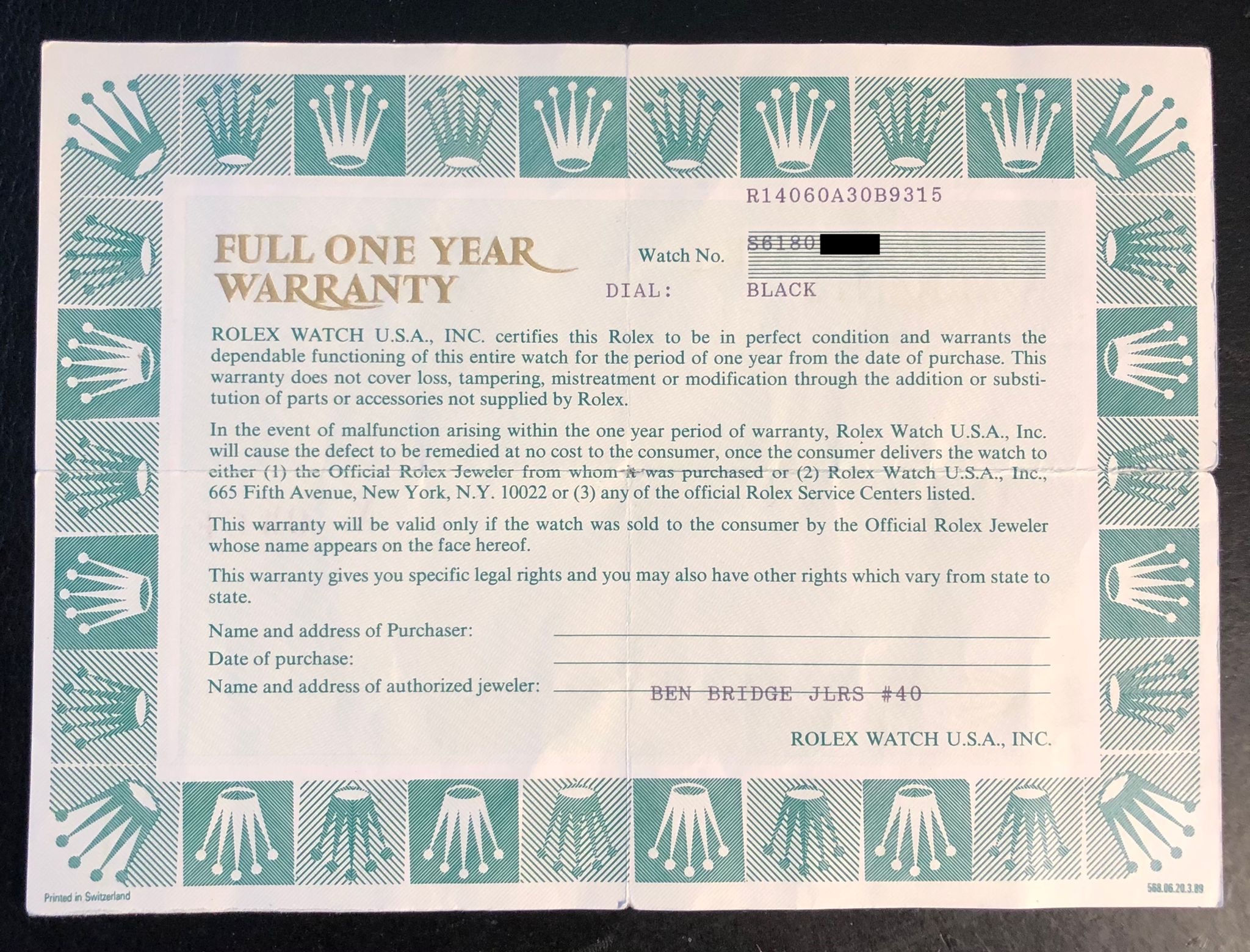 The watch was sold in 1994 in the United States by the official Rolex retailer 'Ben Bridge Jeweler' and it comes with the full set, including the original guarantee (Rolex punched papers) and the Rolex service card.