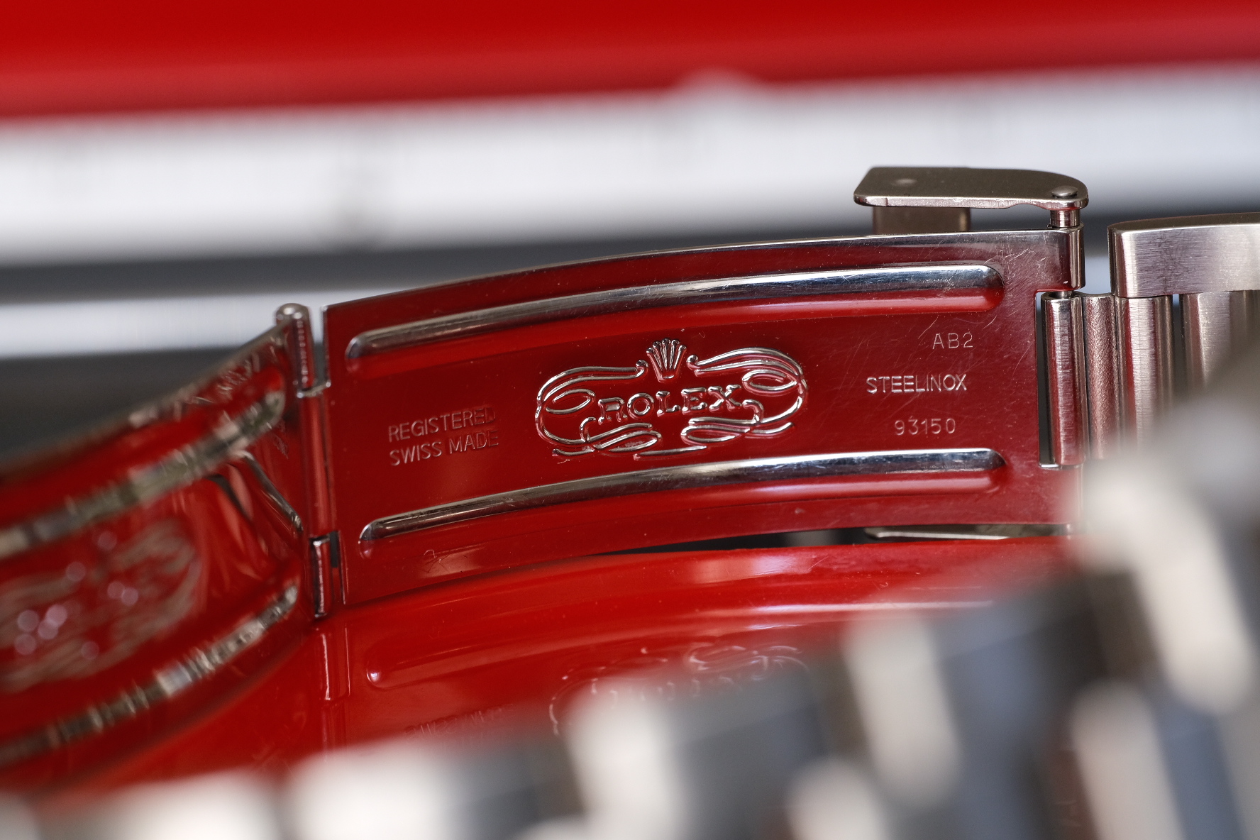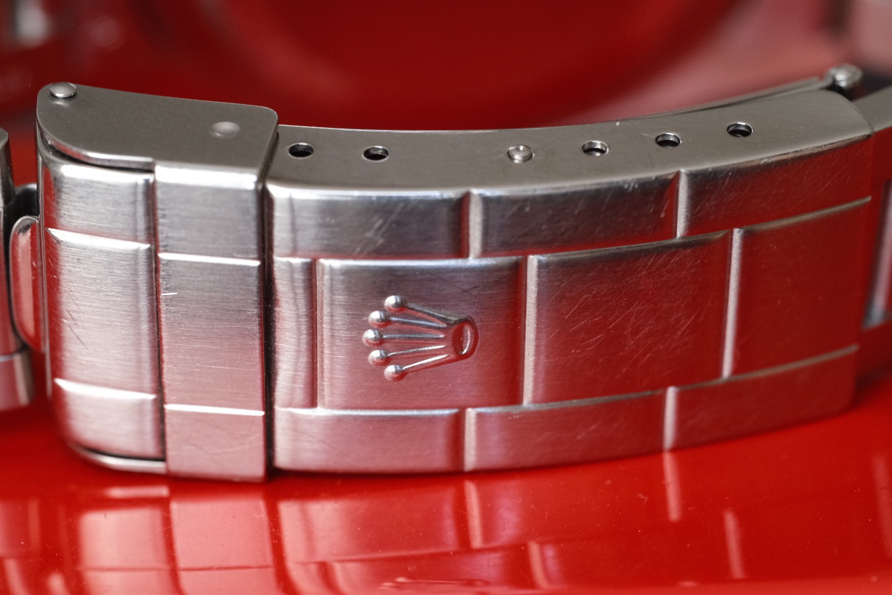 BRACELET: Original Rolex 93150 oyster bracelet with 11 links with diver extension and original 501B end links. Looks to fit up to just over a 7.5 inch wrist. Some very faint marks throughout, but even the clasp is clean and crisp!