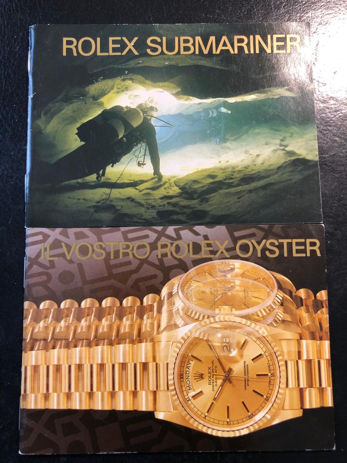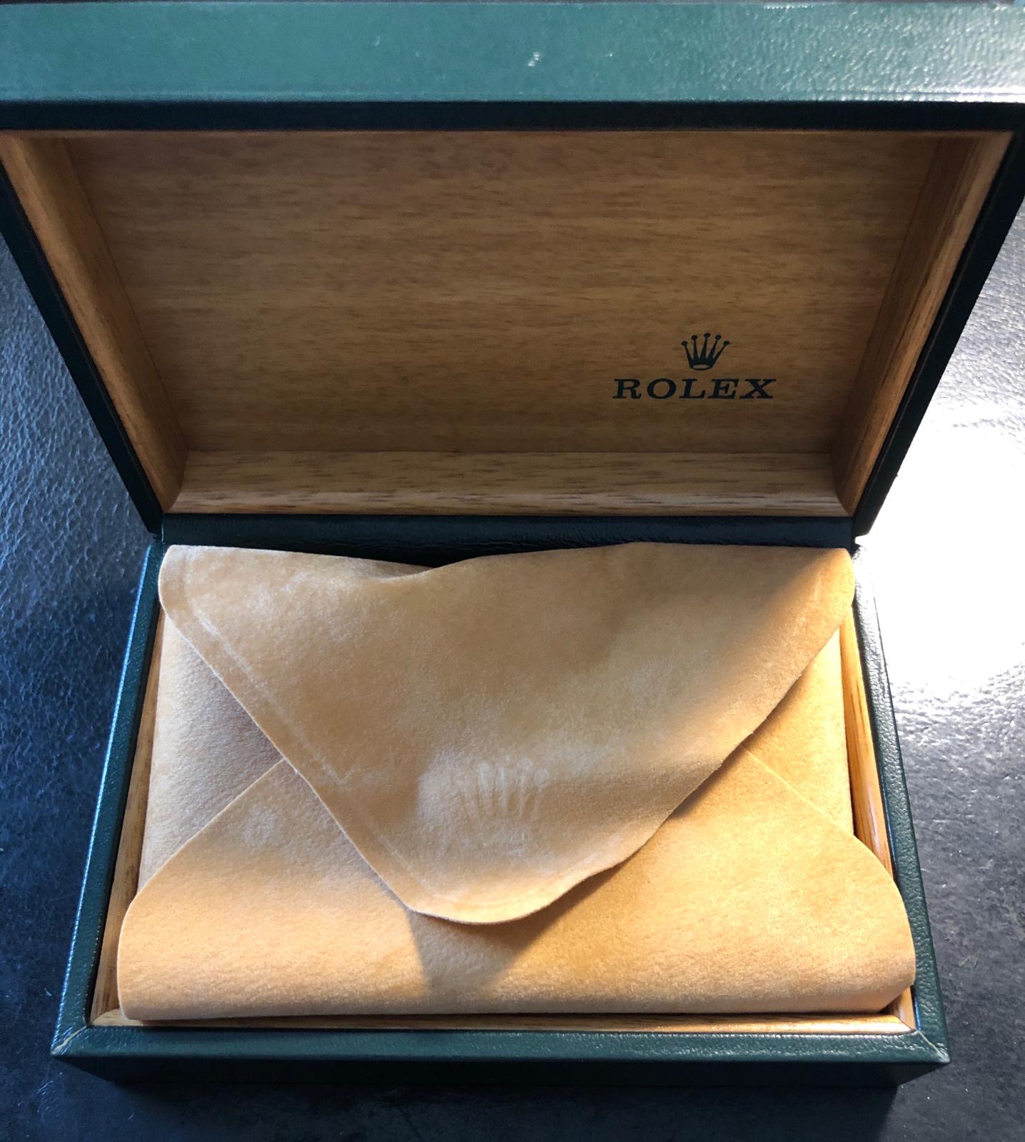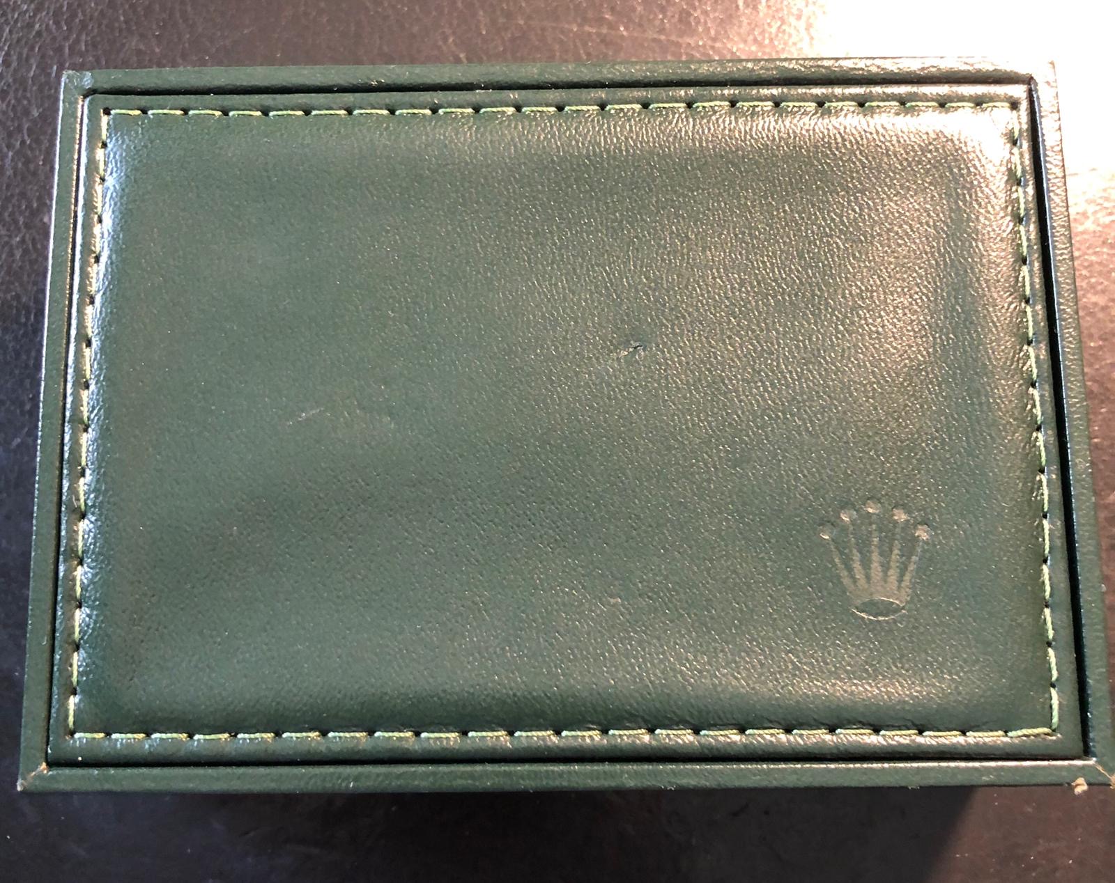 The watch comes with the full set: the original Rolex box (inner/outer), the Rolex warranty holder (green folder), the Rolex guarantee (punched papers) the Rolex calendar, the Rolex booklets ('Your Rolex Oyster' and 'Rolex Submariner'), Rolex price tag, Rolex anchor.