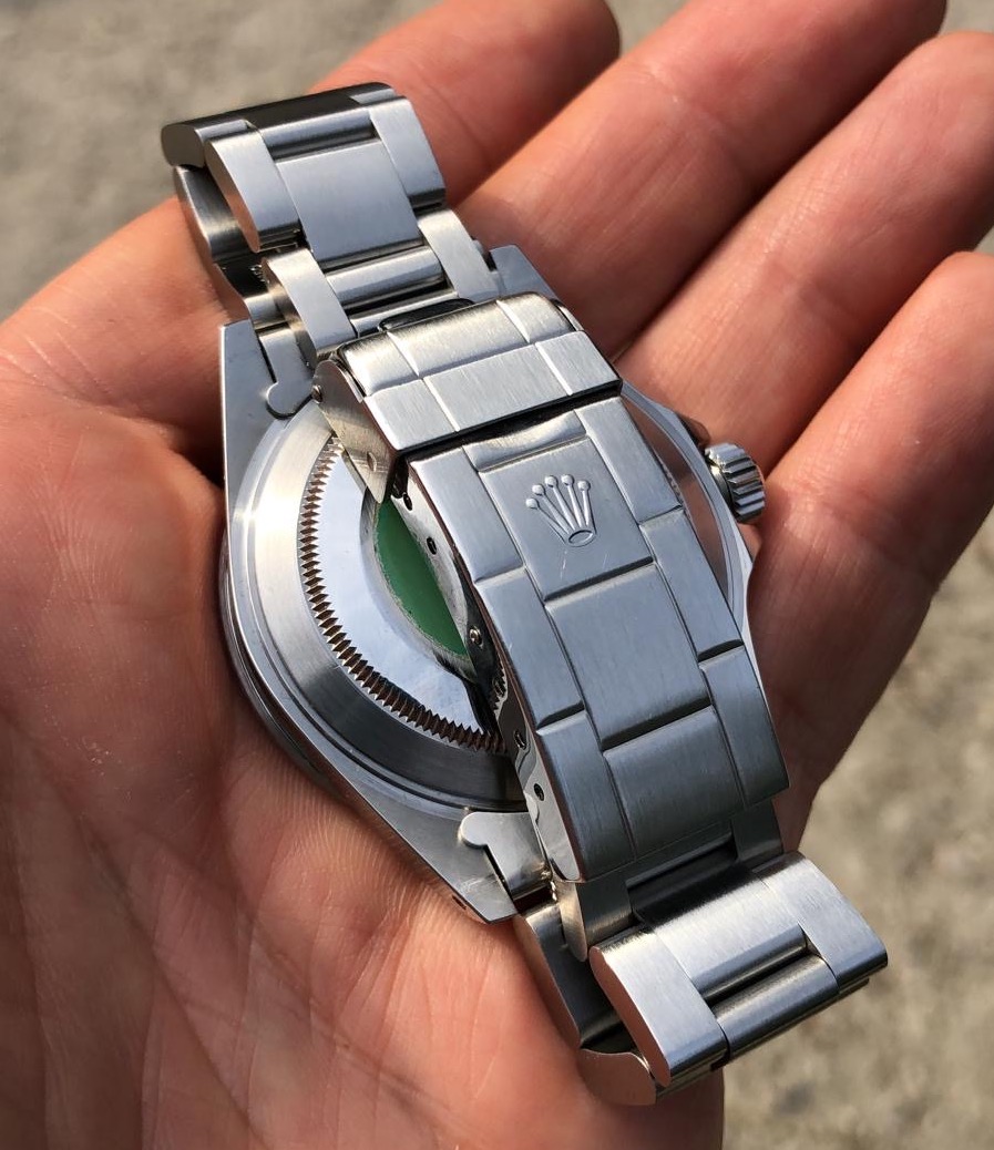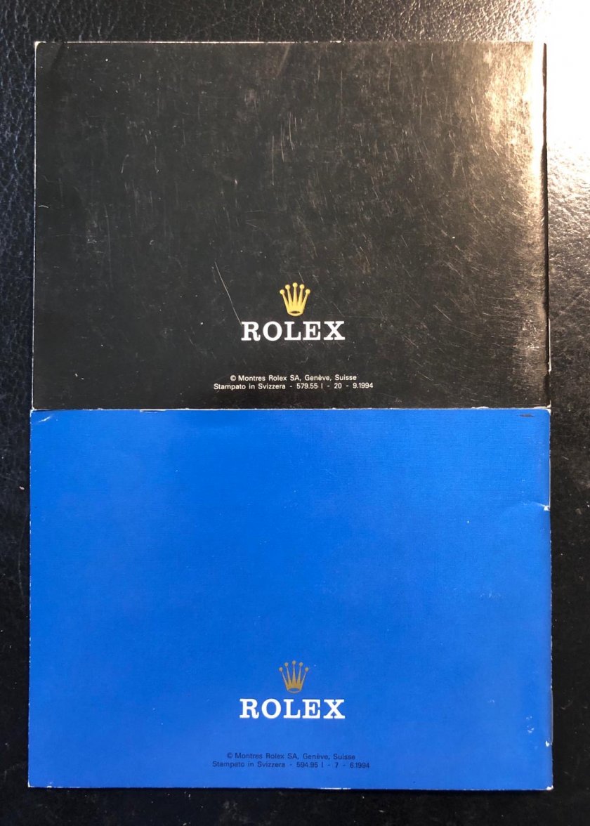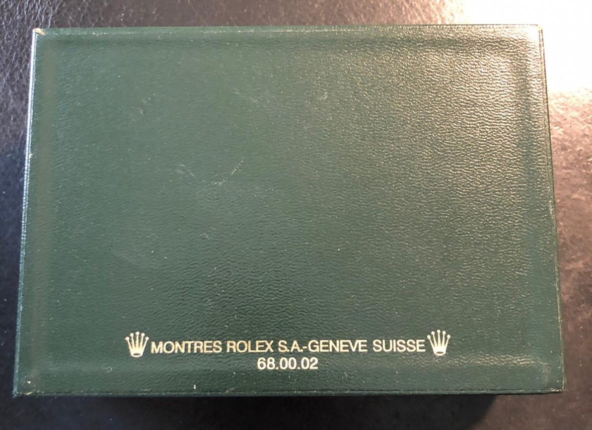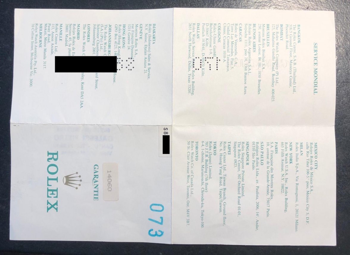 The watch comes with the full set: the original Rolex box (inner/outer), the Rolex warranty holder (green folder), the Rolex guarantee (punched papers) the Rolex calendar, the Rolex booklets ('Your Rolex Oyster' and 'Rolex Submariner'), Rolex price tag, Rolex anchor.