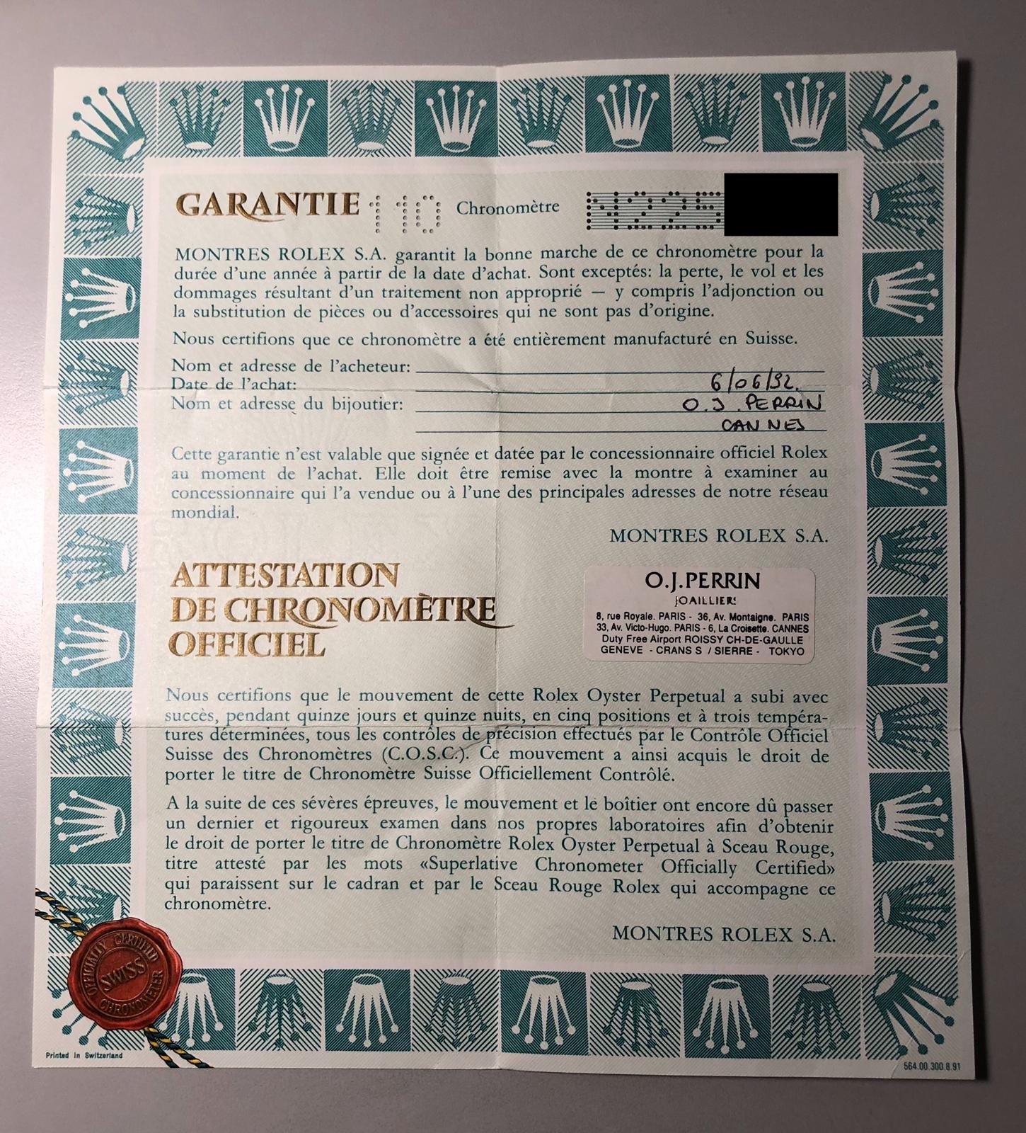 The watch was sold in Cannes in 1992 and it comes with box and papers.