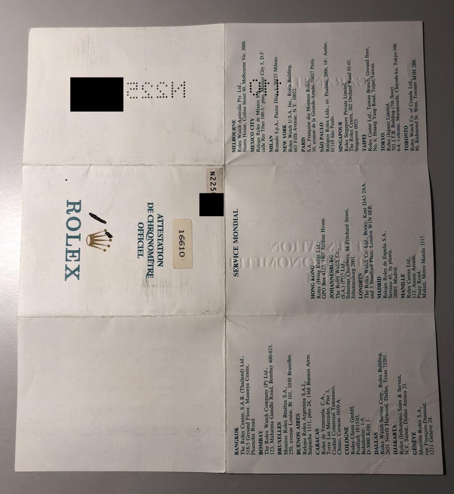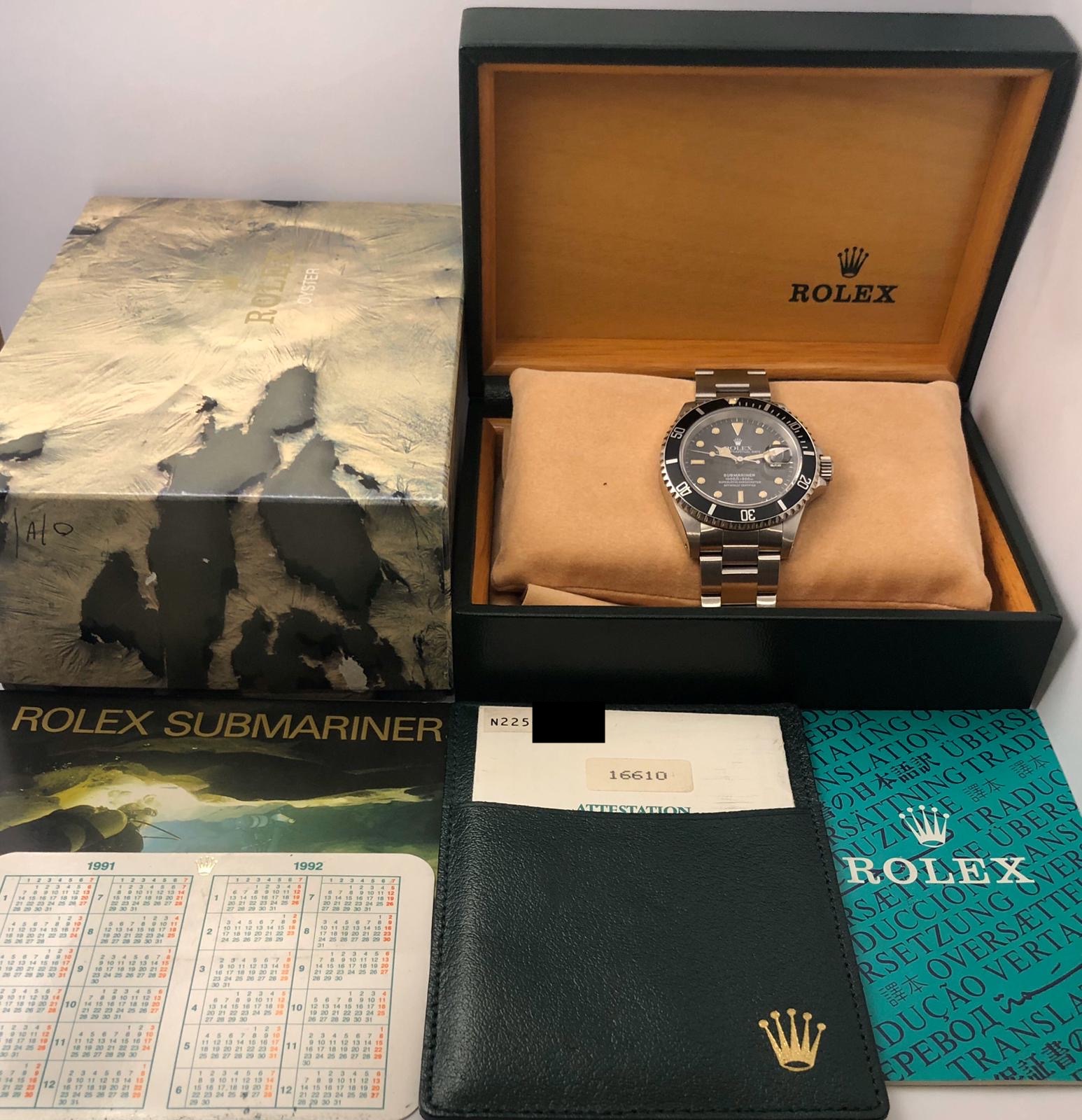 The watch comes with the full set: original Rolex box (inner/outer), the Rolex warranty certificate, the Rolex warranty holder, the Rolex translation booklet, the Rolex calendar, the Rolex booklet.
