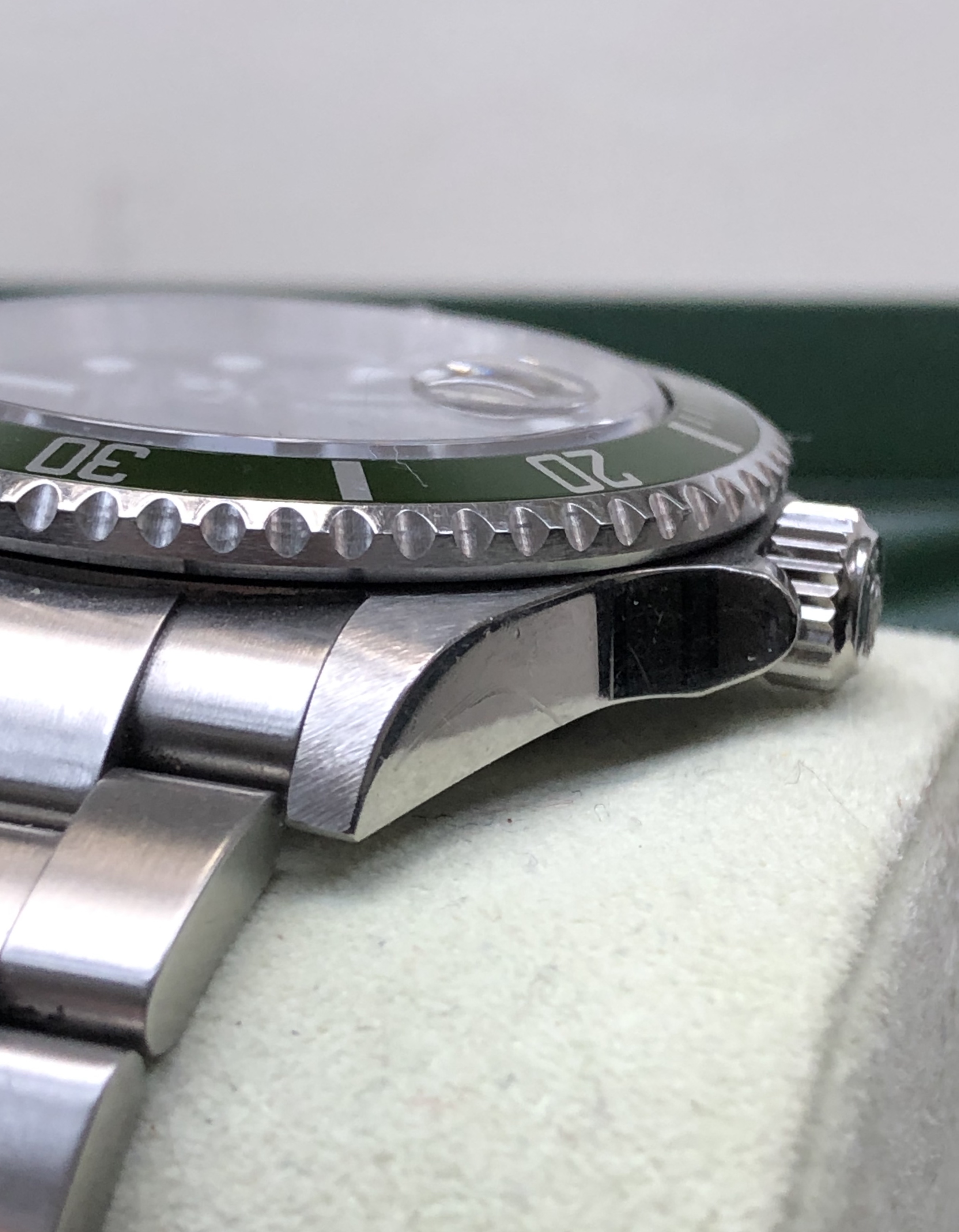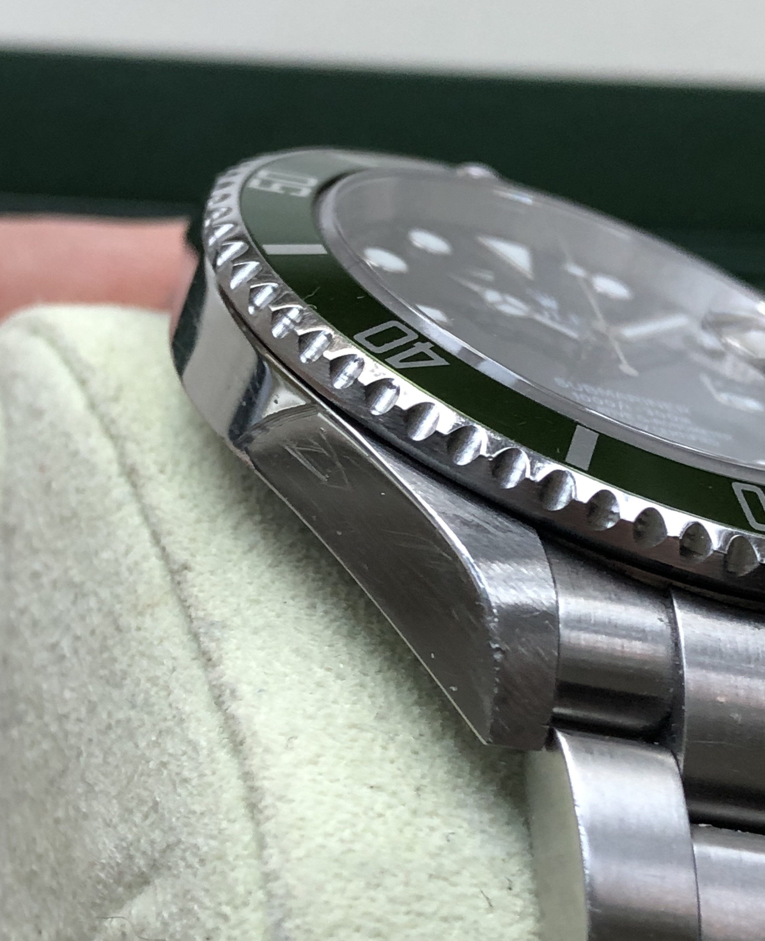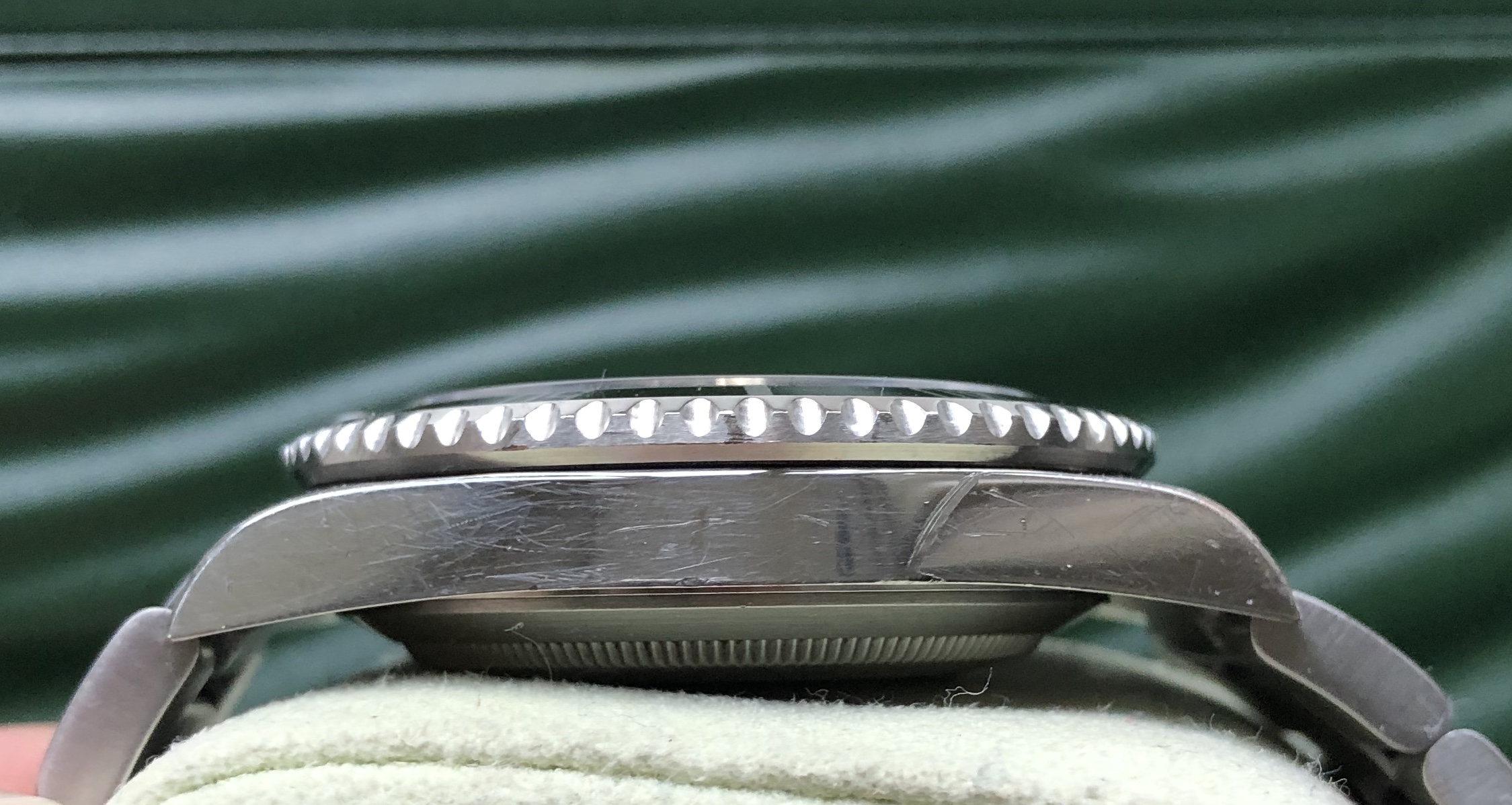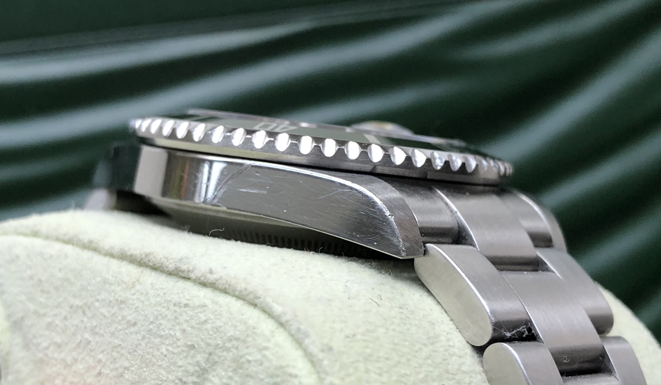 Case: Super fat crown guards and lugs with sharp case lines, appears to be unpolished. There are two scratches as pictured that could easily be laser welded and polished without impacting the crown guards.