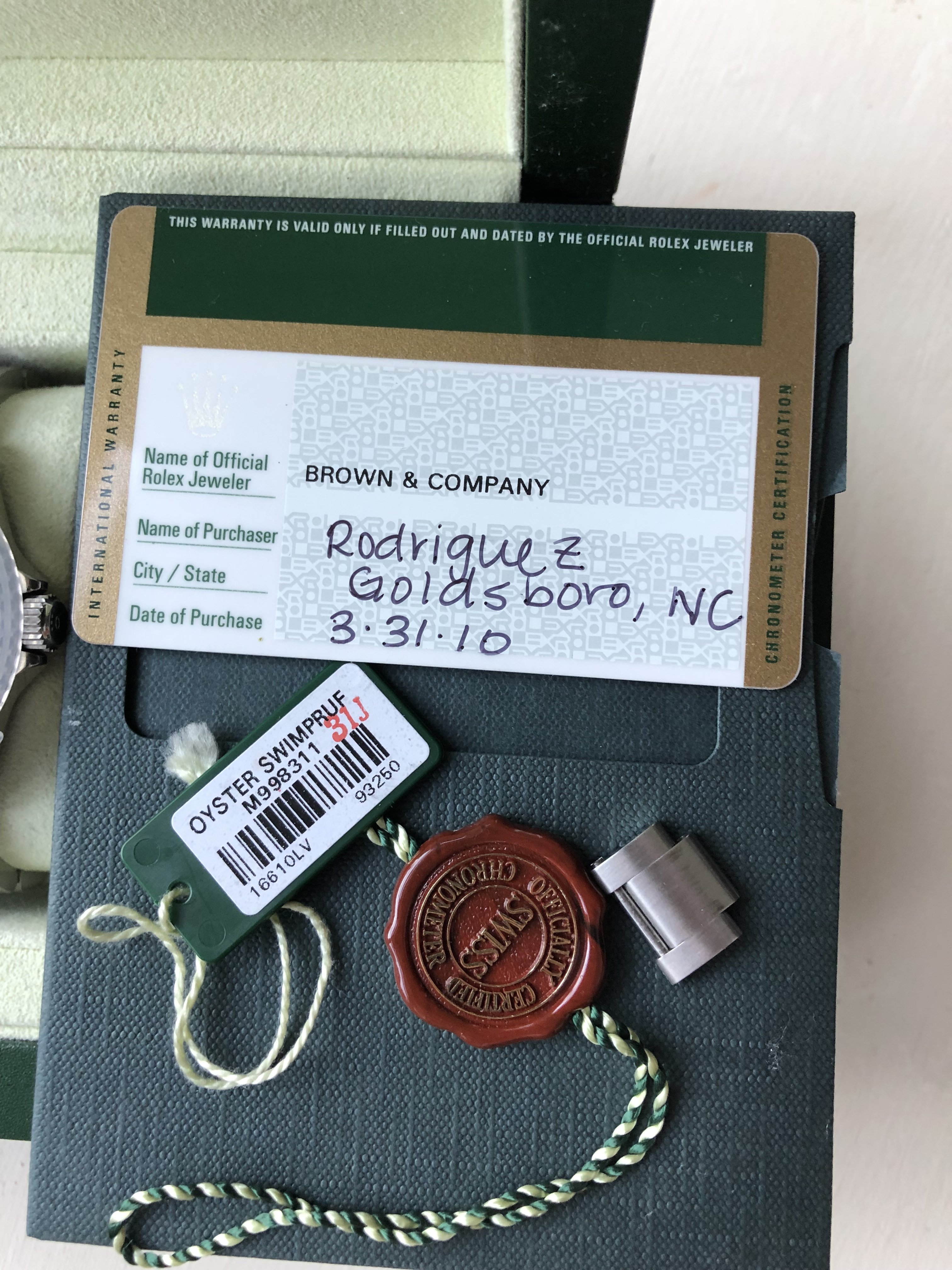 Boxes/Paperwork: Correct inner box. Warranty card from AD and warranty booklet, hang tag with matching serial, and wax chronometer seal.