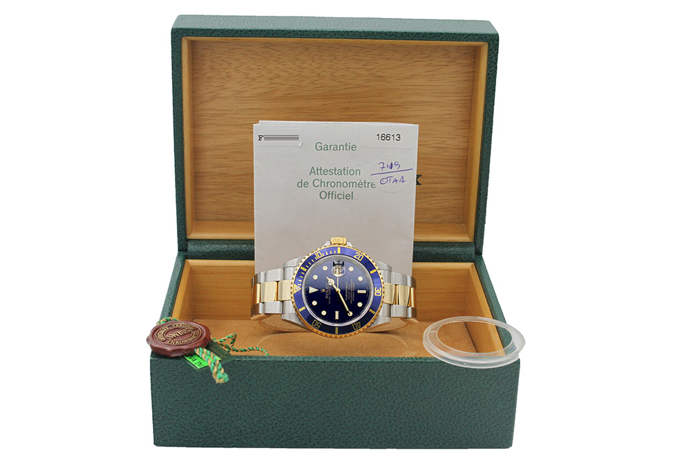 Up for sale is a Rolex Submariner 16613 F Serial Blue Dial Box & Papers. The watch is in good condition with minimal bracelet stretch
