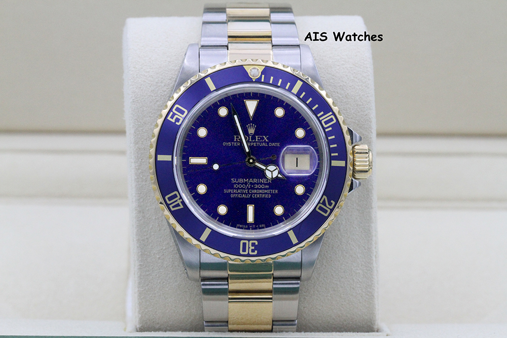 Up for sale is a Rolex Submariner 16803 18K/SS Blue Dial R Serial Recent RSC Serviced (Under RSC Warranty) - 6 and open 9 date wheel and bracelet had minimal stretch. The timepiece is in excellent condition.