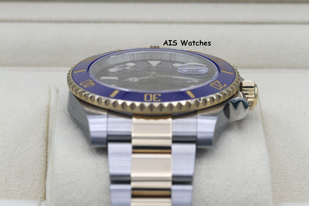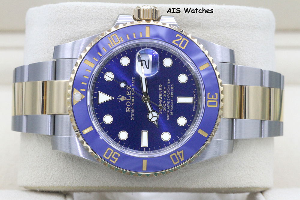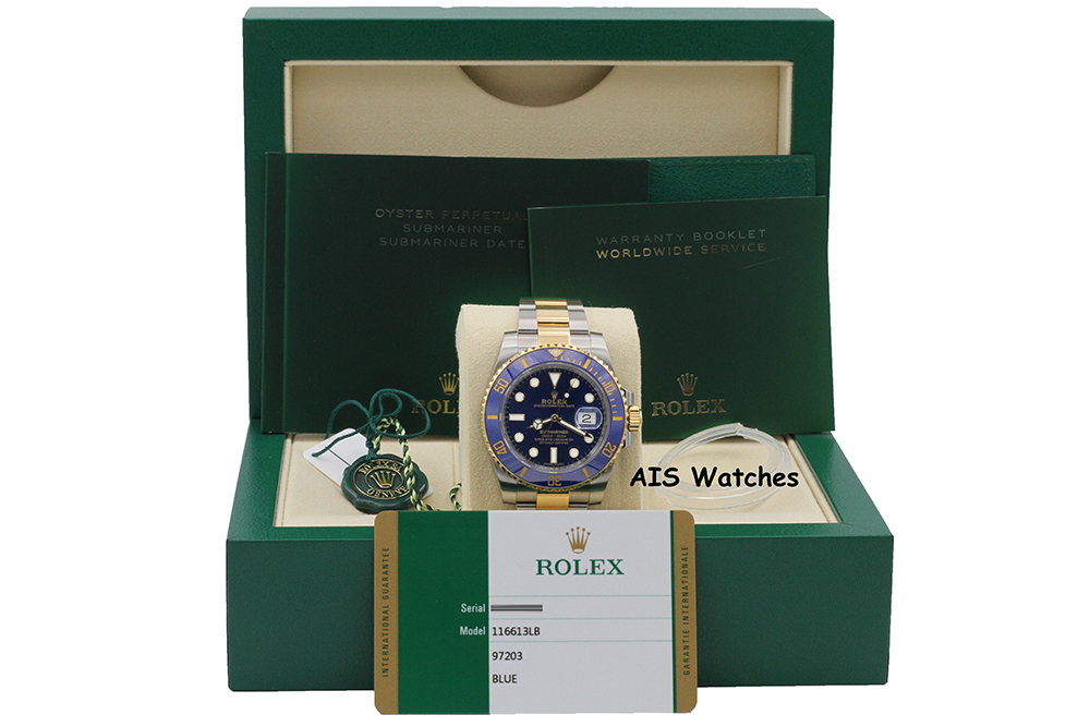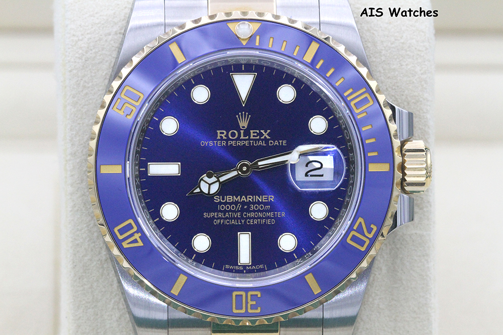 Up for sale is a Submariner Two Tone 116613 40MM Sunburst Blue Dial with Ceramic Bezel and Random Serial Box & Papers. The timepiece is in excellent condition.