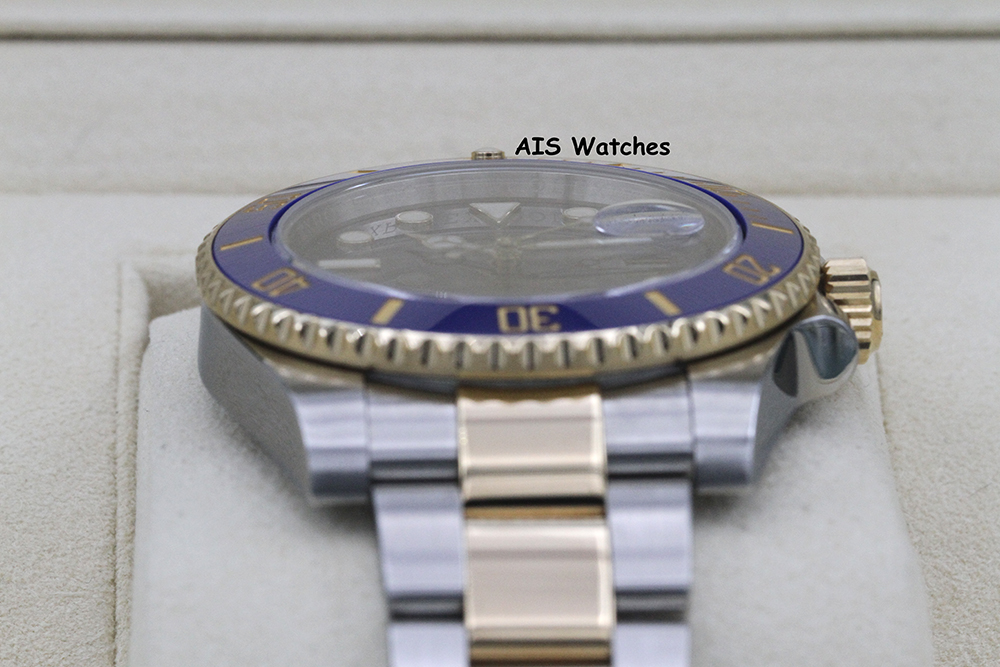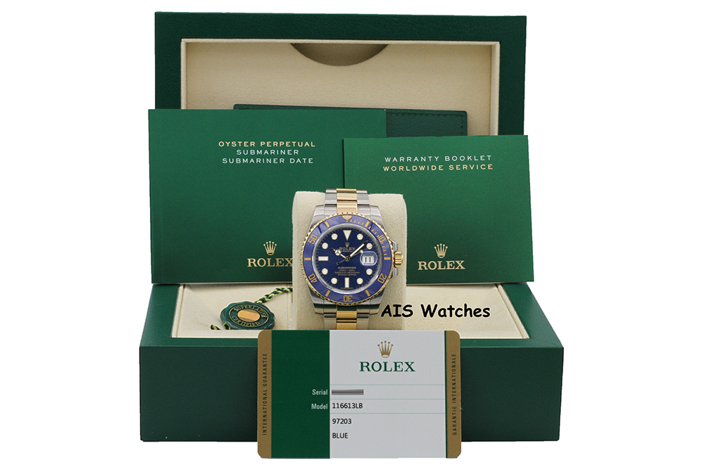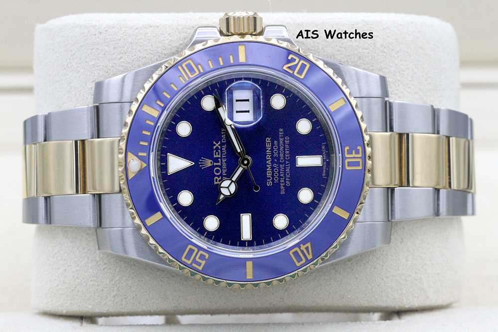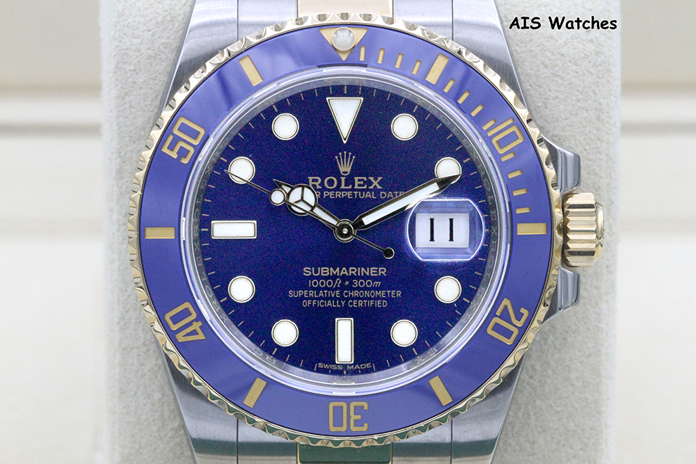Up for sale is a Submariner Two Tone 116613 40MM Sunburst Blue Dial with Ceramic Bezel and Random Serial Box & Papers. The timepiece is in excellent condition.
