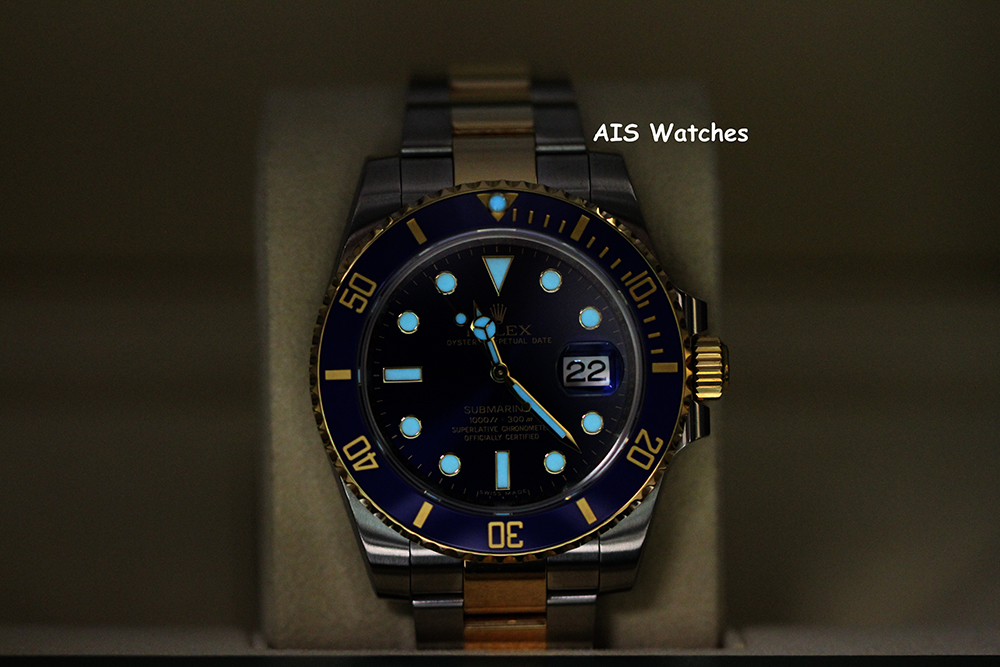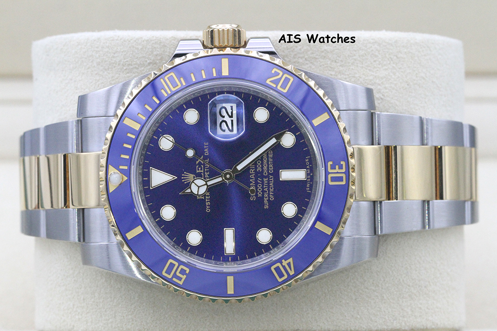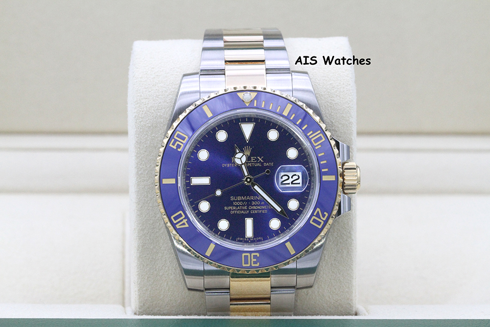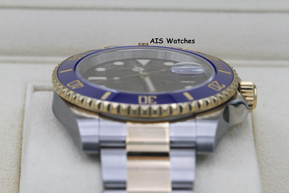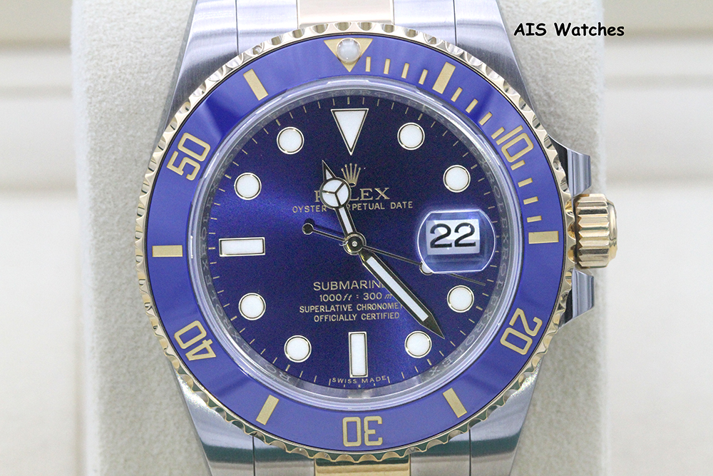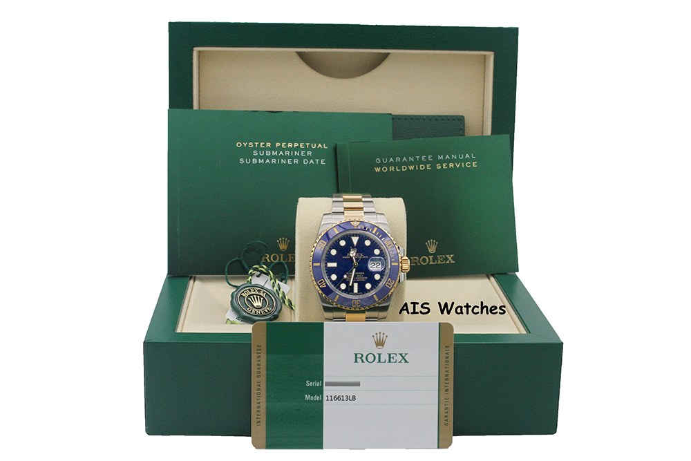 Up for sale is a Submariner Two Tone 116613 40MM Sunburst Blue Dial with Ceramic Bezel and Random Serial Box & Papers. The timepiece is in excellent condition.
