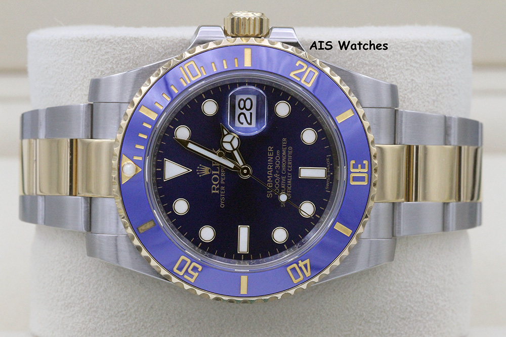 Up for sale is a Submariner Two Tone 116613 Sunburst Blue Dial with Ceramic Bezel and Random Serial Box & Papers. The timepiece is in excellent condition.